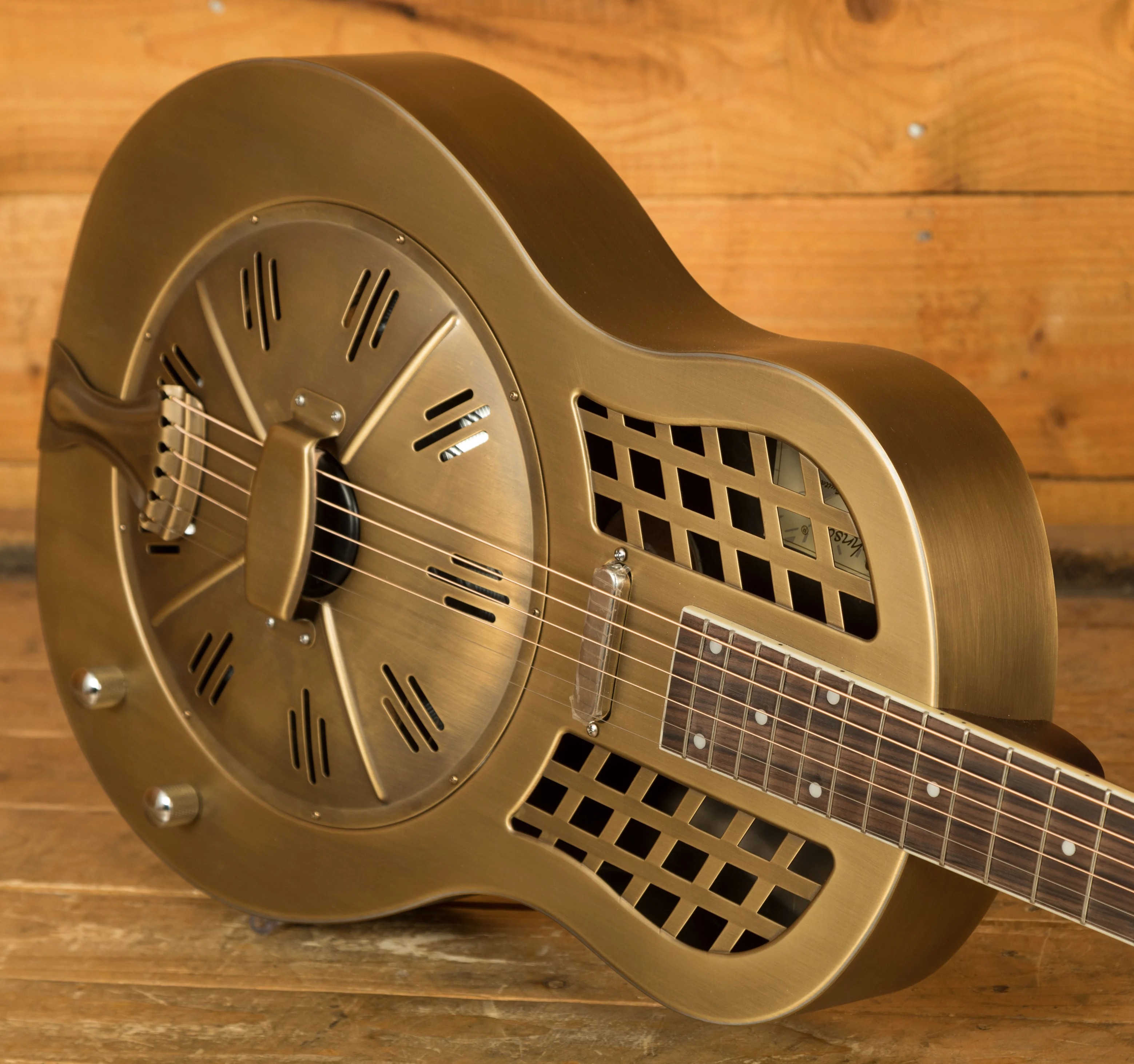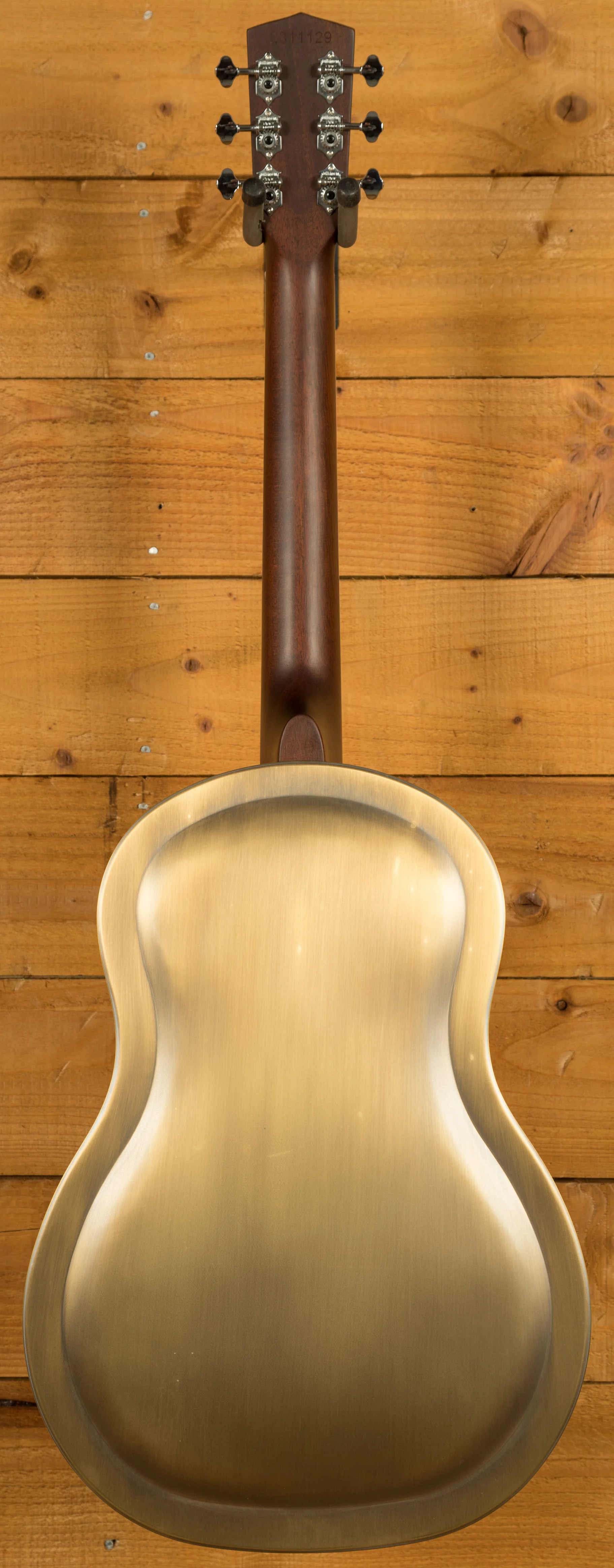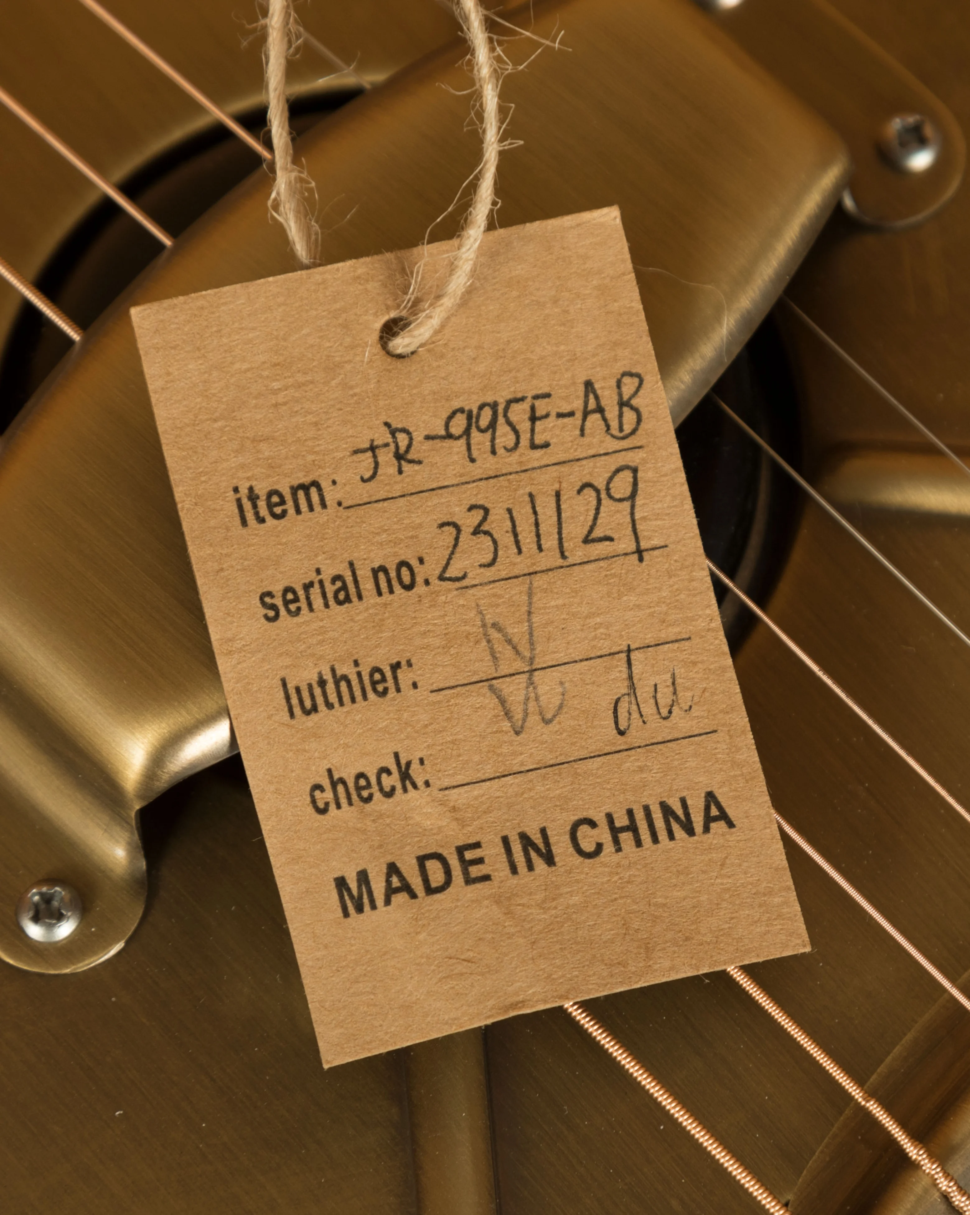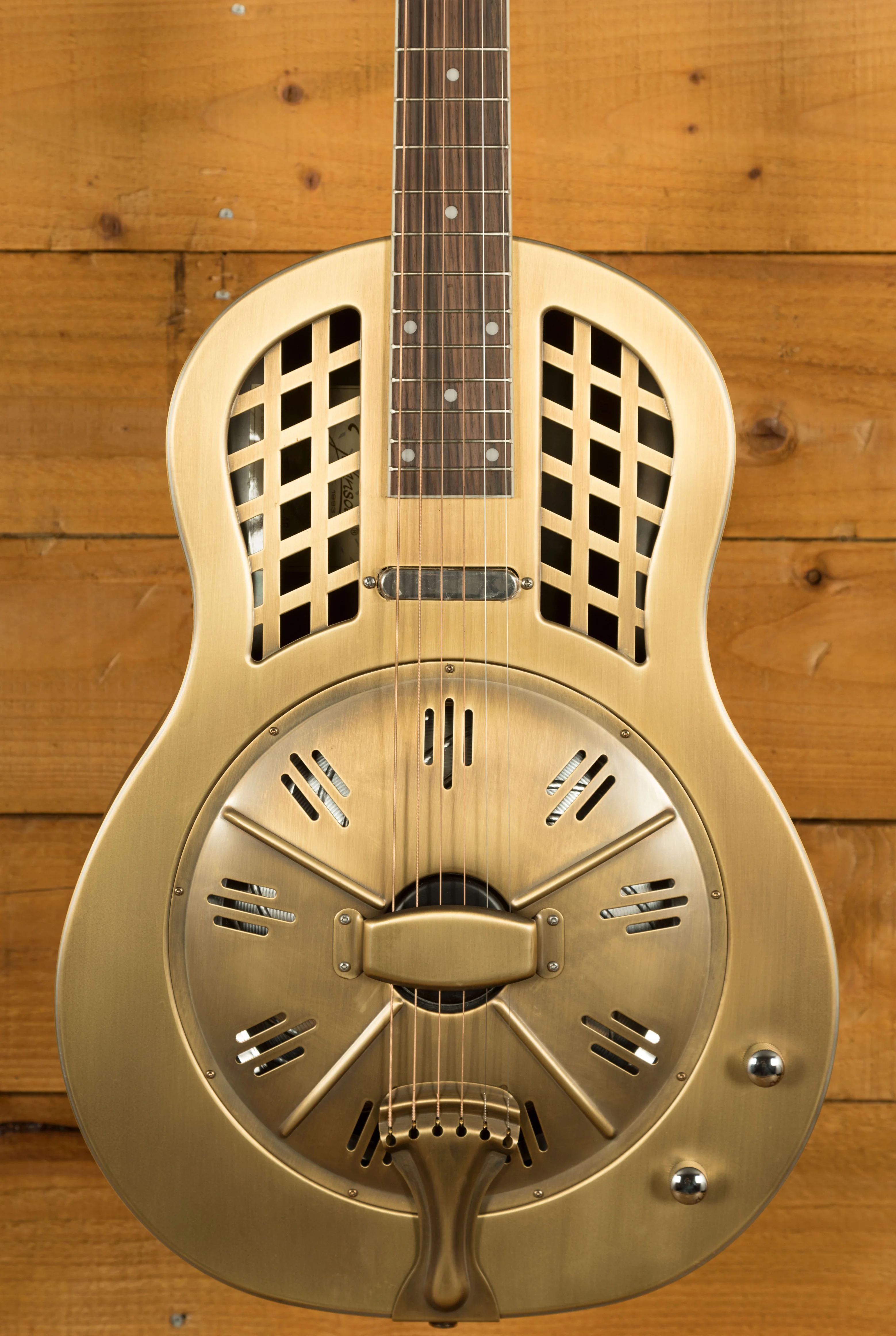 The brass body of the Johnson 995 offers a rich, warm tone with a pronounced midrange. This material choice provides a slightly mellower sound compared to steel-bodied resonators but still retains the bold projection and signature tone that resonator guitars are known for. The brass construction also contributes to the instrument's durability, ensuring it can withstand the demands of frequent play.