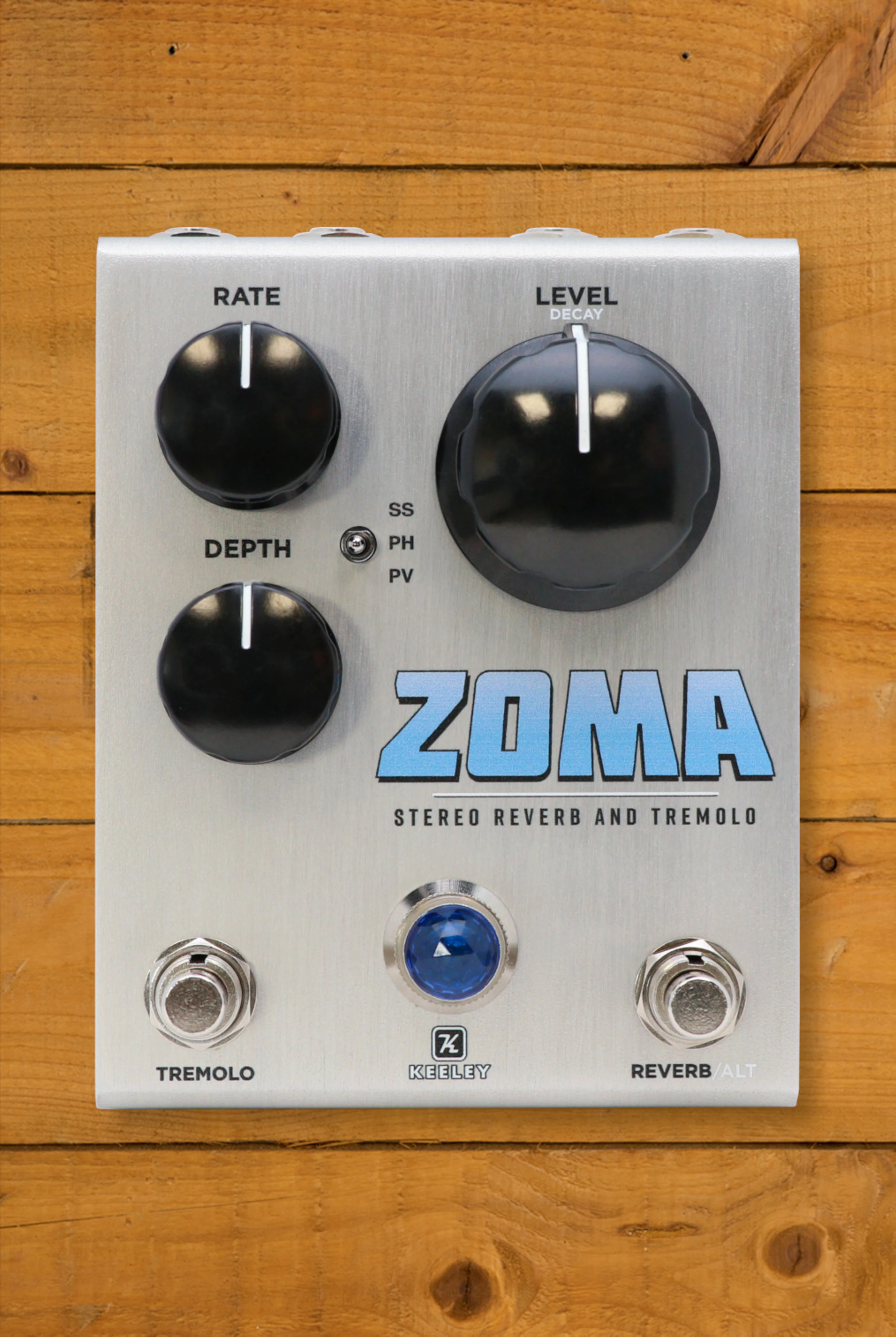 Housed in a durable, custom-angled aluminium chassis, the Zoma is built to withstand regular gigging and studio use. Like all Keeley pedals, it is proudly designed and manufactured in the USA. With its blend of high-quality stereo processing, flexible controls, and dependable construction, the Zoma is a powerful tool for players seeking to enhance their tone with lush reverbs and dynamic modulation effects.