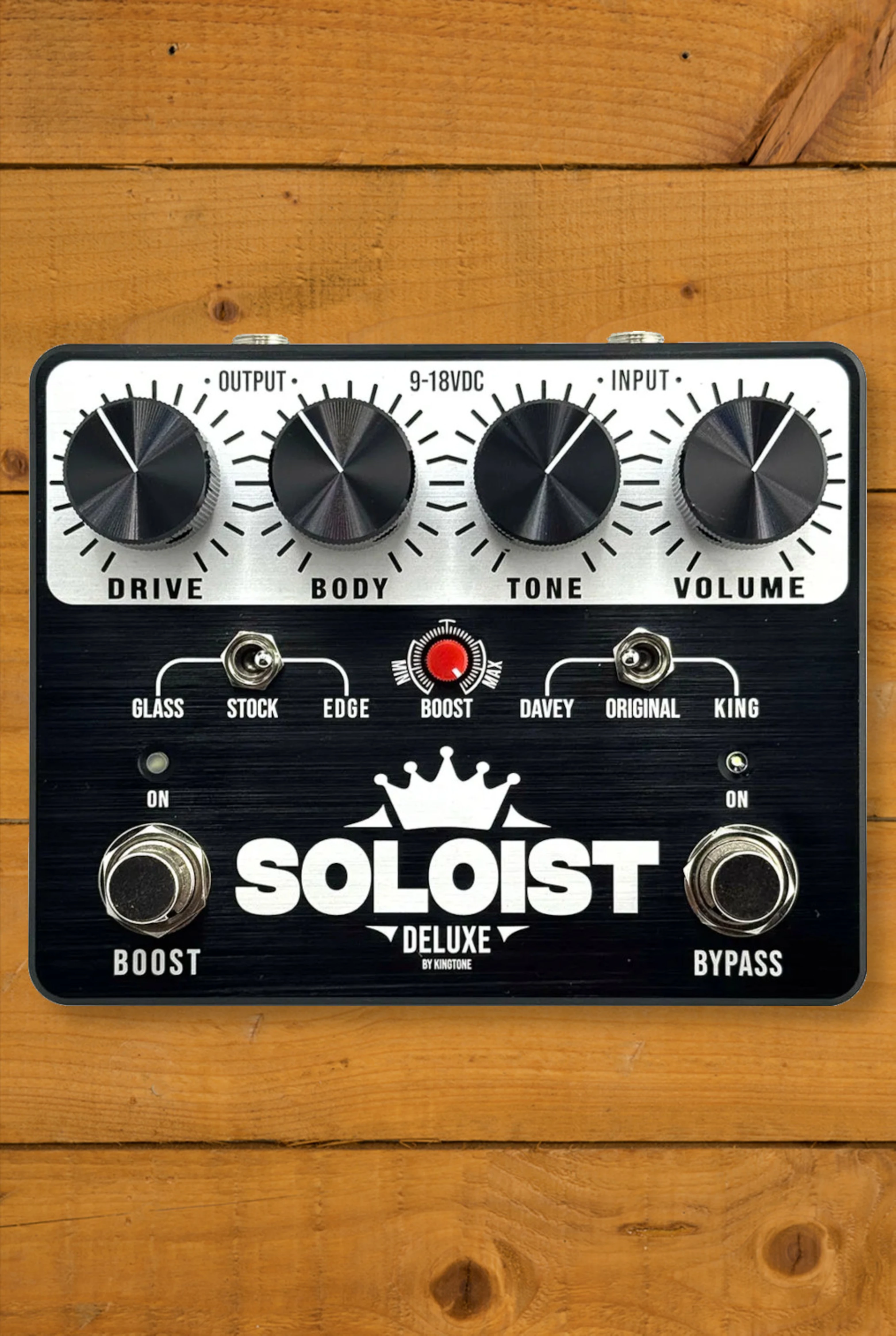 The Soloist Deluxe excels in delivering a wide range of tones, from glassy clean sounds to rich, sustaining overdrive. It adds character and warmth to any guitar setup, enhancing clean amps or driving tube amps into lush, expressive overdrive. This versatility makes it an essential tool for any guitarist looking to enhance their tonal palette.