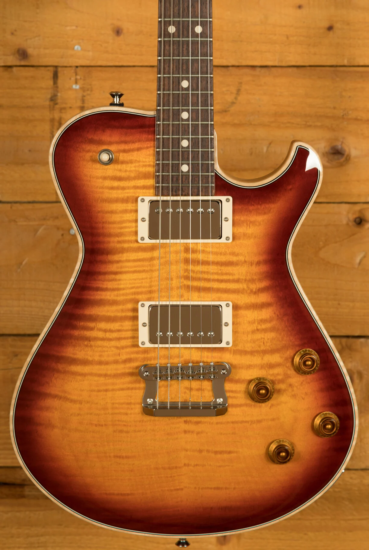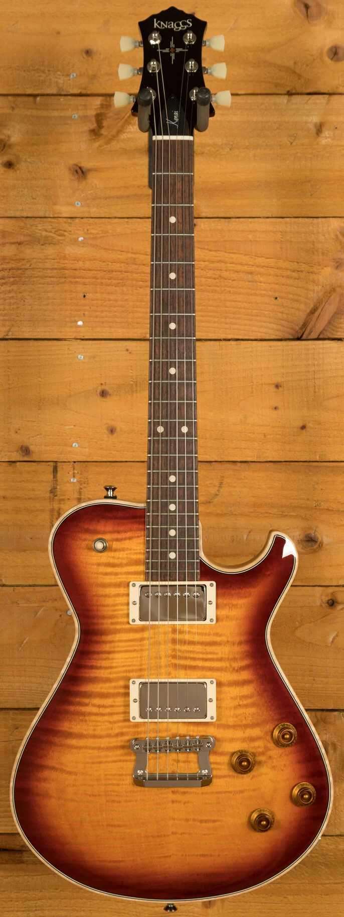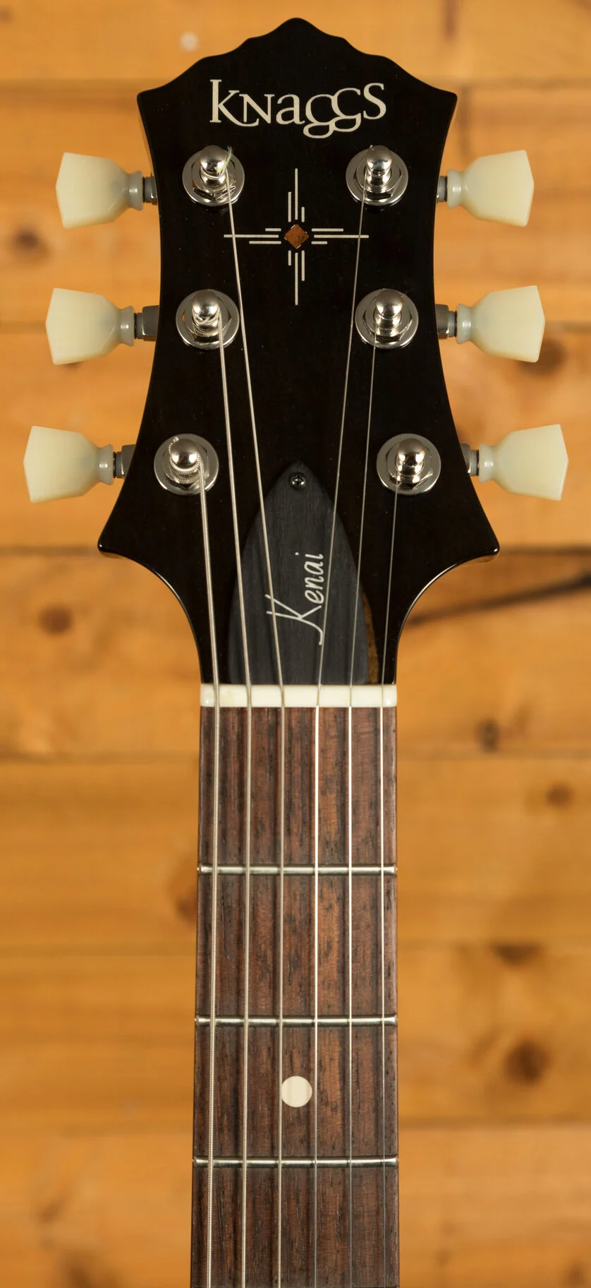 Constructed with precision, the Knaggs Kenai features a mahogany body with a Tier 2 curly maple top, finished in an eye-catching Dark Cherry Burst gloss nitro finish. The mahogany set-neck, measuring 24.75" in scale length, is complemented by a Rosewood fingerboard with a 12" radius, 22 medium frets, dot inlays, an ebony headstock veneer, and a bone nut.