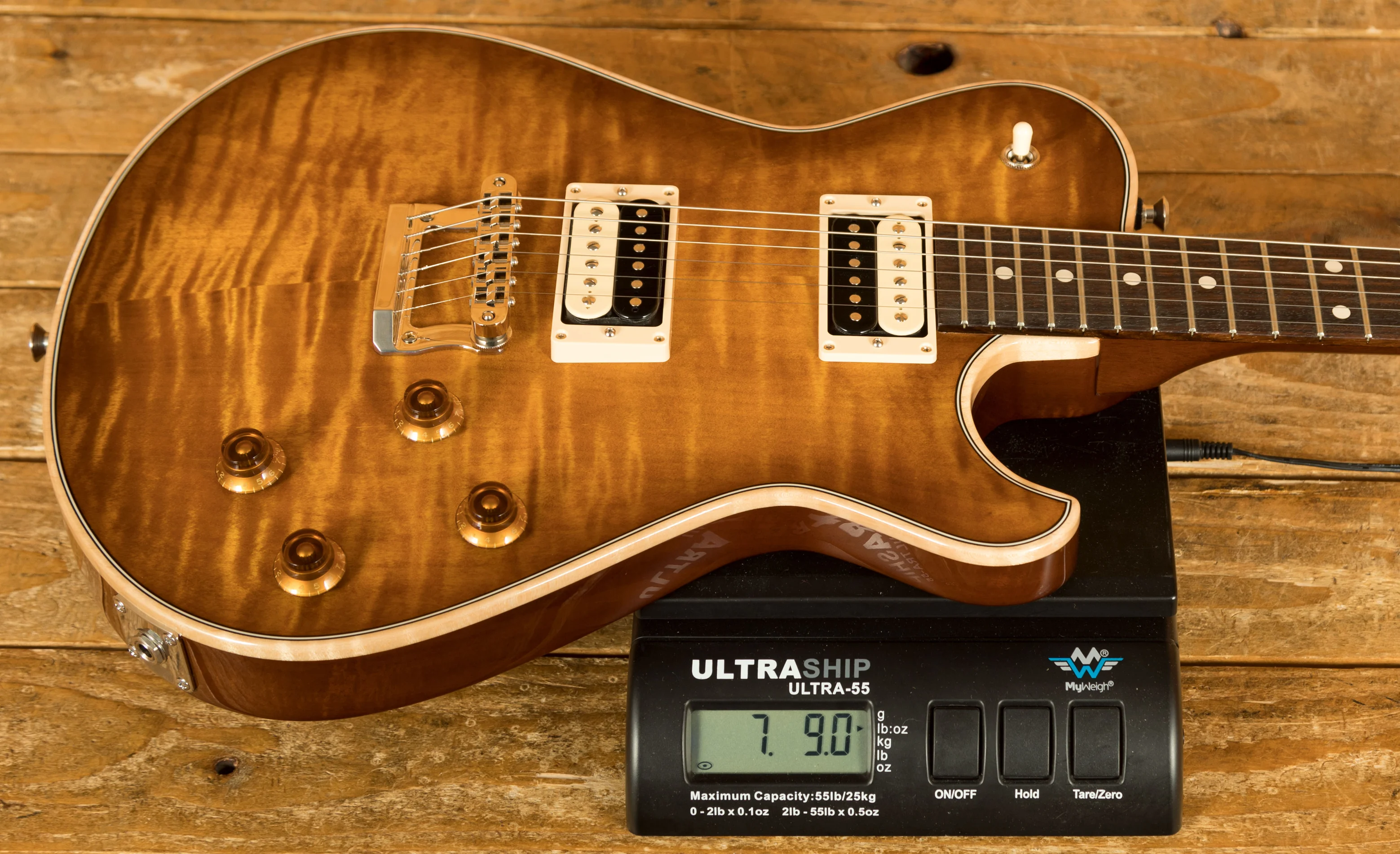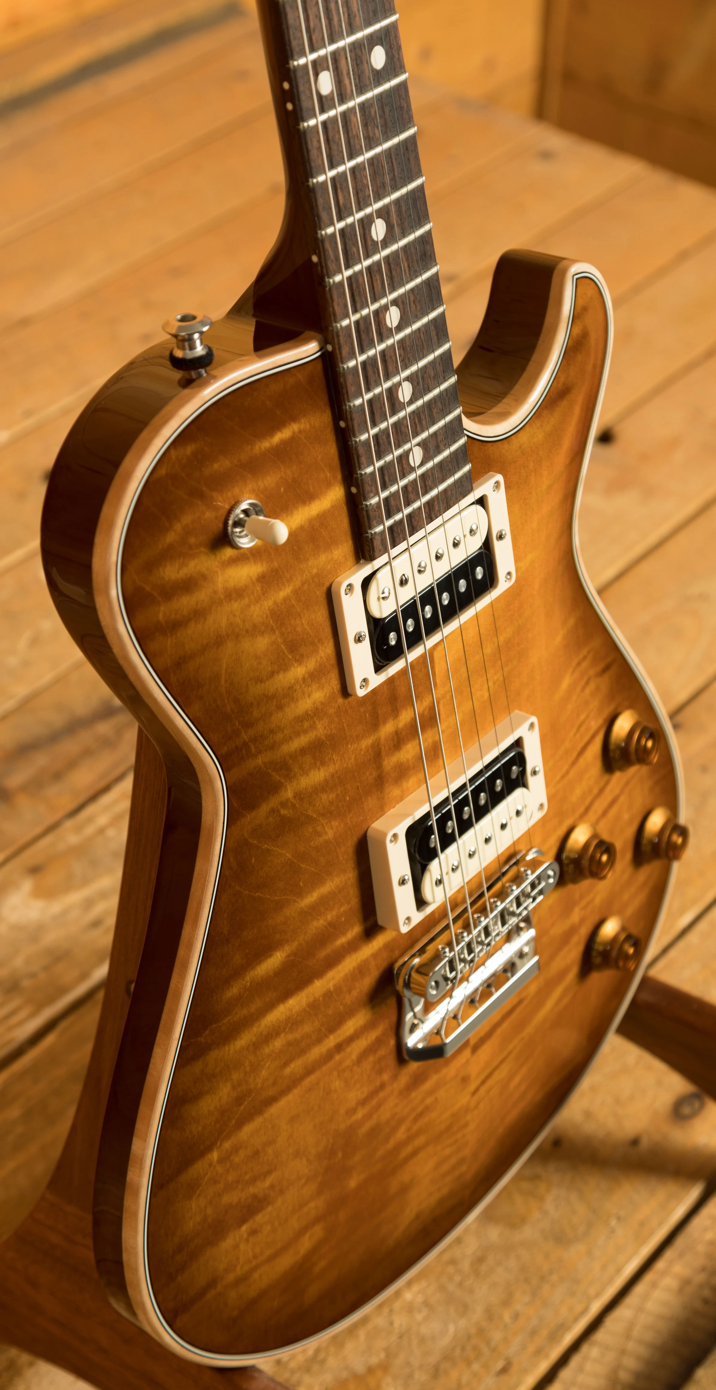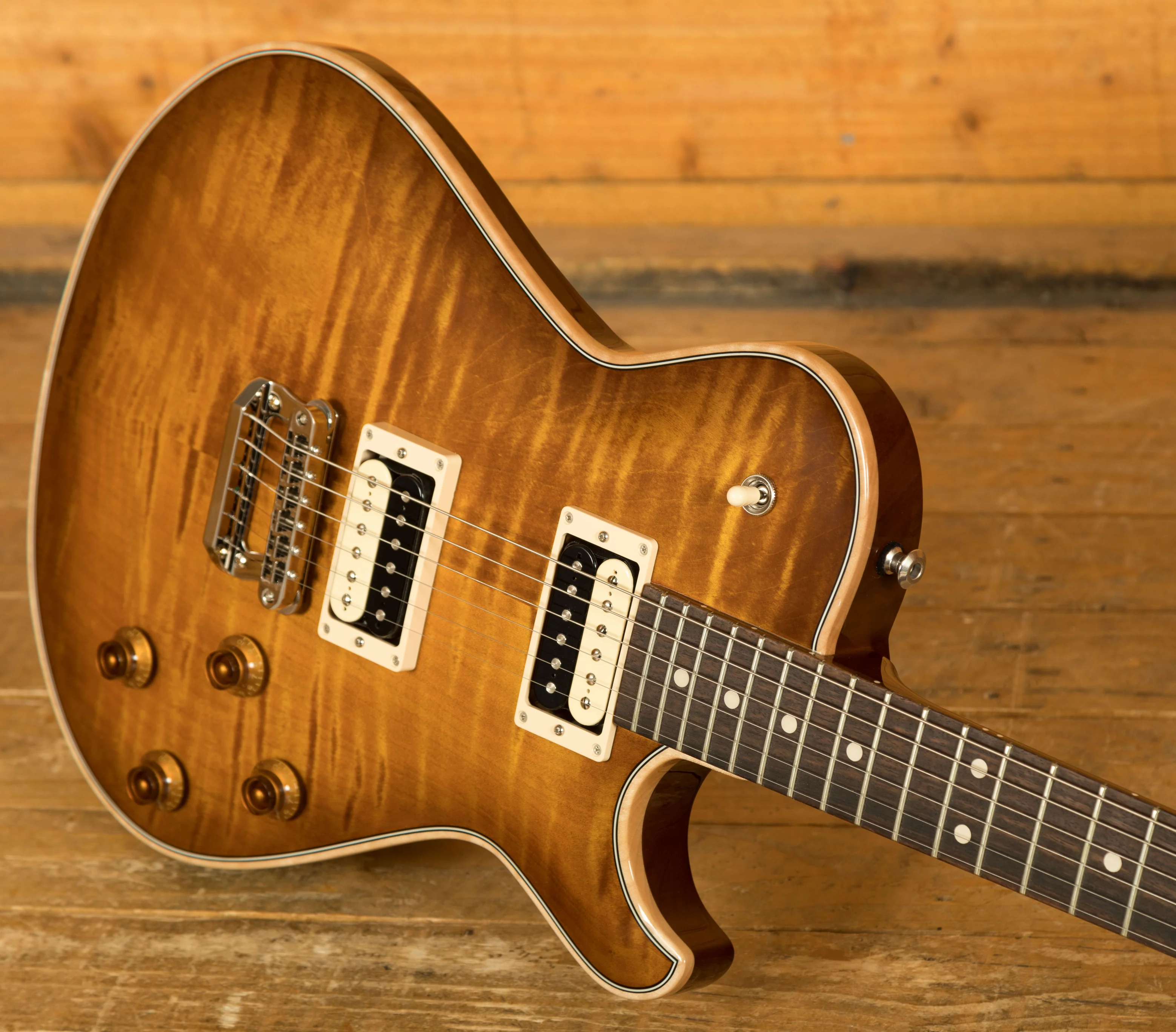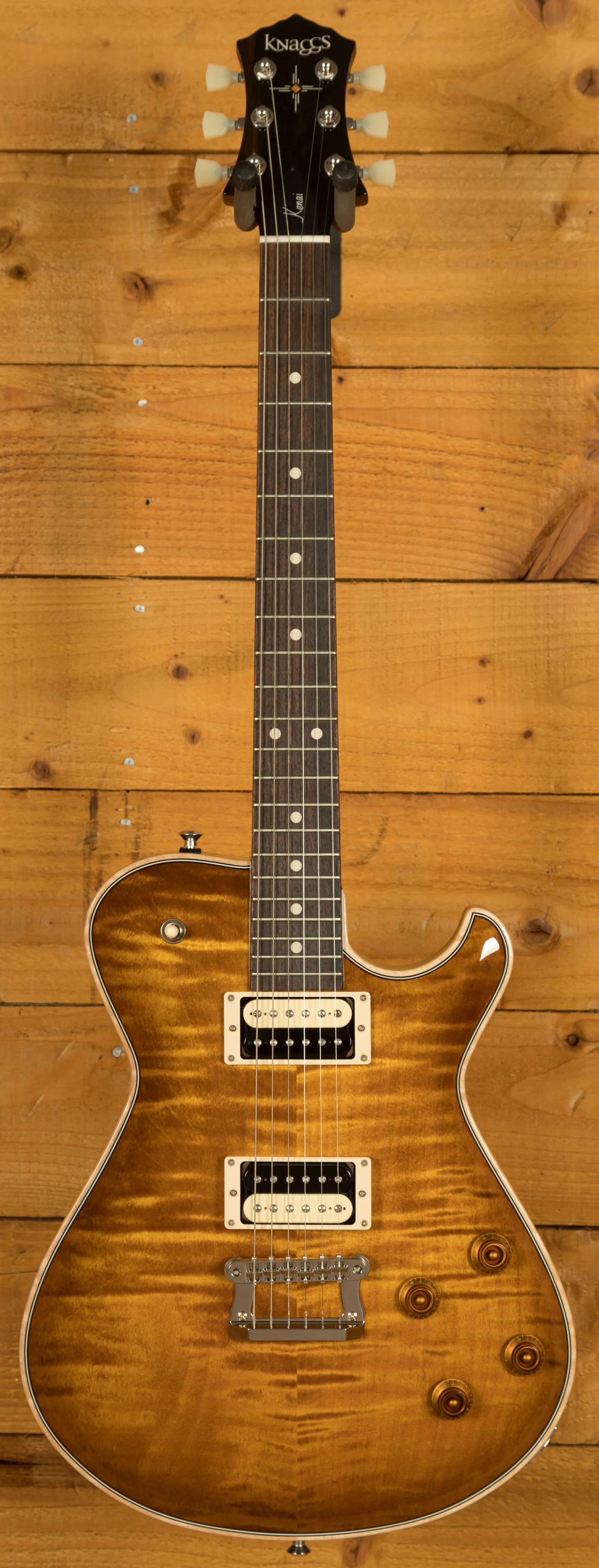 Constructed with precision, the Knaggs Kenai features a mahogany body with a Tier 2 curly maple top, finished in an eye-catching Lemon Burst and a semi-gloss finish. The mahogany set-neck, measuring 24.75" in scale length, is complemented by a Rosewood fingerboard with a 12" radius, 22 medium frets, dot inlays, an ebony headstock veneer, and a bone nut.