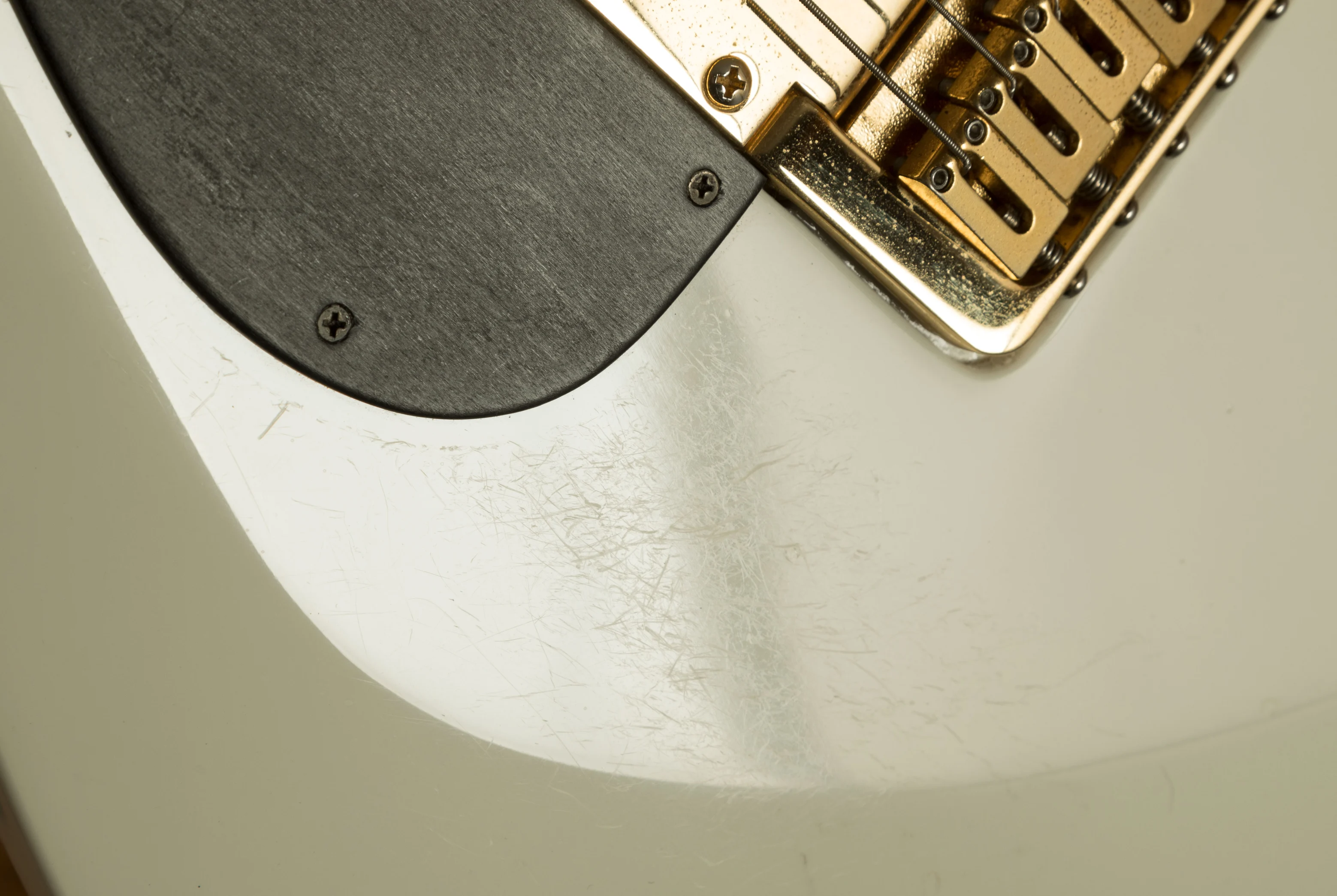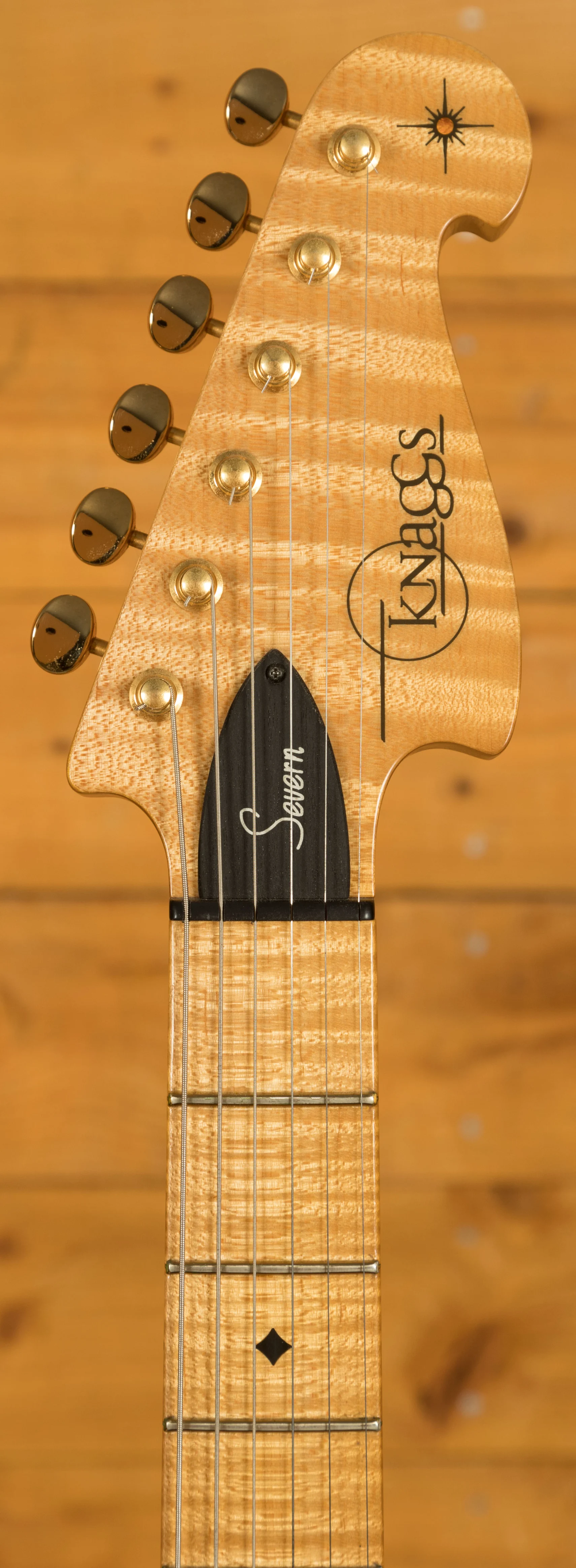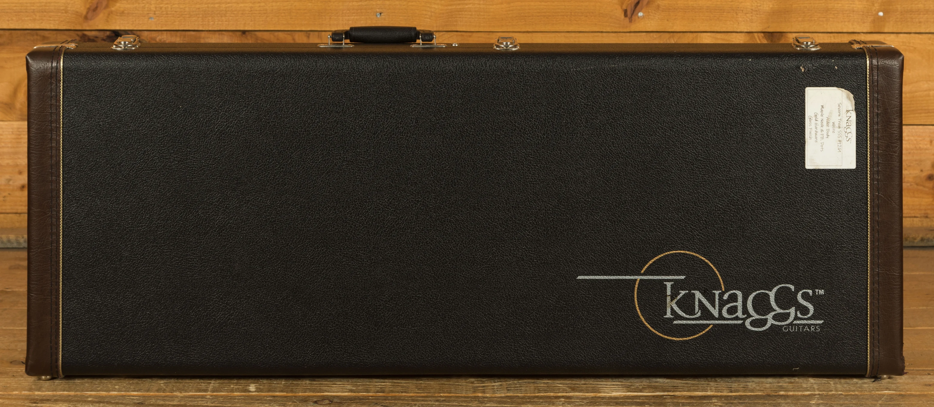 The Knaggs Severn Trem SSS is a meticulously crafted instrument that showcases the exceptional craftsmanship and attention to detail that Knaggs Guitars is renowned for. This guitar was custom-built for Danny Dela Cruz, a highly respected session guitarist known for his work with Thrxnes and as a JTC Guitar artist. Danny shared that it's a killer guitar, but he simpler prefers instruments with larger necks than this one. Despite this, he certainly enjoyed it for a few years as the guitar clearly shows signs of use, with a unique and appealing worn-in aesthetic that comes from someone playing like they mean it.