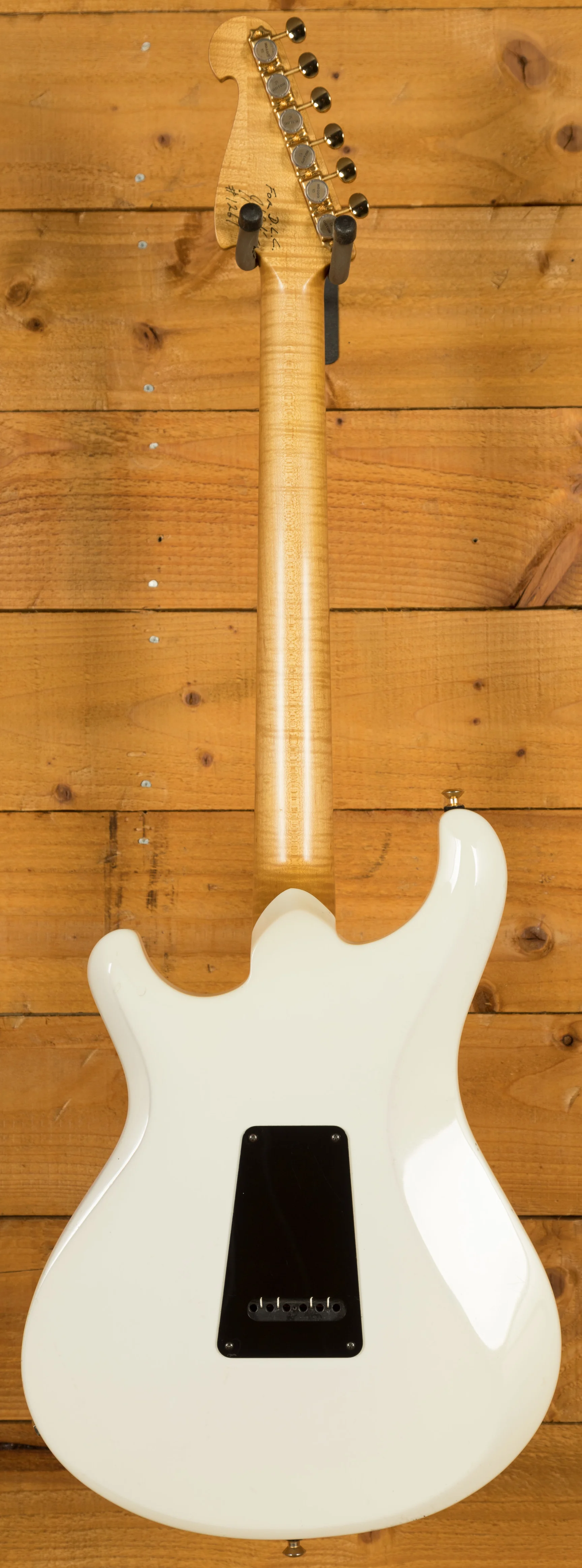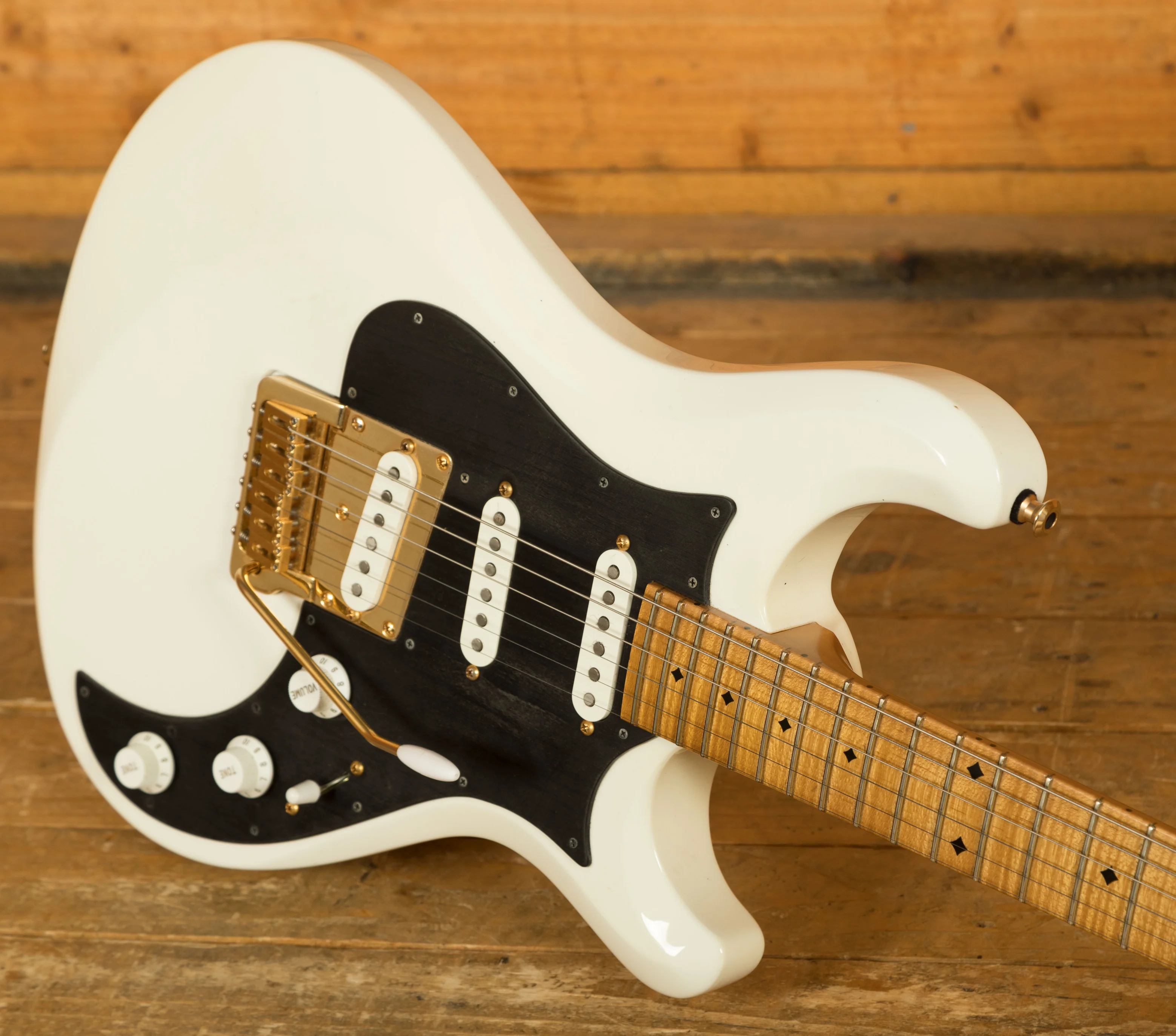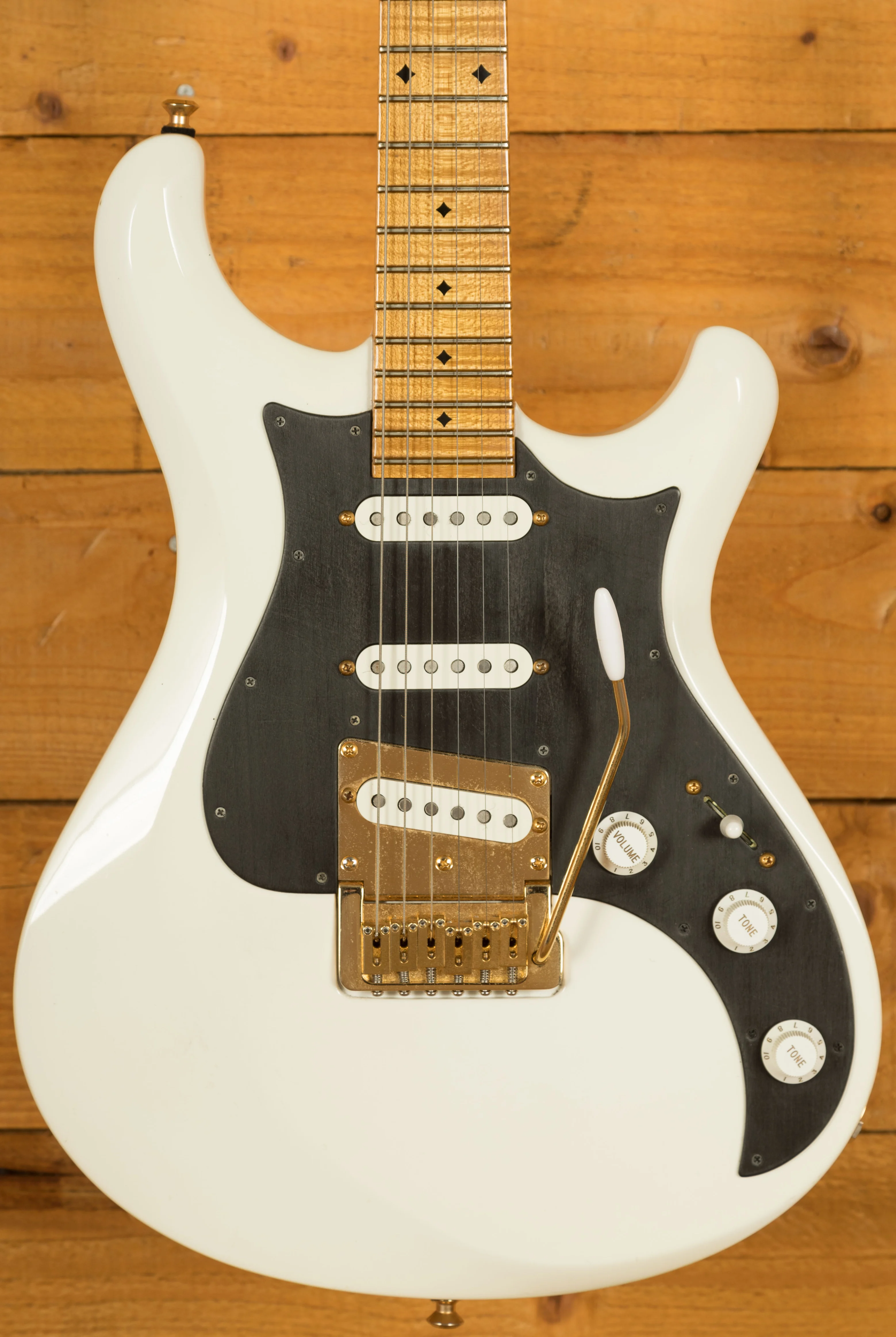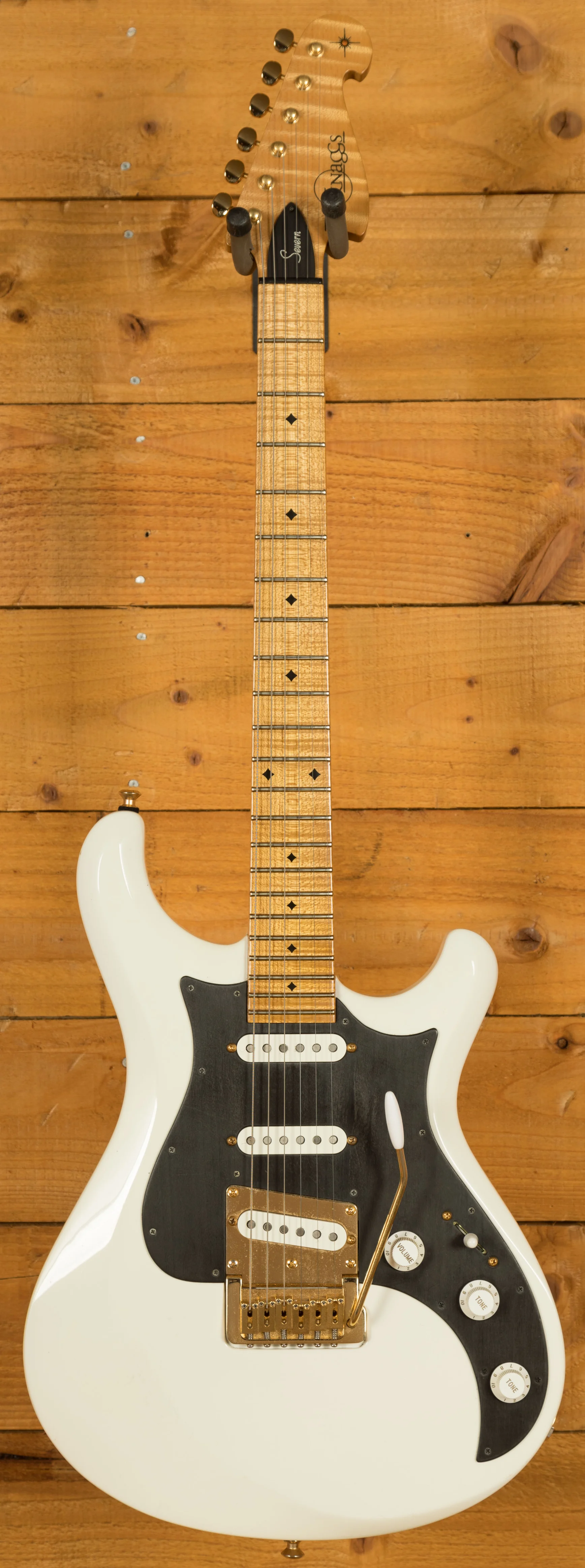 The Severn Trem SSS features a stunning white finish that complements the guitar's elegant design. The body is constructed from alder, a tonewood prized for its balanced sound and versatility. The neck is made from beautifully-flamed maple, a wood renowned for its brightness, sustain, and stability. The maple fingerboard is adorned with black diamond inlays, adding a touch of luxury and visual interest.