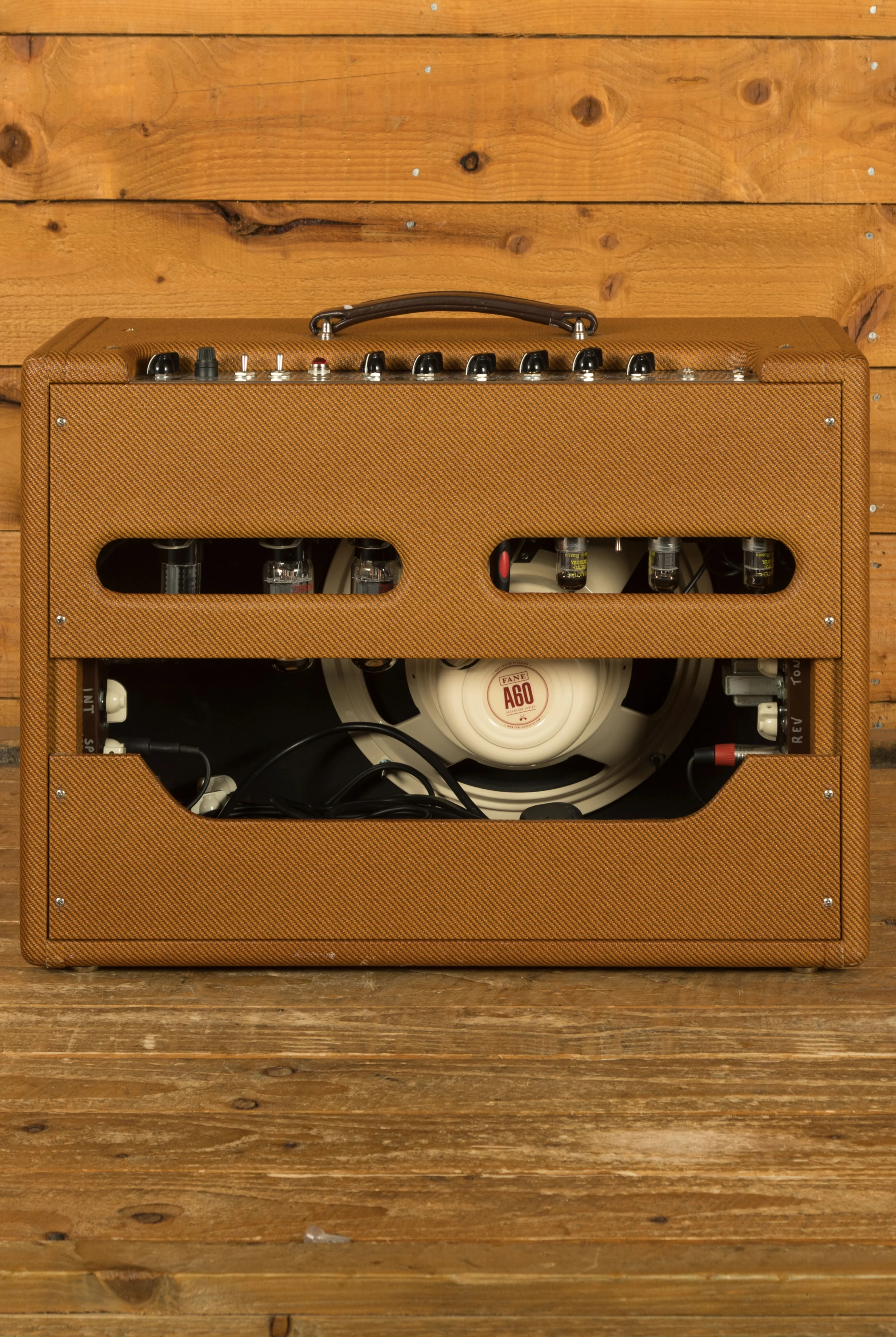 This well-maintained model is in excellent condition and comes supplied with a padded cover for secure storage and transport, ensuring its hand-aged lacquered tweed finish and finger-jointed pine cabinet stay protected. The dual-channel design includes Normal and Bright inputs, each with its own volume control, and a shared tone knob for precise sound shaping.