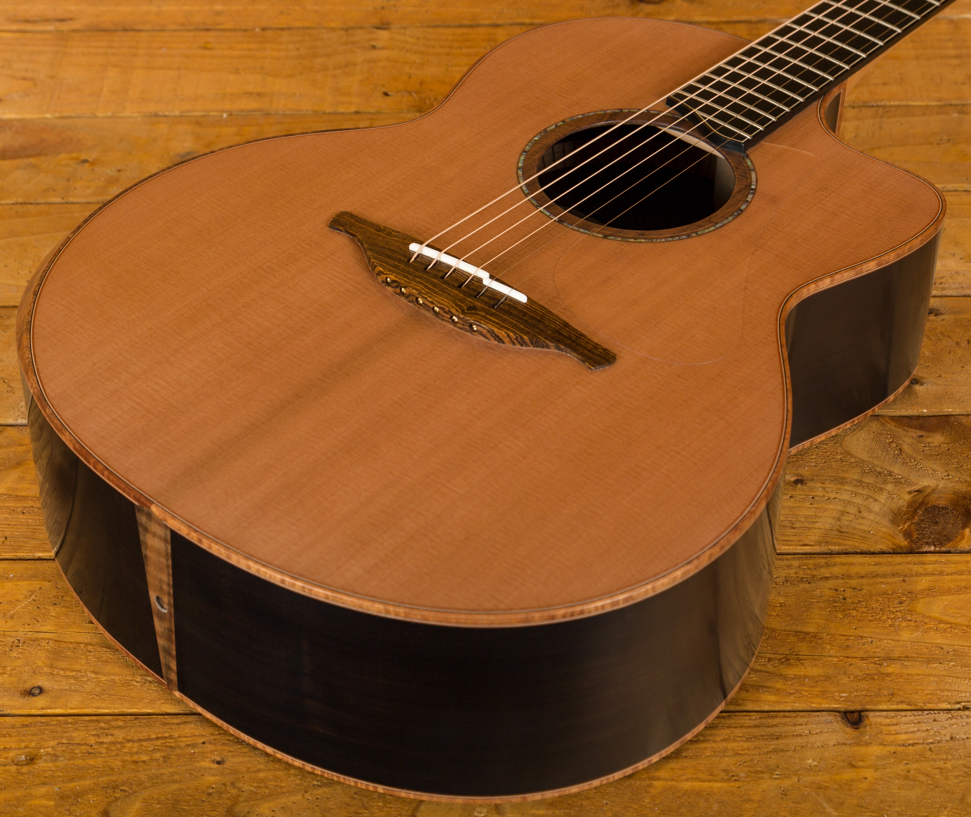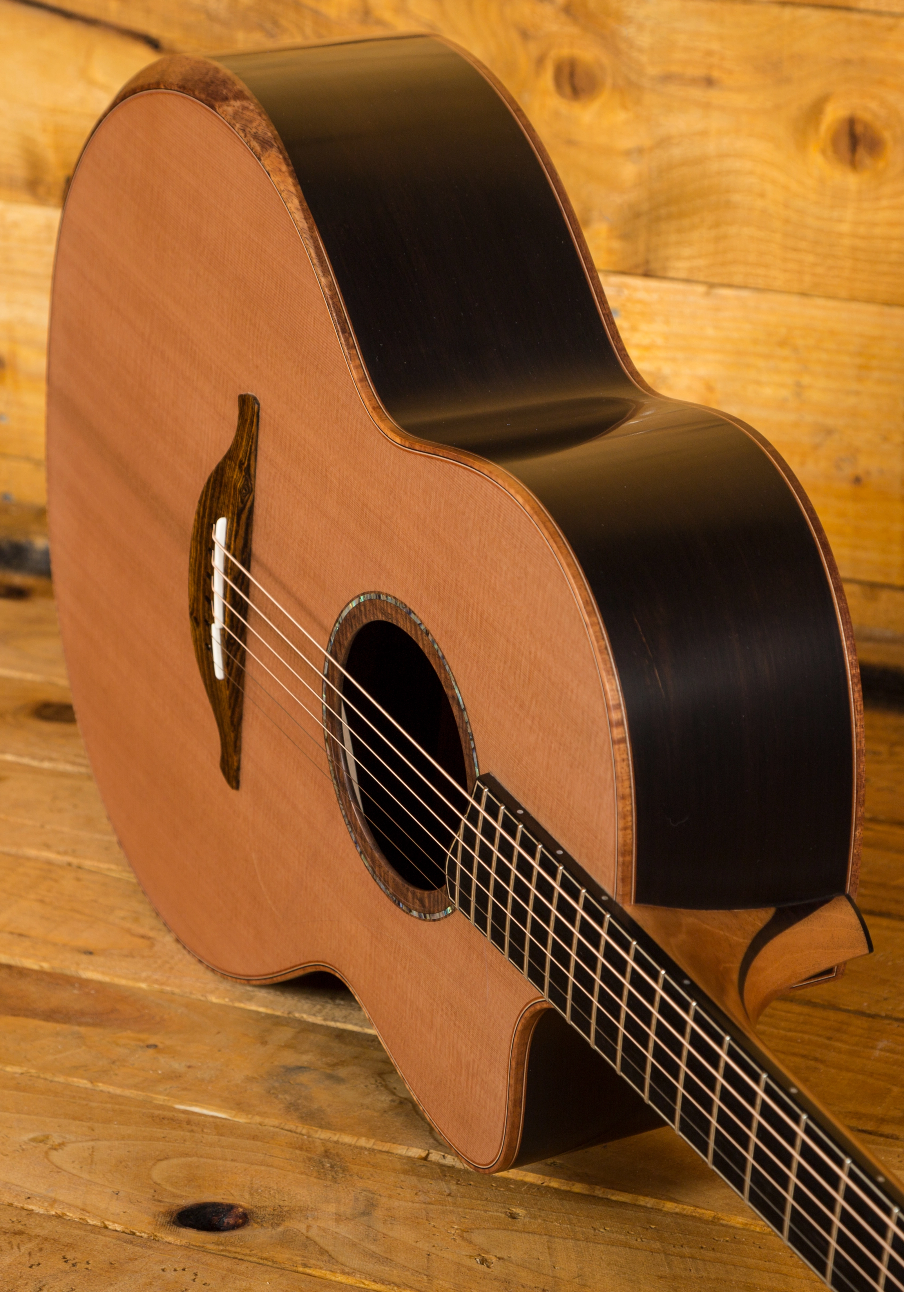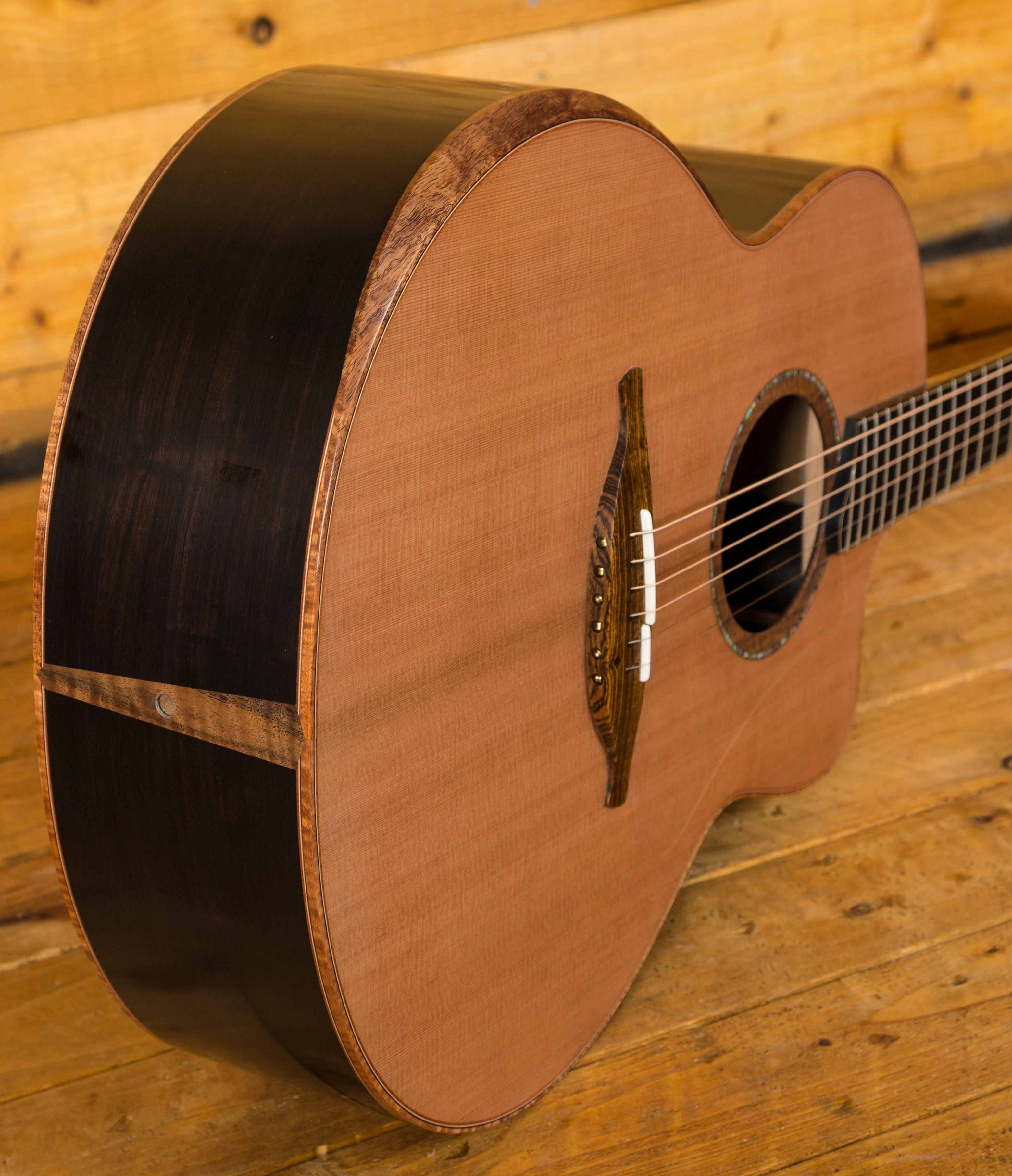 Another beautiful Lowden featuring mastergrade tonewoods, figured wood and abalone soundhole edge rosette. This one features a stunning all-solid combination of African Blackwood and Red Cedar.