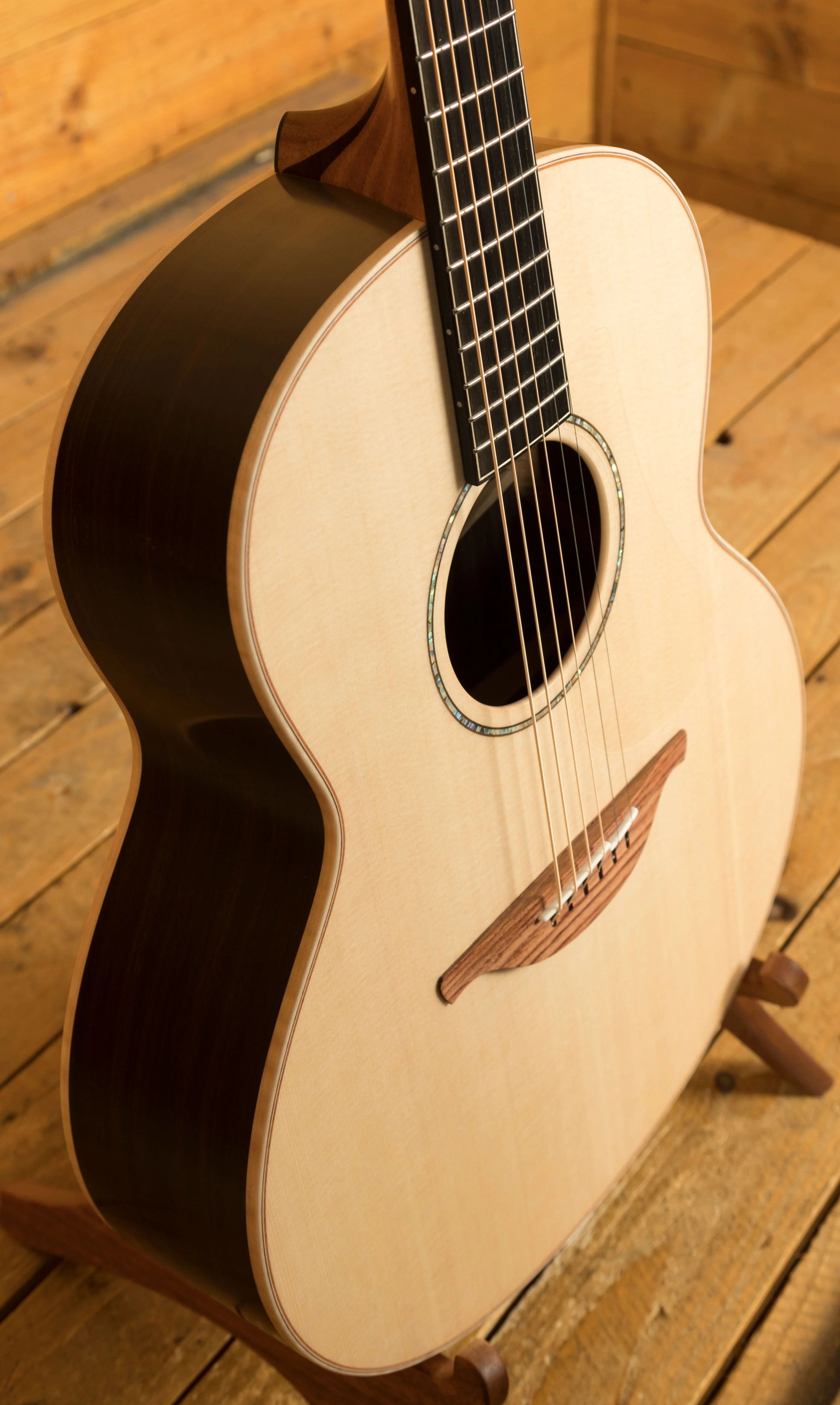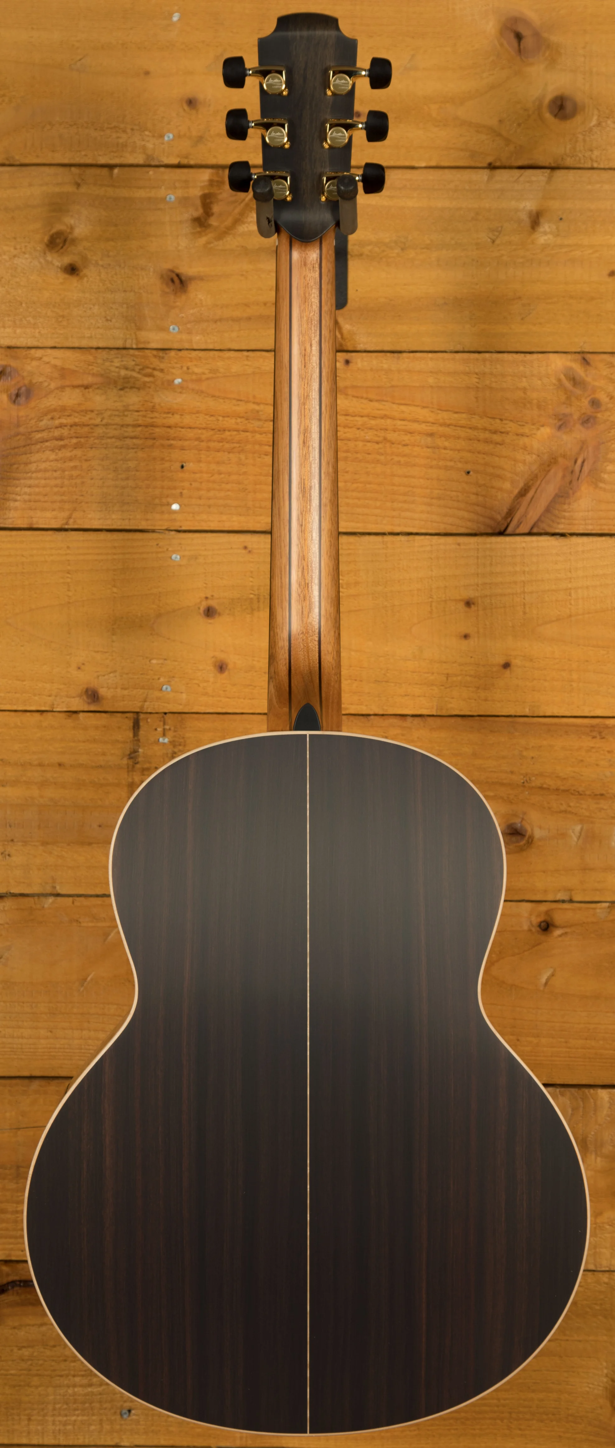 The five-piece Mahogany and Rosewood neck provides both stability and stunning aesthetics. The fingerboard, adorned with Maple bindings, offers a smooth playing surface for effortless navigation. One standout feature of the FM series is its shallow neck carve and narrow neck dimensions, providing a unique feel that's been likened to an electric guitar neck. With a 43.5mm nut width and 56.25mm at the neck joint, it's narrower than Lowden's standard neck, offering a comfortable and familiar feel for players of all styles.