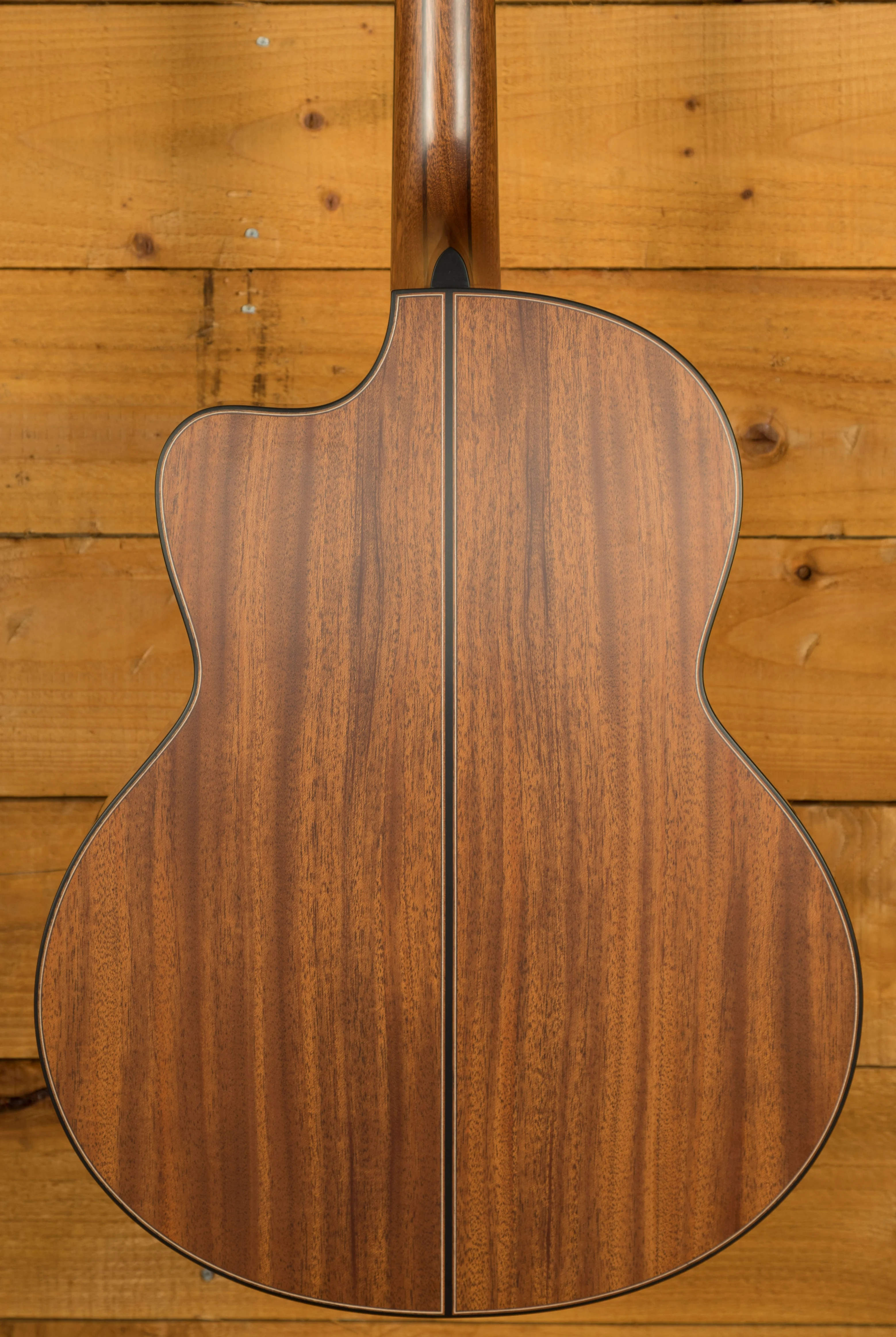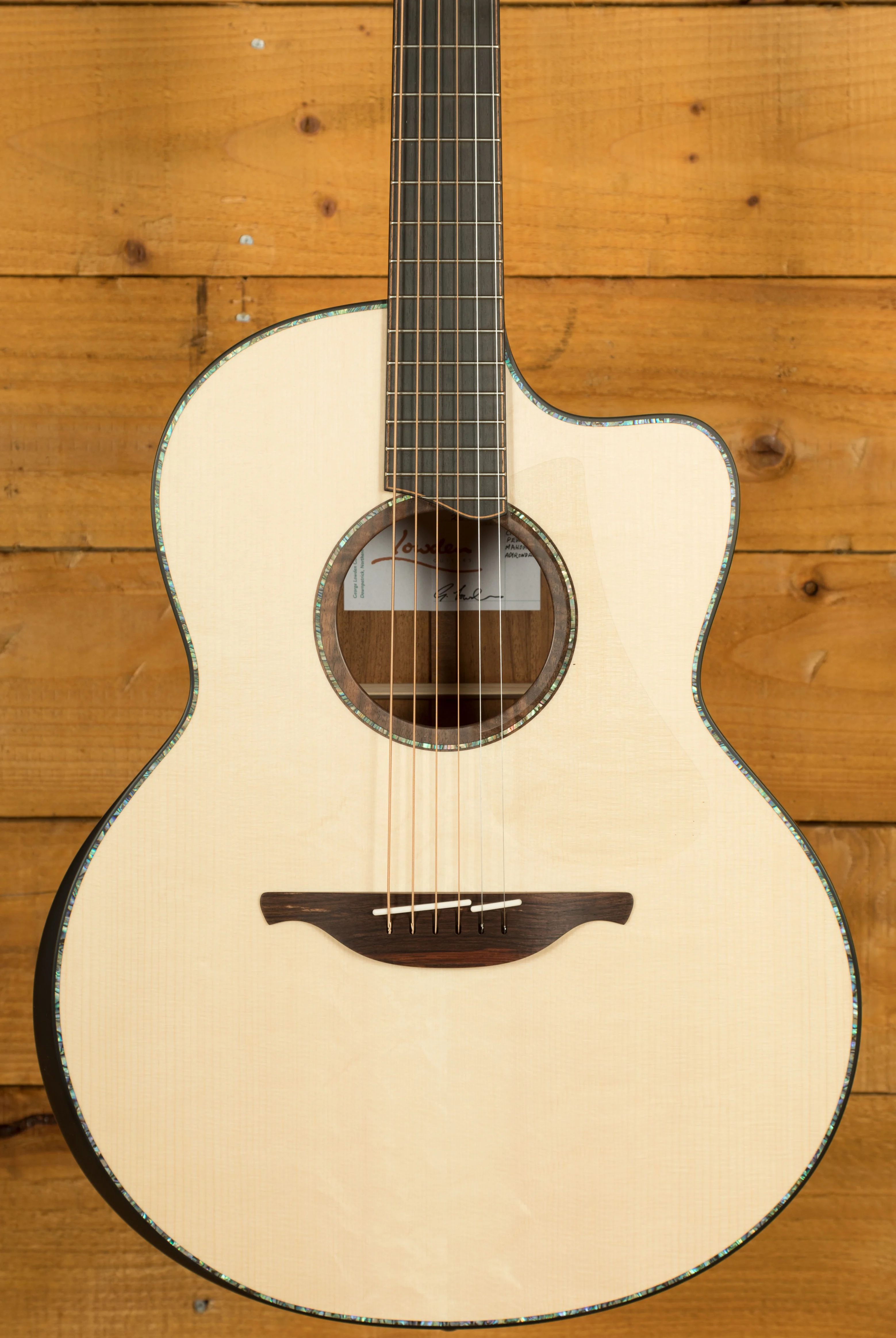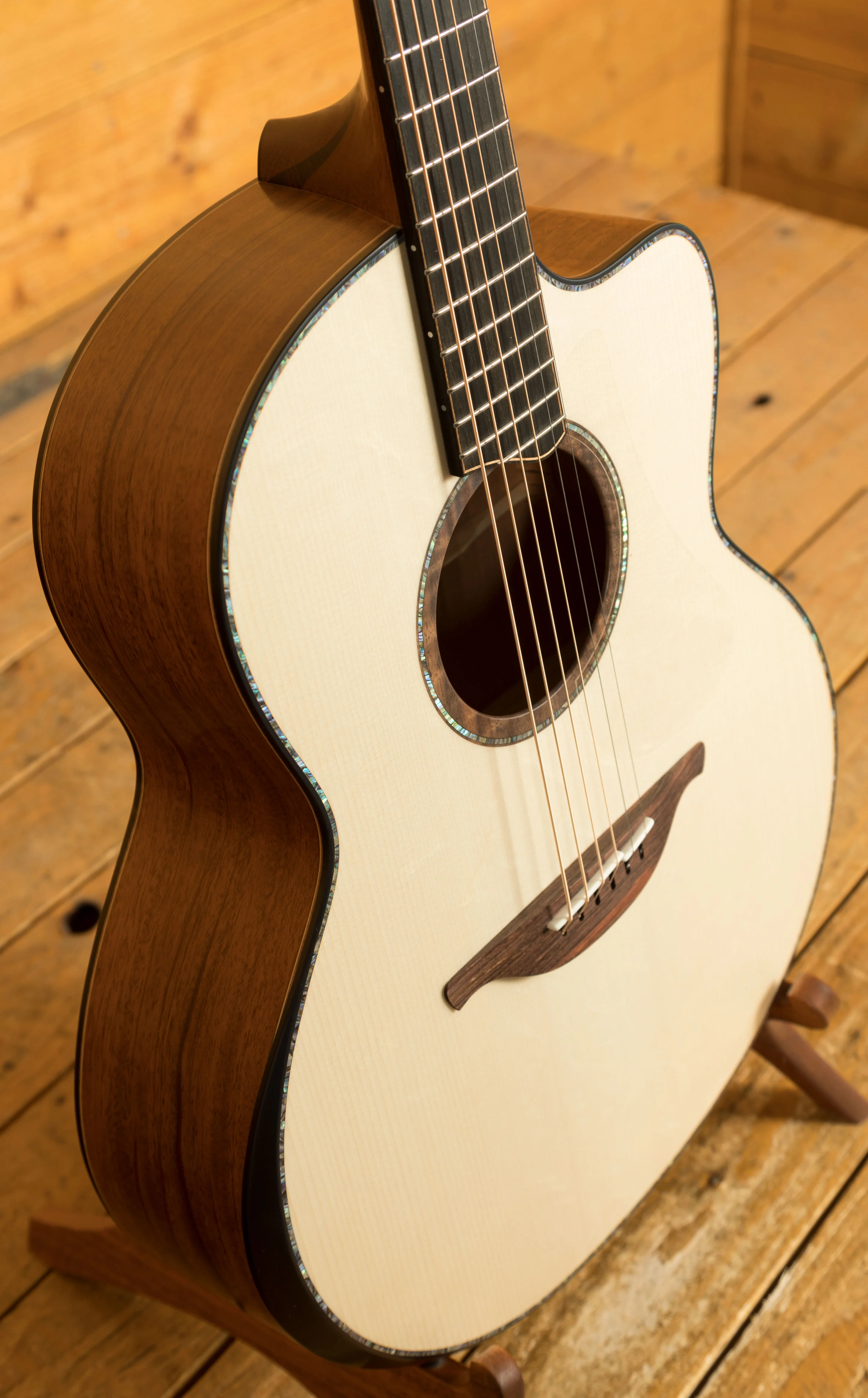 Custom options available for the FM-50C include a cutaway and the sought-after soundbox bevel. The soundbox bevel, pioneered on the Pierre Bensusan signature model, has become one of Lowden's most popular options. Its curved design, seamlessly integrated into the binding on the upper bout, provides enhanced comfort for the arm while playing.