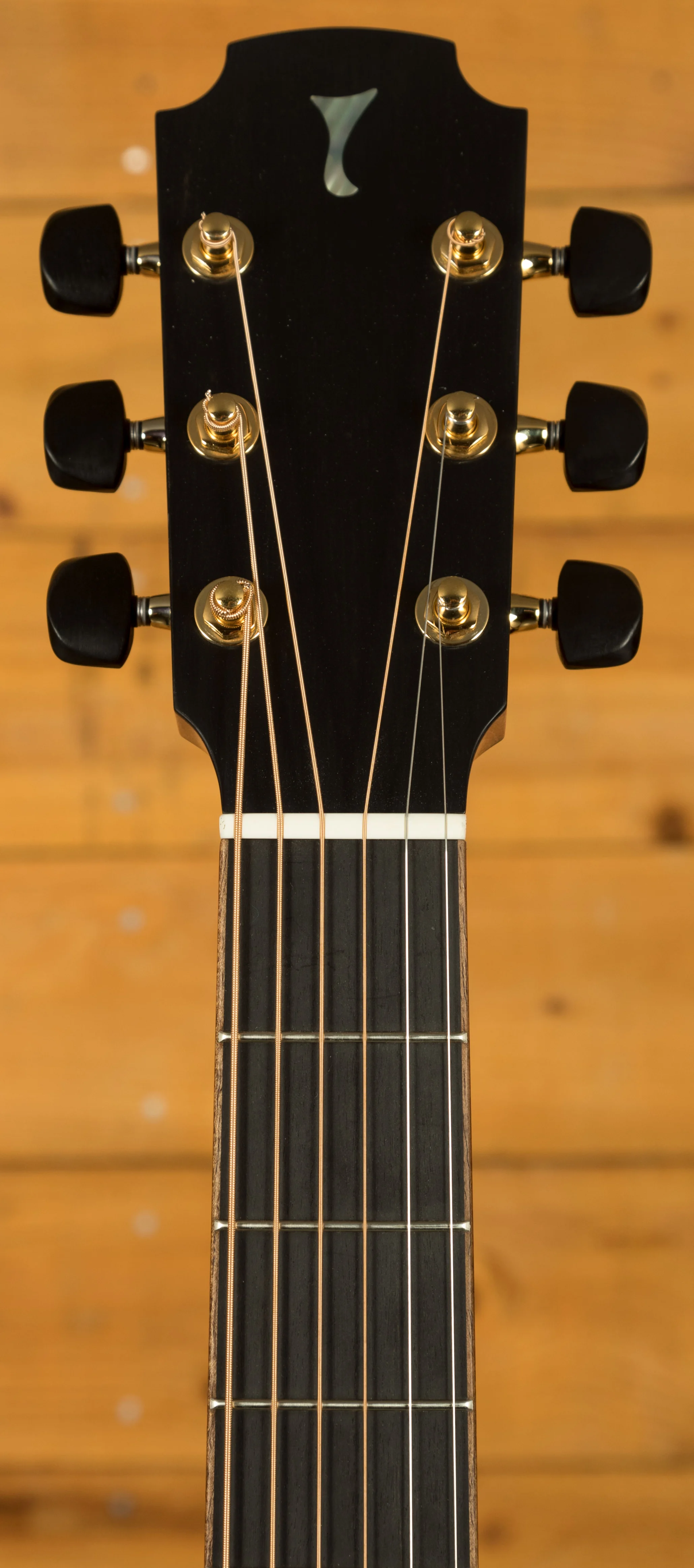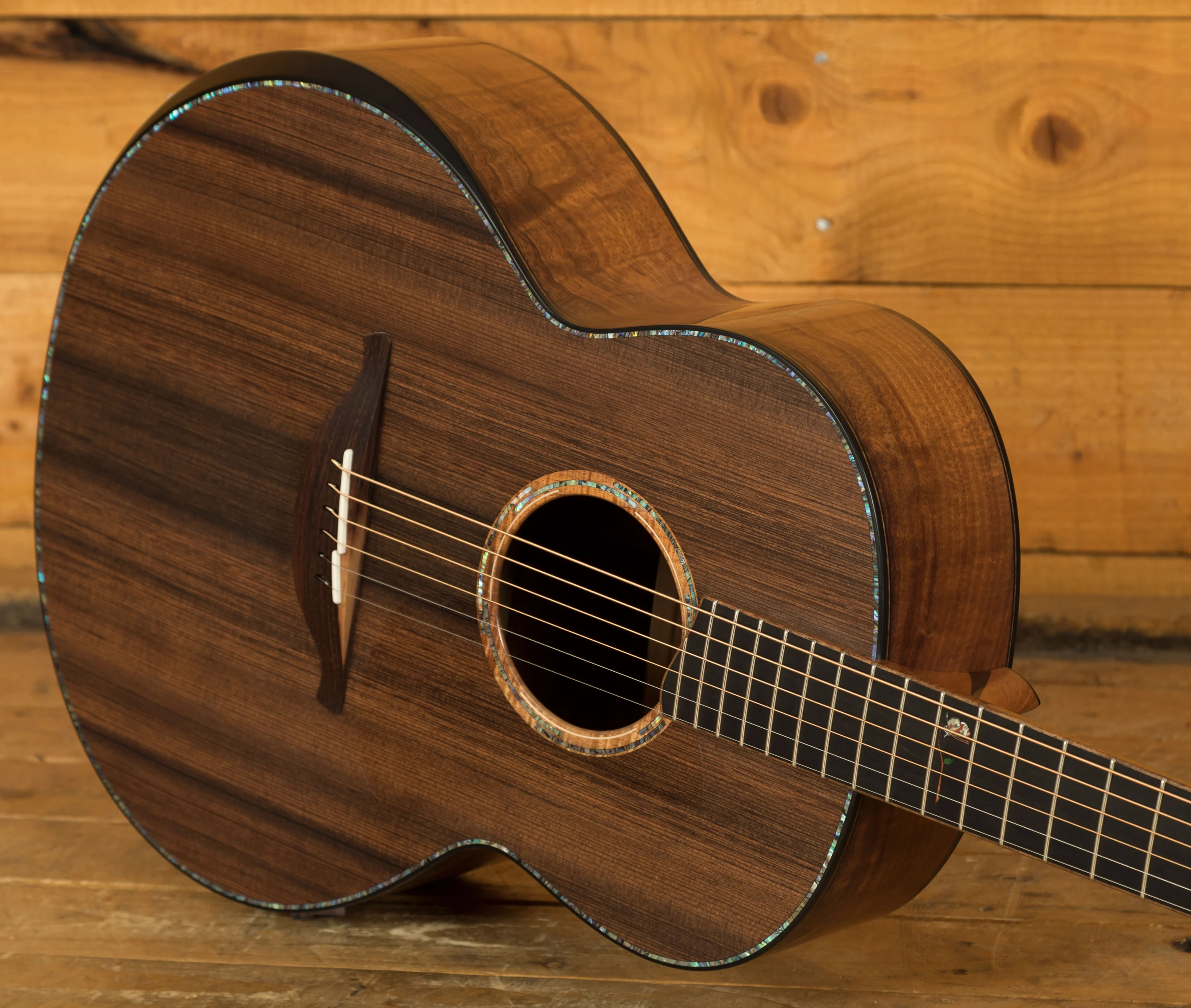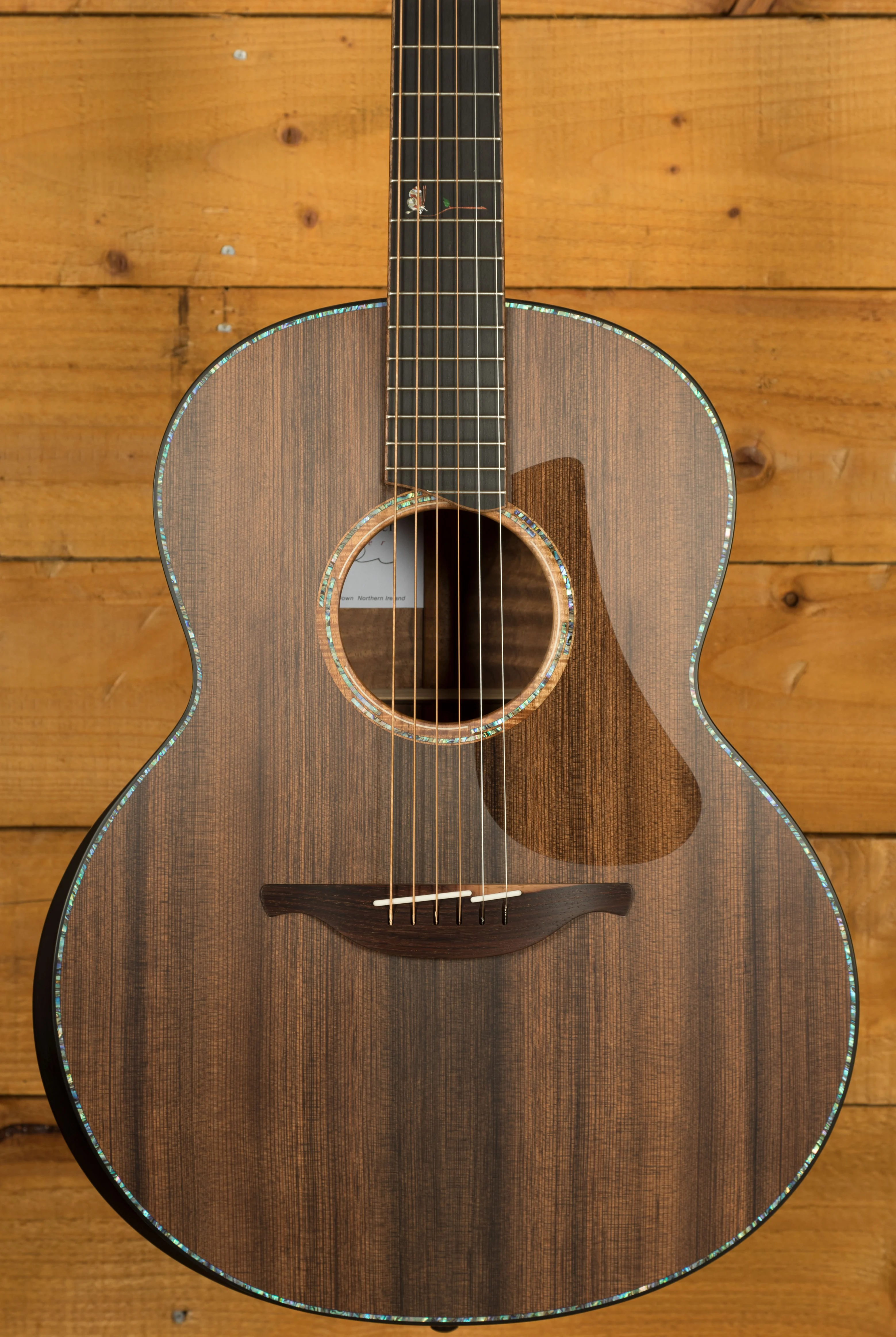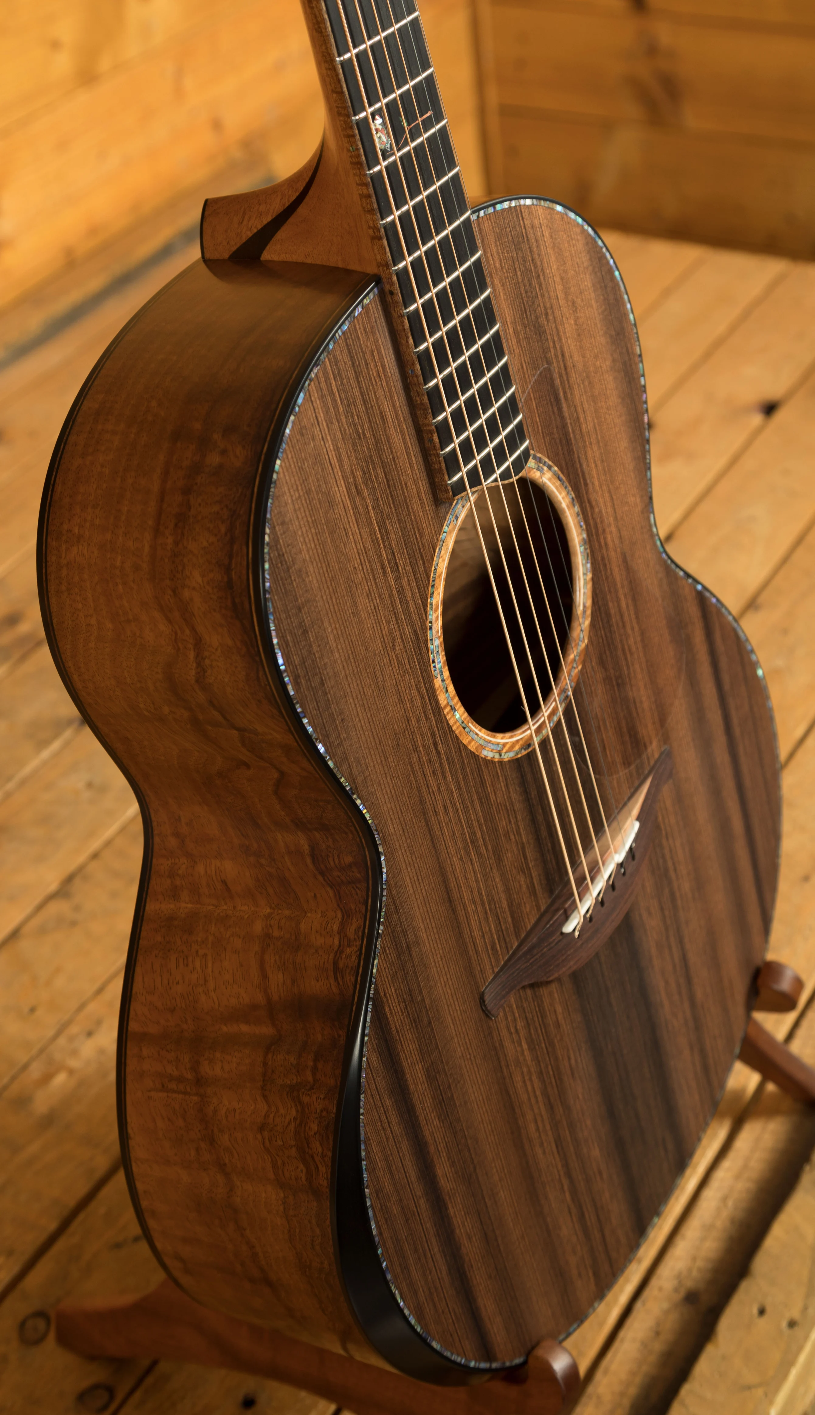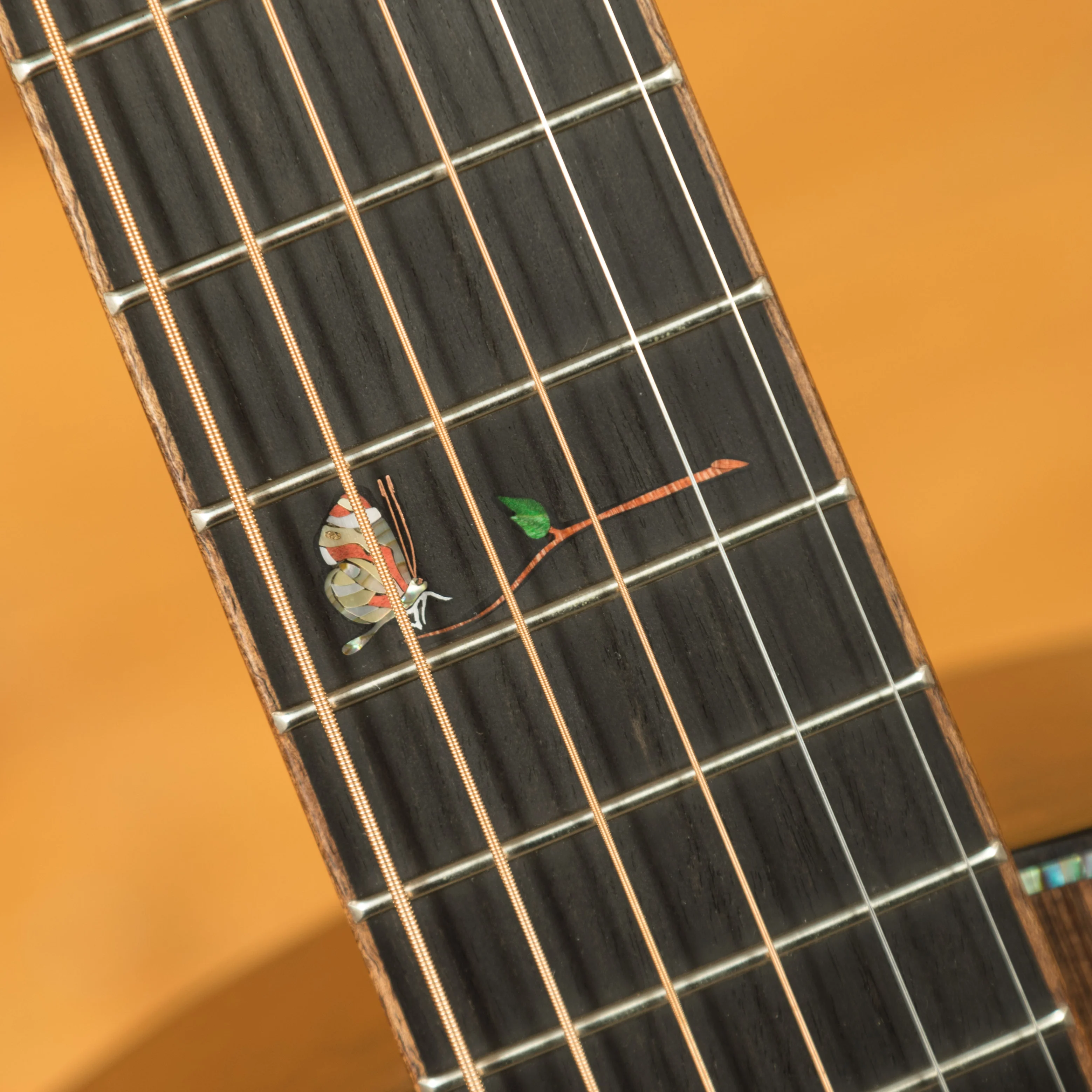 With a rich piano like response and unbelievable clarity it's equally at home as a finger style guitar or strumming big chords. A 5 piece neck offers a familiar yet delicious neck combination. It is supremely comfortable and offers an incredible playing experience. The rich Ebony fingerboard also includes a custom 12th fret Butterfly inlay designed by the incredible Larry Robinson. Every element of this guitar has been developed with the highest level of care and attention to detail, the result is simply stunning.
