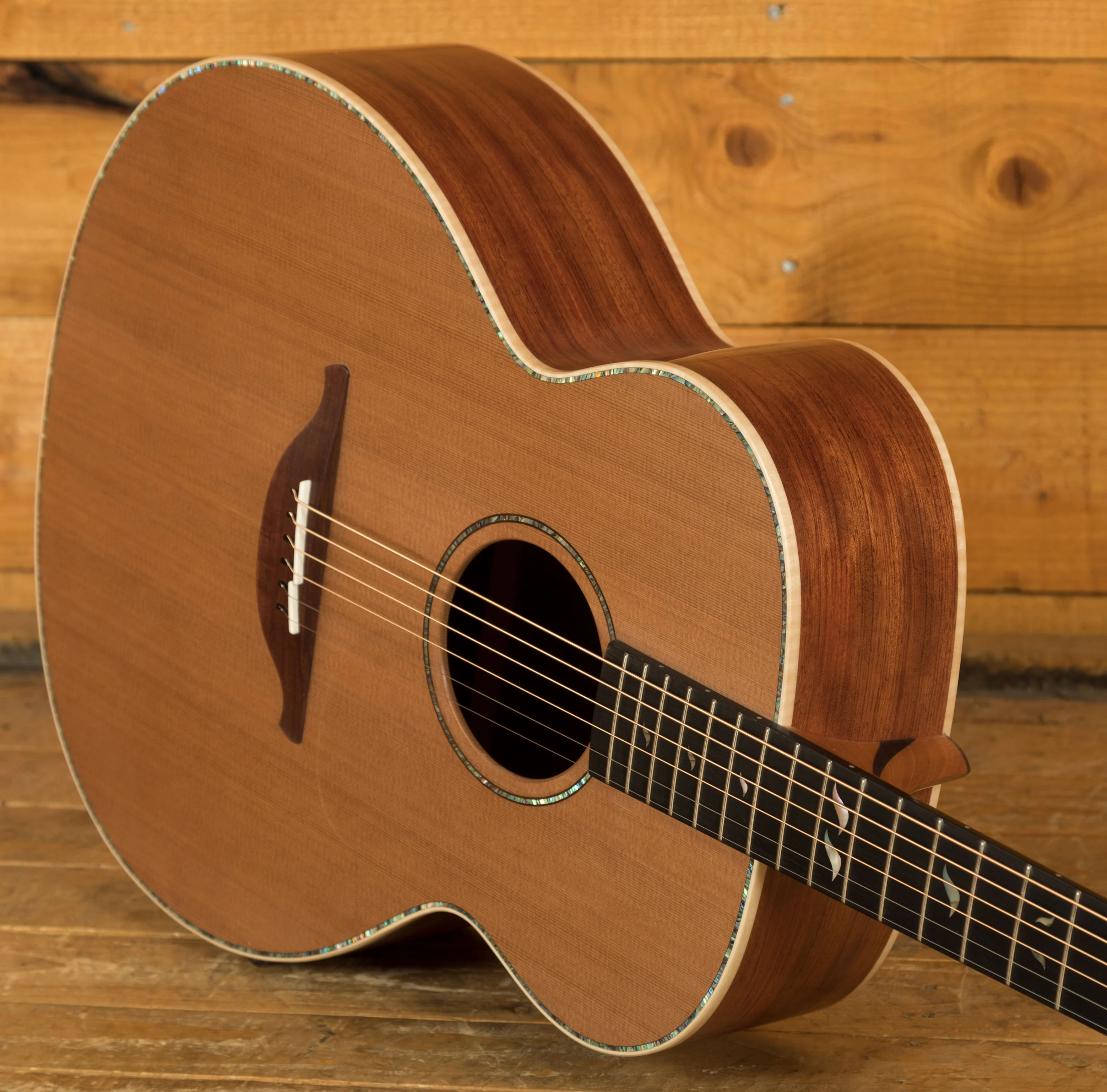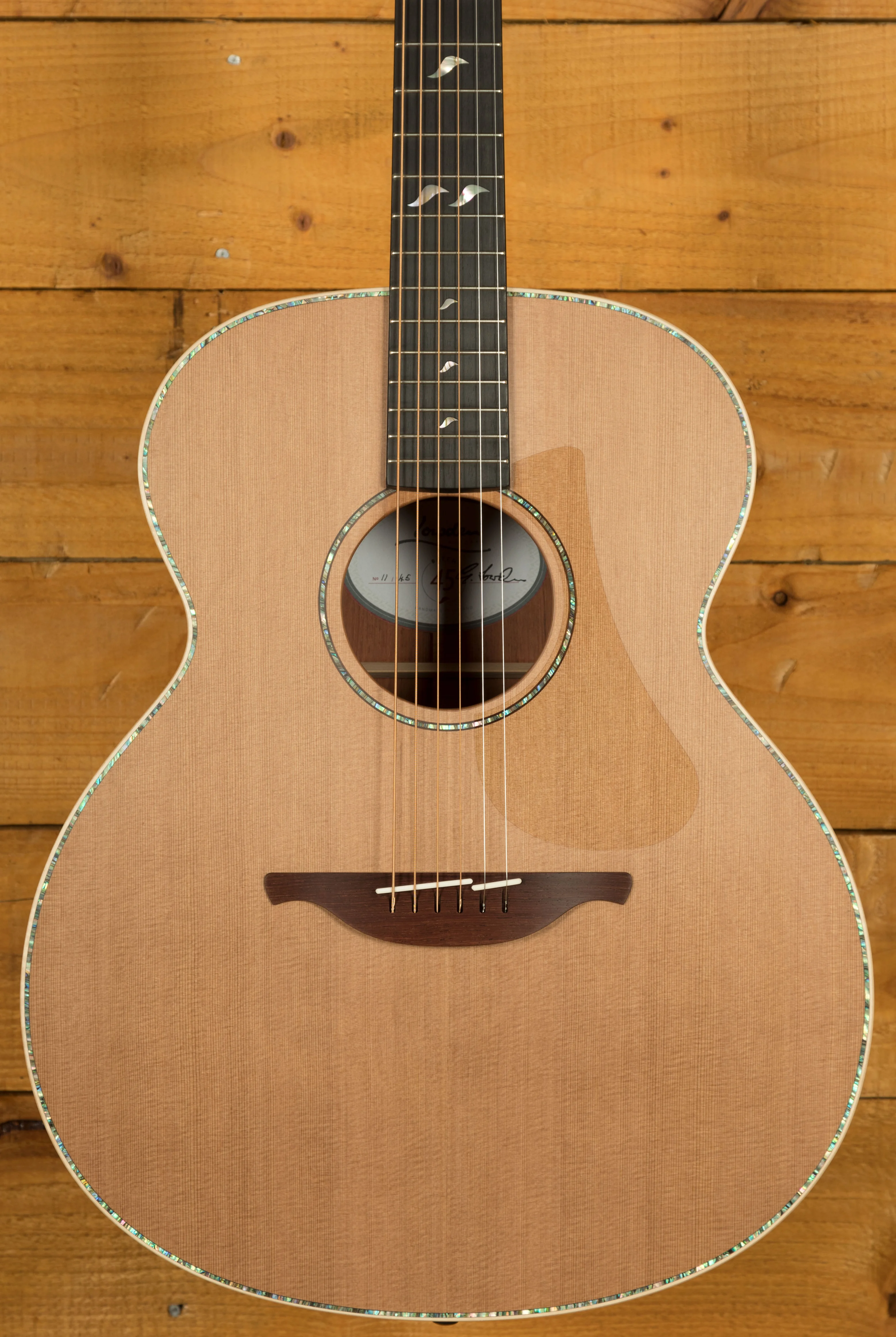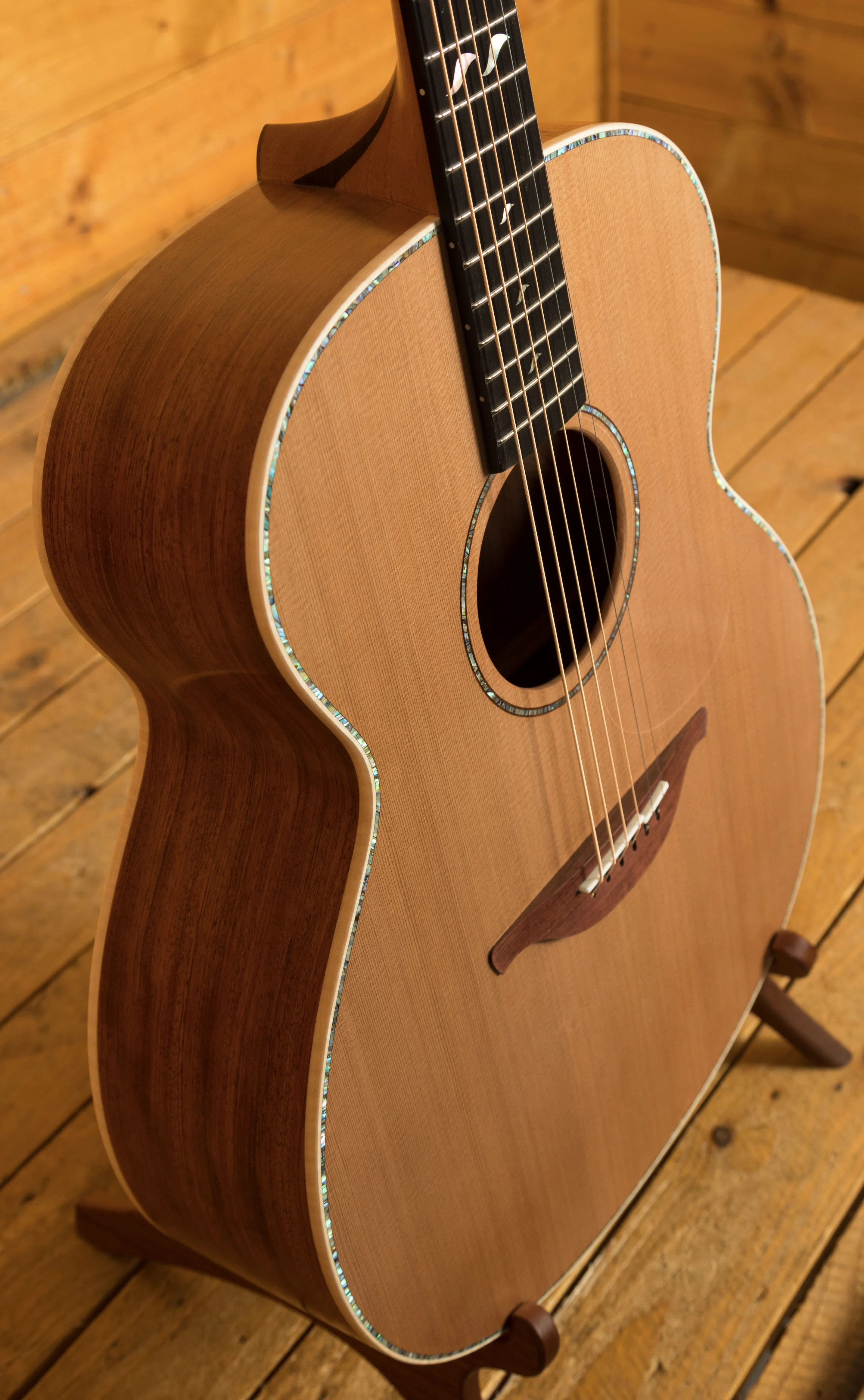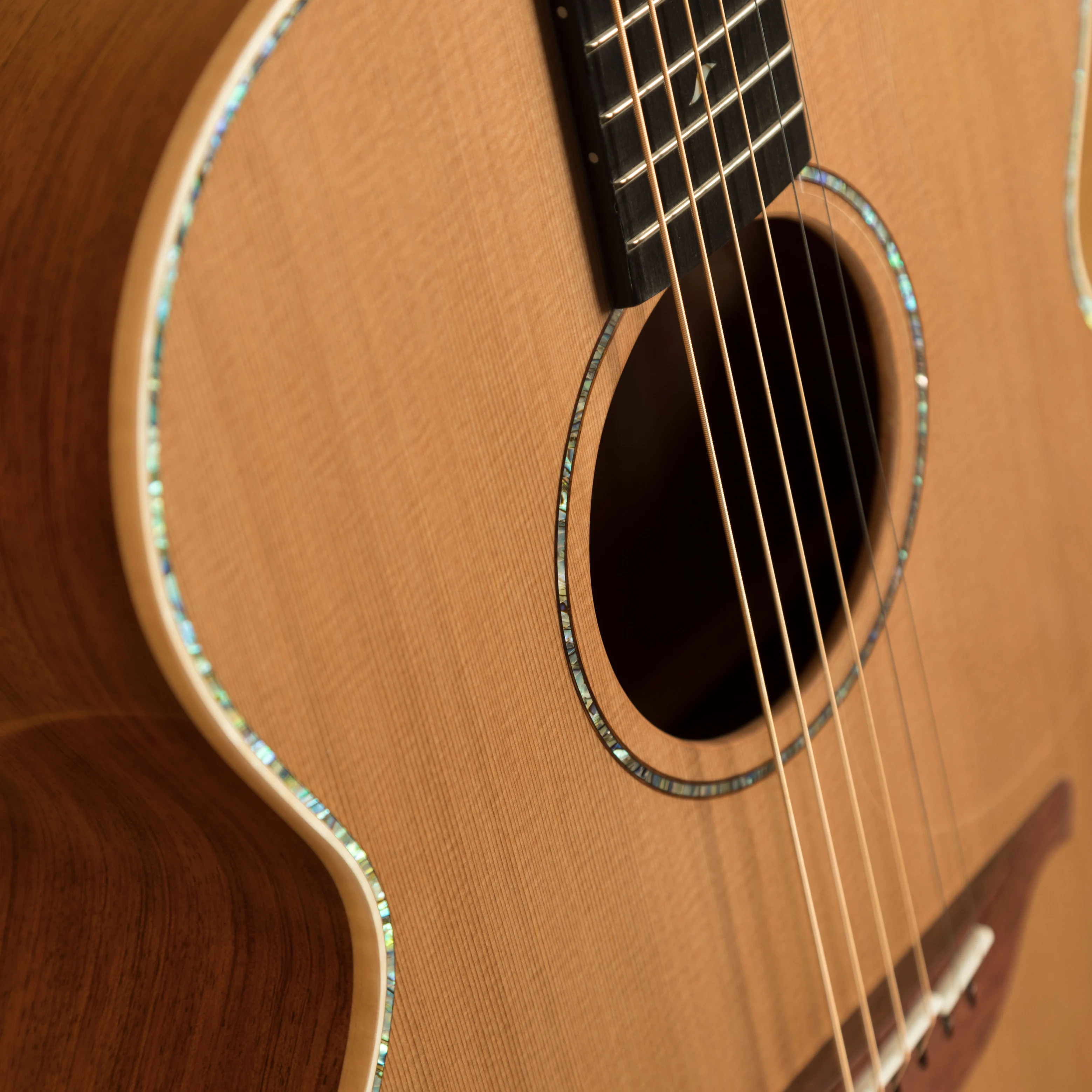 The attention to detail is simply remarkable. Abalone purflings and abalone leaf inlays adorn the fingerboard, adding an elegant touch to the instrument's aesthetic appeal. The soundboard is crafted from the finest Red Cedar, known for its warmth and responsiveness. The 5-piece Mahogany/Rosewood neck provides strength and stability while ensuring a comfortable playing experience. The GL standard neck profile, measuring 45mm at the nut and extending to 57mm at the 14th fret, allows for effortless fretting and optimal hand positioning.