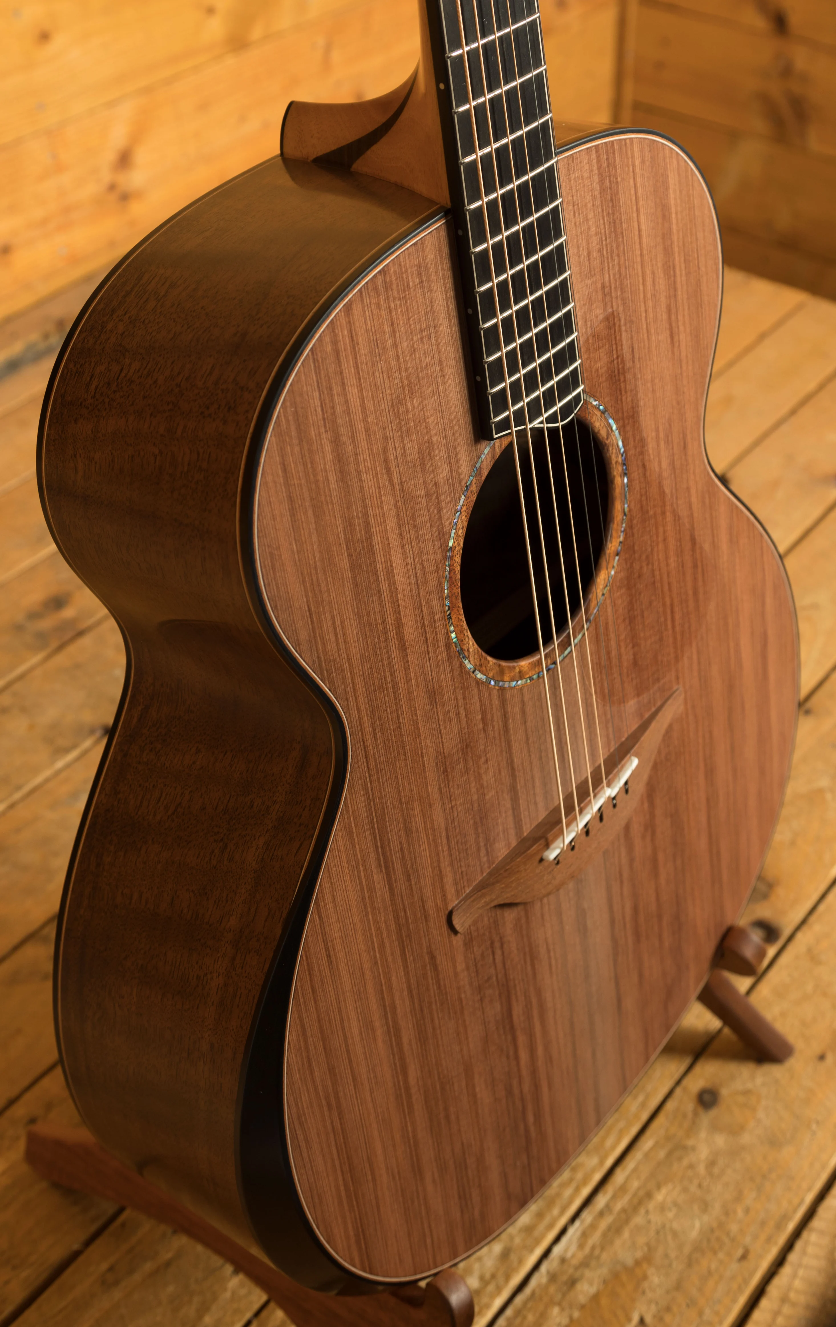 Elegance in Every Detail: The fingerboard is an extended curved end ebony with maple bindings, offering both a luxurious feel and stunning aesthetics. Ebony binding and Mahogany-Maple-Rocklite purflings add the final touches to this magnificent instrument.