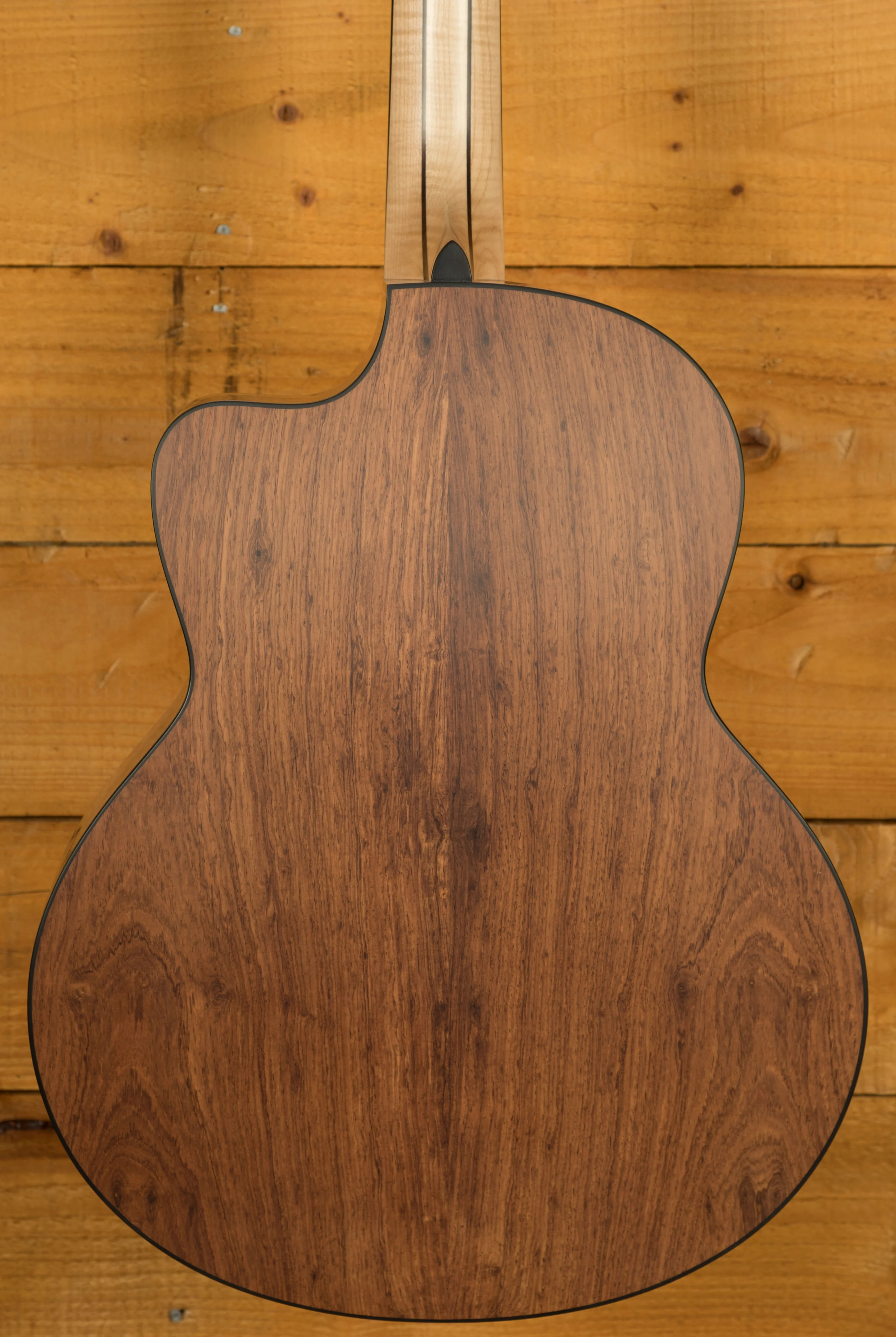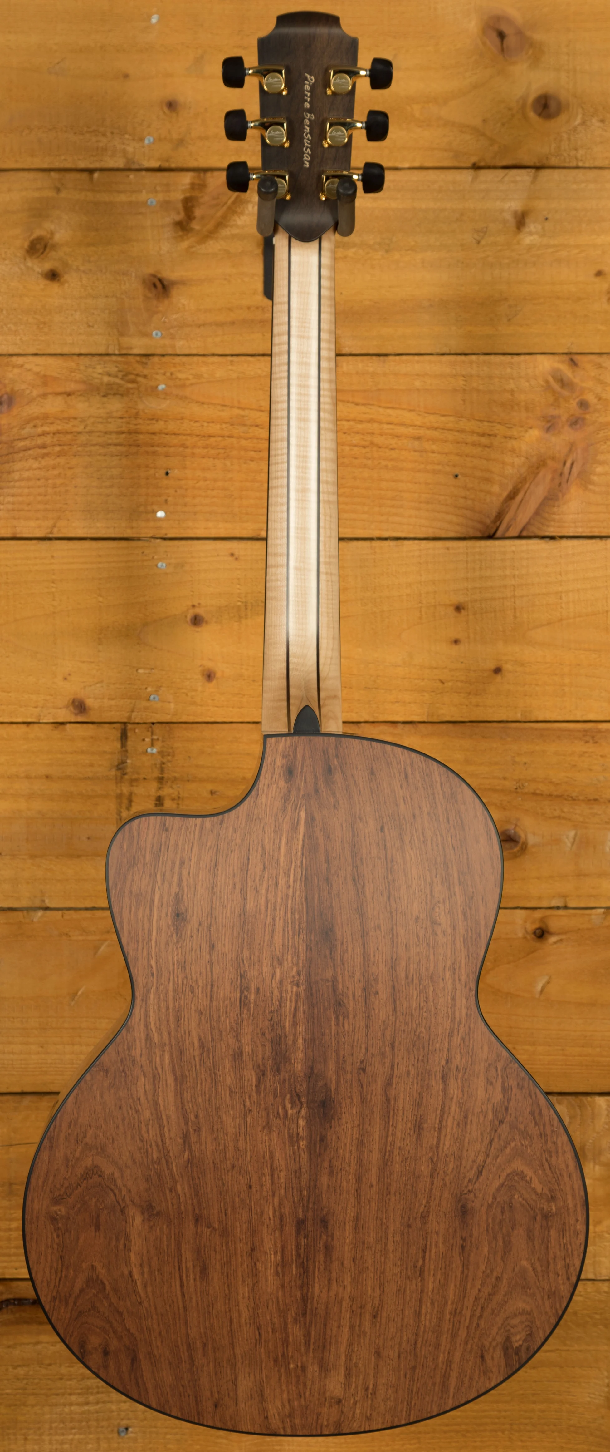 Every aspect of the Pierre Bensusan model exudes excellence and attention to detail. From the Mottled Ebony bindings and rocklite-maple-mahogany purflings to the Gotoh Gold 510 tuners with Ebony buttons, no compromise is made in ensuring the utmost quality and aesthetic appeal. The guitar's design includes a cutaway for enhanced upper fret access and the aforementioned coveted soundbox bevel, a curved piece of wood that rests on the upper bout and provides unparalleled comfort for your arm.