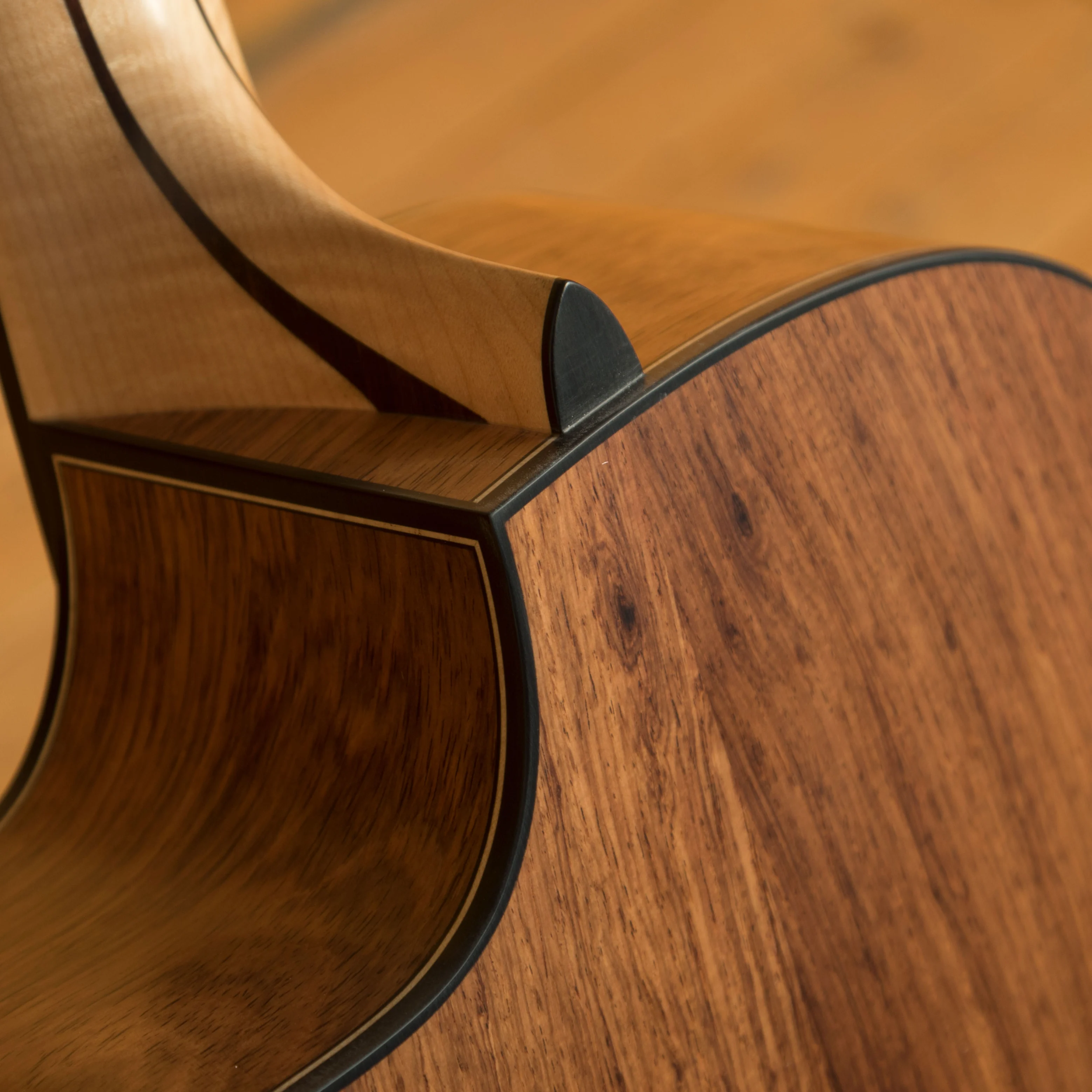 Crafted with utmost precision, the Pierre Bensusan model boasts a 5-piece Maple/Rosewood neck that provides exceptional stability and a unique aesthetic appeal. The fingerboard features a curved-end extended design with Maple bindings, allowing for effortless playability and smooth transitions across the fretboard. The neck profile is tailored for fingerstyle playing, with a wider width at the neck joint (60 mm) to provide ample spacing between the strings, while a shallower carve compensates for the increased width.