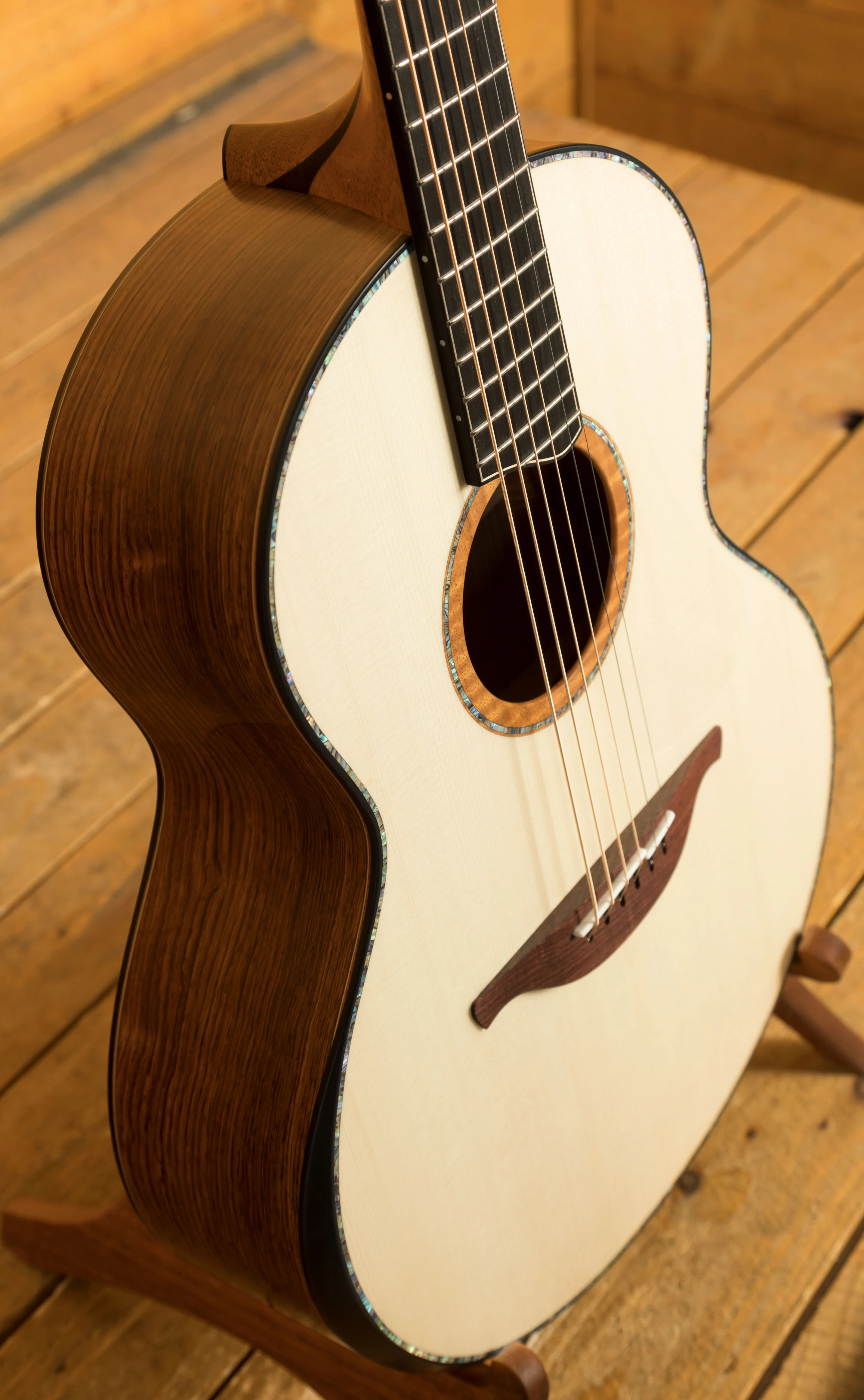 The S-50 model, originally designed for the renowned Nick Webb of Acoustic Alchemy, is a small-bodied guitar with an astonishing tonal range. Unlike other small guitars that often lack volume and can sound boxy, the S-50 defies convention by delivering a rich, resonant sound with exceptional bass response and sustain. It's a true testament to Lowden's ingenuity and expertise in guitar design.