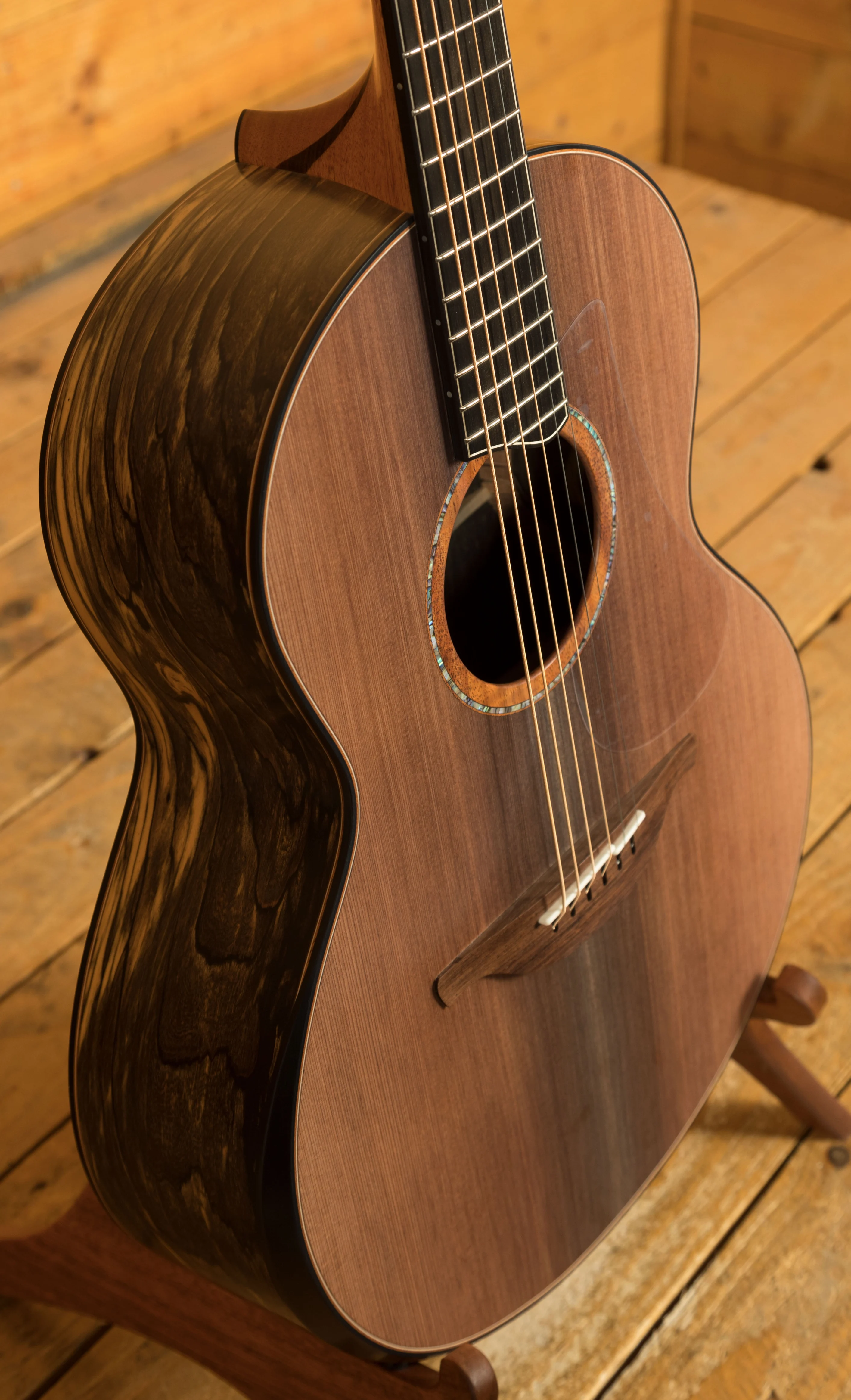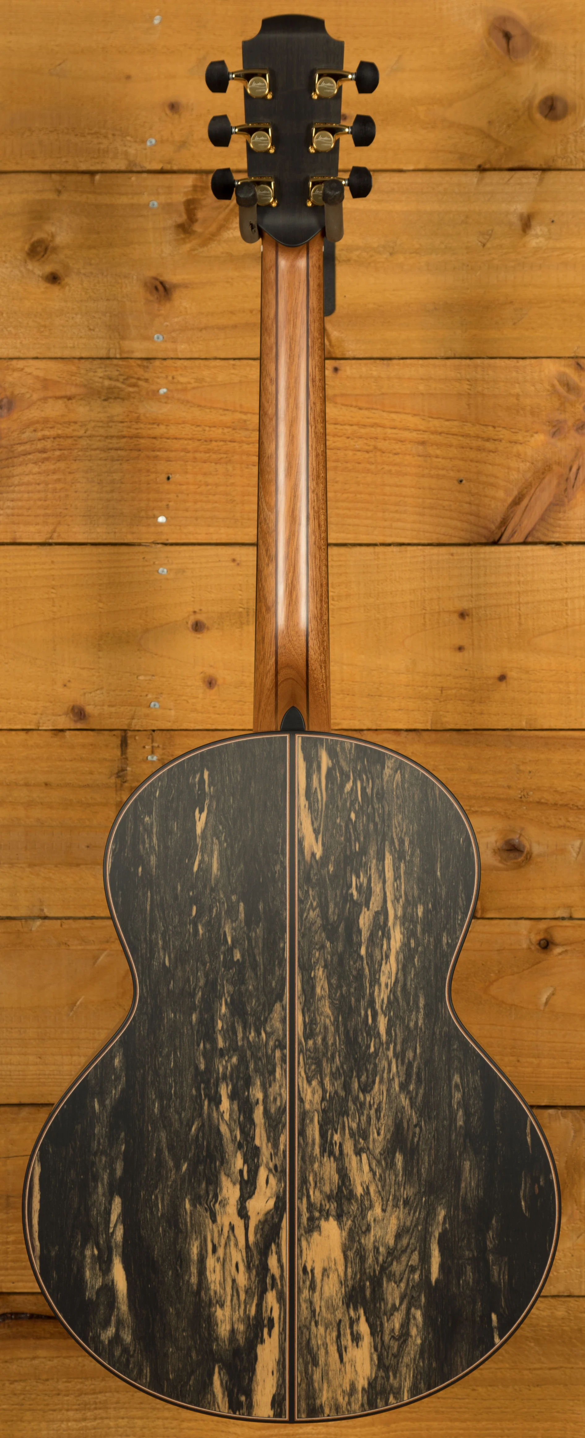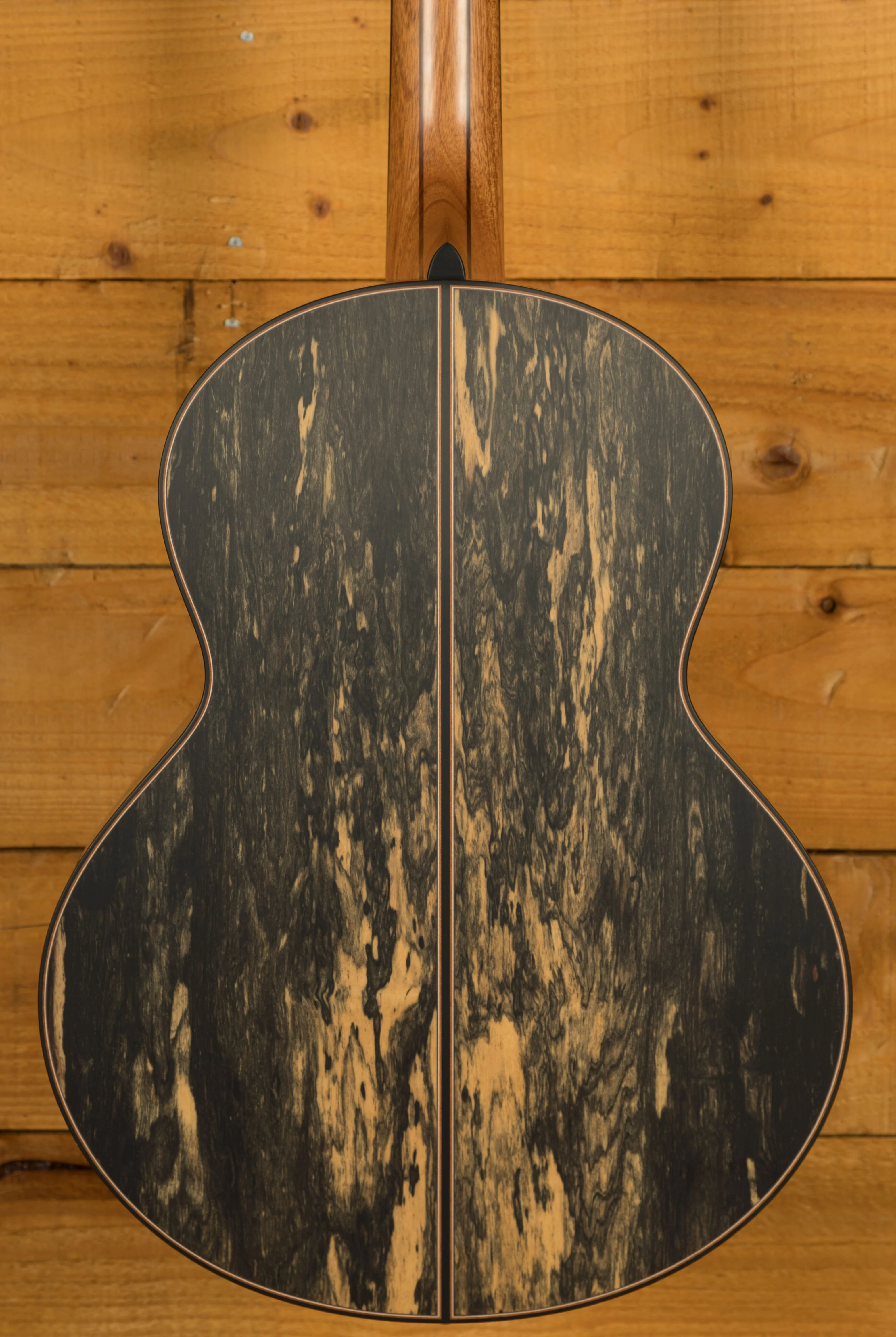 The back and sides are an extremely rare and stunning example of Master Grade Royal Ebony, also known as Pale Moon Ebony. Renowned for its rich tone and captivating beauty, this wood imbues the guitar with exceptional clarity and sustain. The particular set chosen for this guitar showcases a unique play of predominantly dark hues with striking light highlights - the opposite of what one normally finds on a Pale Moon Ebony guitar.