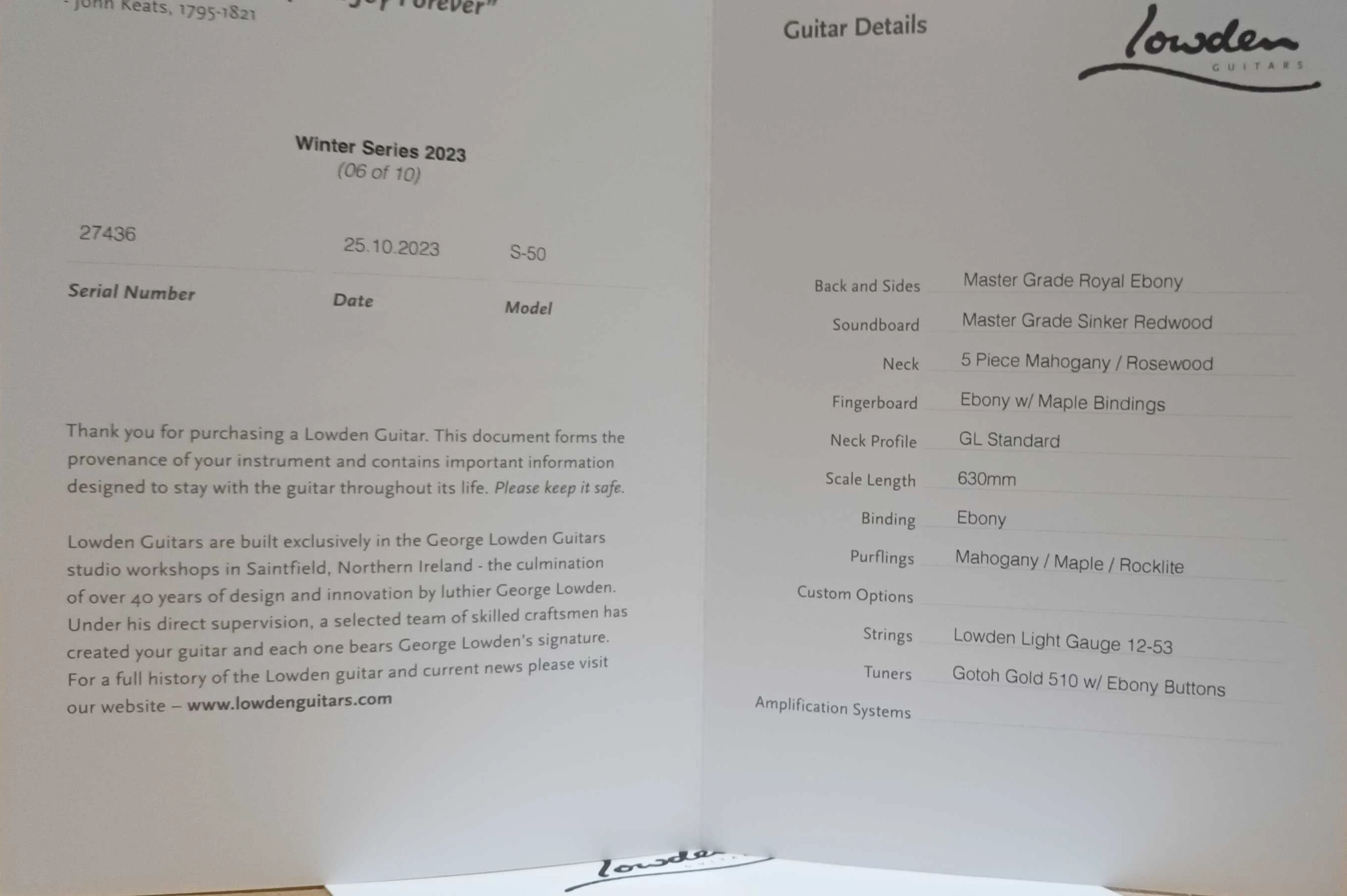 To complete this extraordinary instrument, Gotoh Gold 510 tuners with Ebony buttons and Lowden Light Gauge 12-53 strings ensure precision tuning and playability. With only 10 Winter Limited Edition 2023 models made worldwide (just two of which are S-50s) this is a testament to Lowden's commitment to unparalleled quality and sonic excellence.
