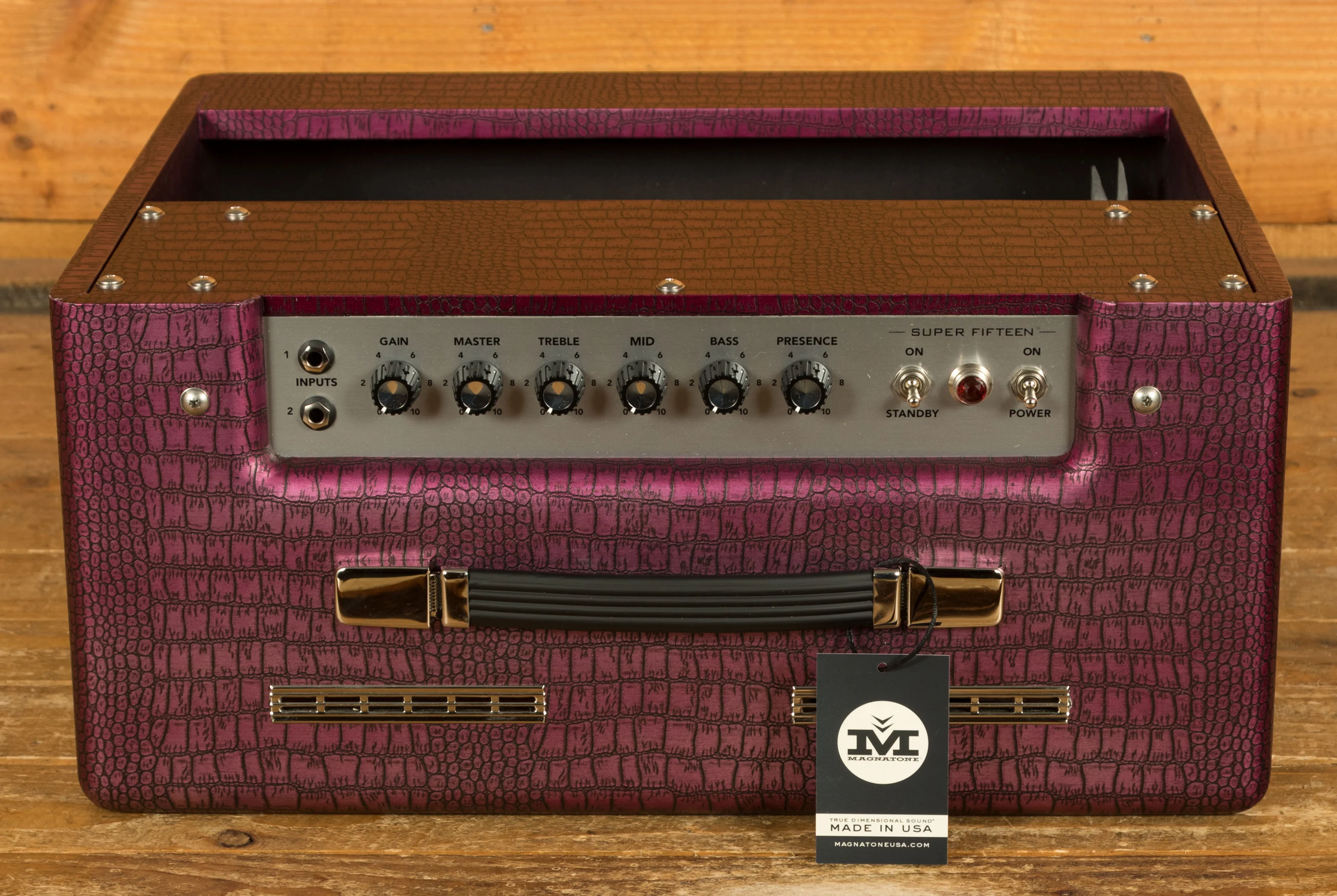 The Magnatone Super Fifteen is a compact, professional-grade guitar amplifier that delivers 15 watts of all-tube power via dual EL84s in a push-pull Class AB configuration. Designed for players who want authentic British-style tone in a manageable format, it produces rich chime, detailed sparkle, and responsive gain that performs well in rehearsal rooms, studio environments, or mid-sized live venues. Despite its small footprint, it provides the tone and dynamics of a much larger amp, making it a practical option for musicians who want quality without compromising on portability.