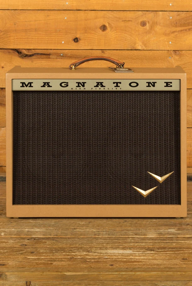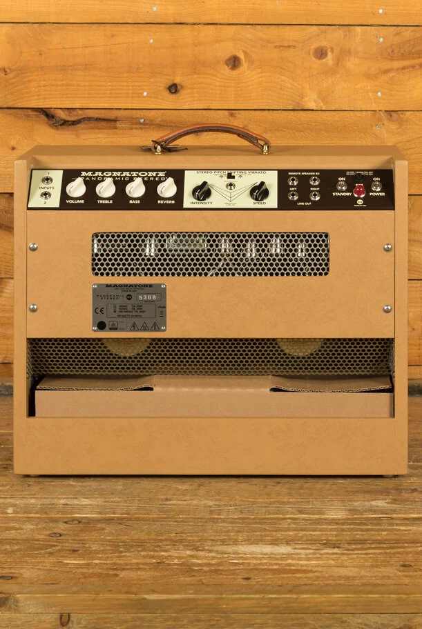 Clothed in the vintage brown and gold cosmetic, the Panoramic Stereo brings the Magnatone stereo experience to a smaller, more convenient size. Two 10" speakers are powered by four EL84s push pull 12 + 12 watts of all tube stereo power for a very compact and wide sounding amplifier.