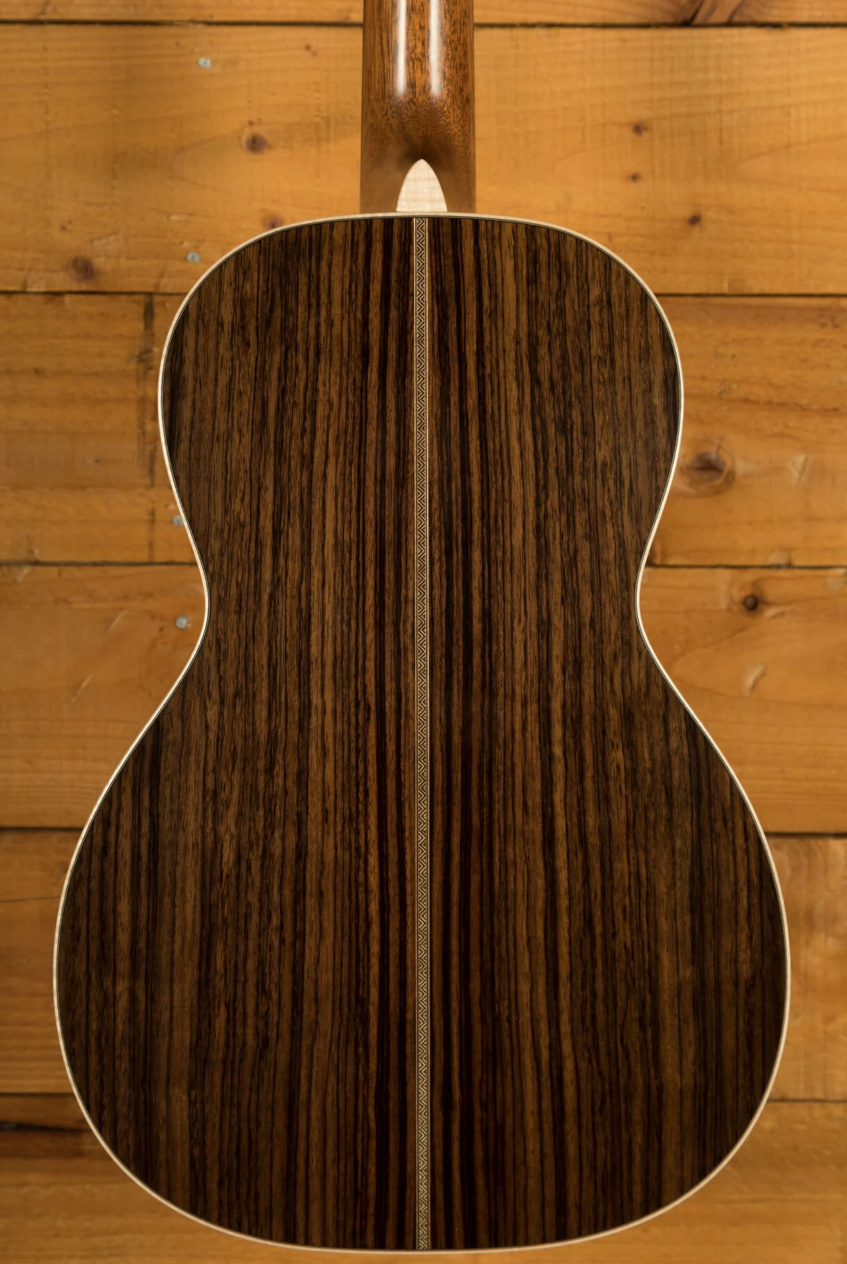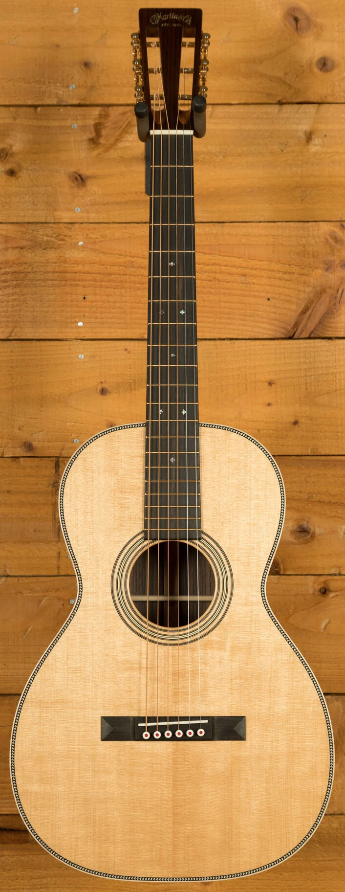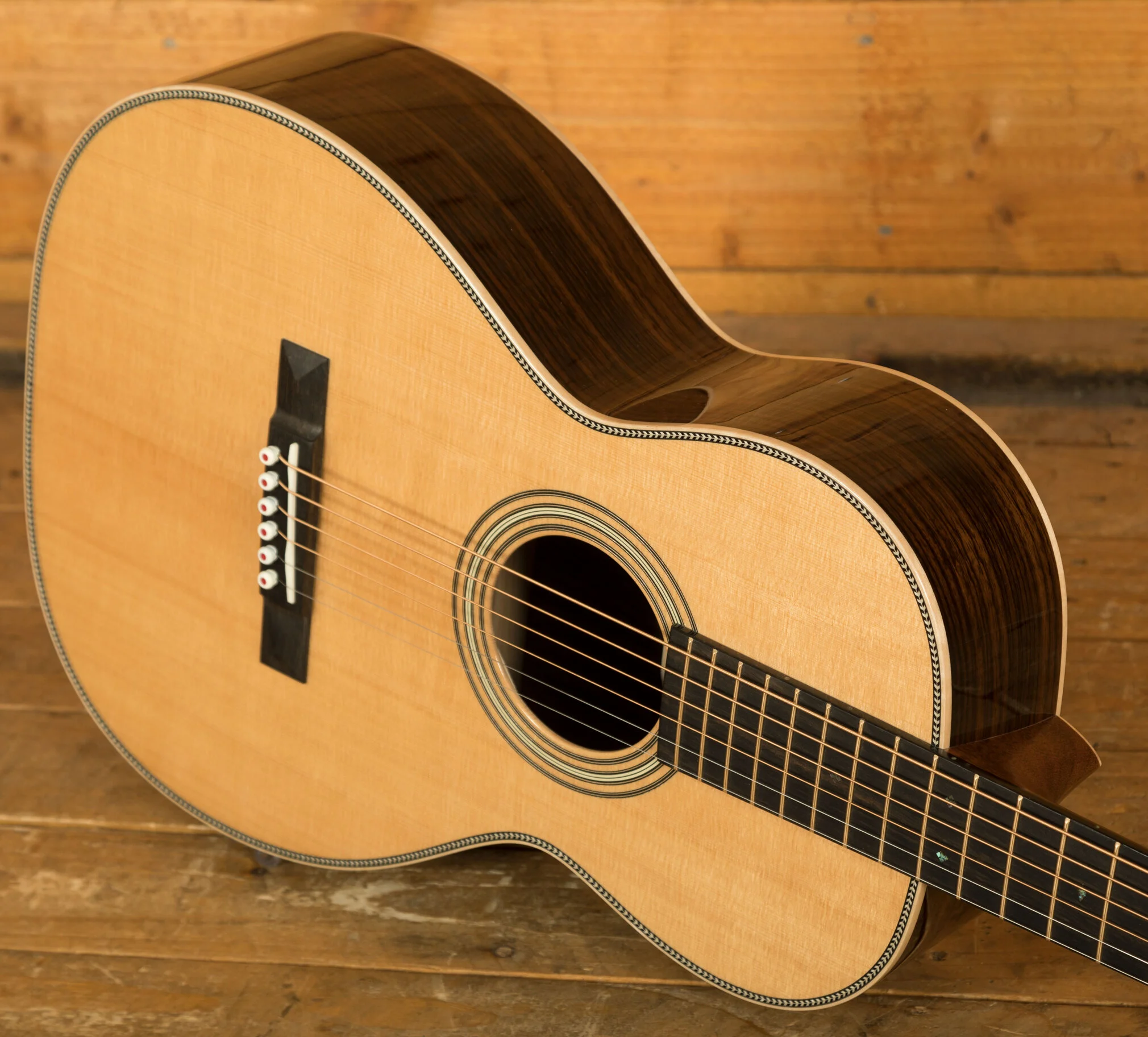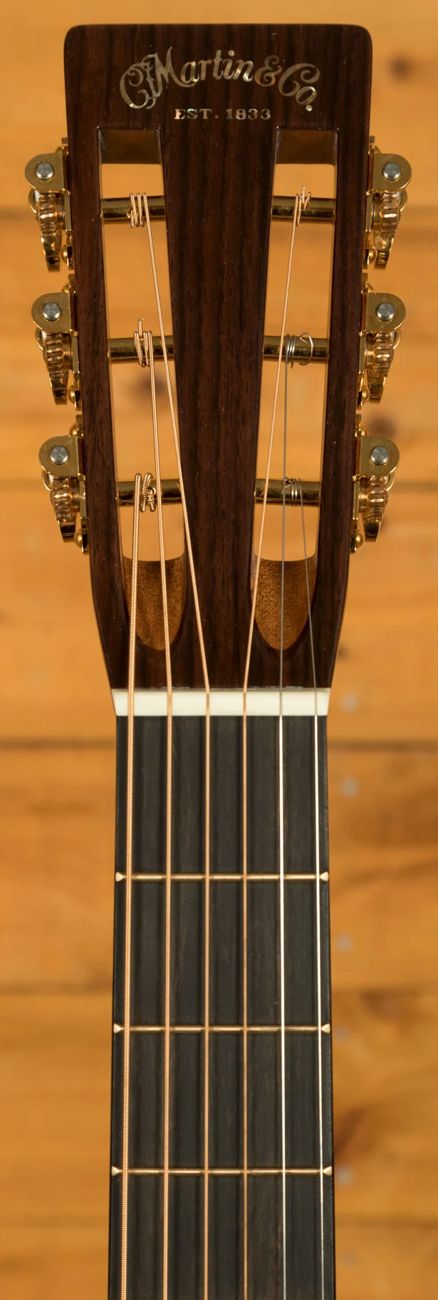 The 012-28 offers an incredible playing experience, making it one of the hottest models in the Modern Deluxe Series. Its packed with tonnes of custom features and modern technology. With an incredible Spruce top you get a really dynamic and vibrant tone. Pair that with the East Indian Rosewood back and sides and you have a tonal dream team, it's visually and tonally stunning. The top also has the amazing VTS treatment, which allows Martin to make a brand new guitar sound like an 80 year old vintage instrument. The top is heat treated to remove the moisture, which allows it to have the quickest response and the most detailed tone. The body is beautifully decorated with European Flame Maple binding and a Bold Herringbone top inlay.