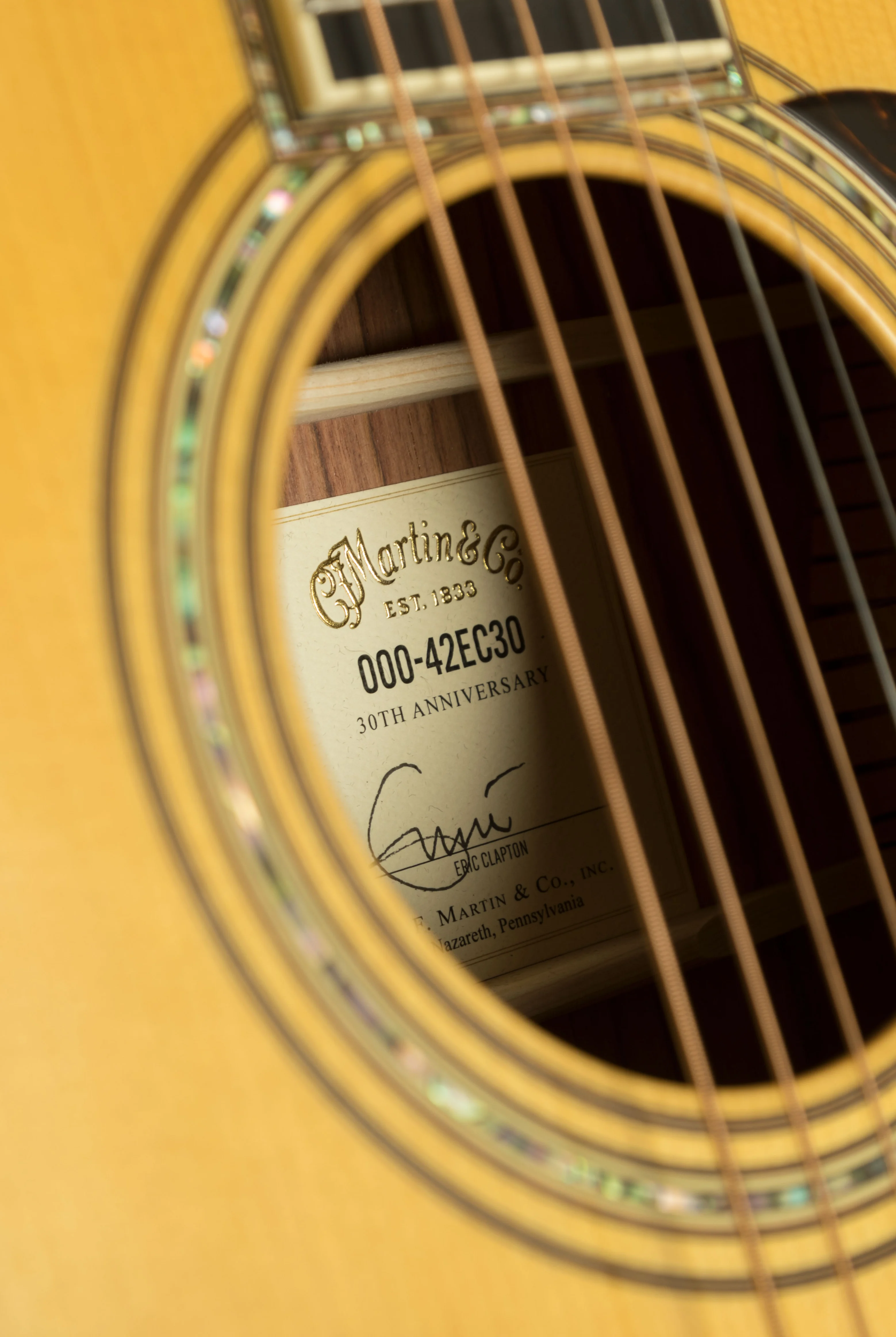 Each limited-edition 000-42EC 30th Anniversary model includes a paper label hand-signed by Eric Clapton and a certificate of authenticity, making it a valuable collector's piece. The guitar comes factory-strung with Clapton's Choice phosphor bronze strings, with an extra set included in the case pocket.
