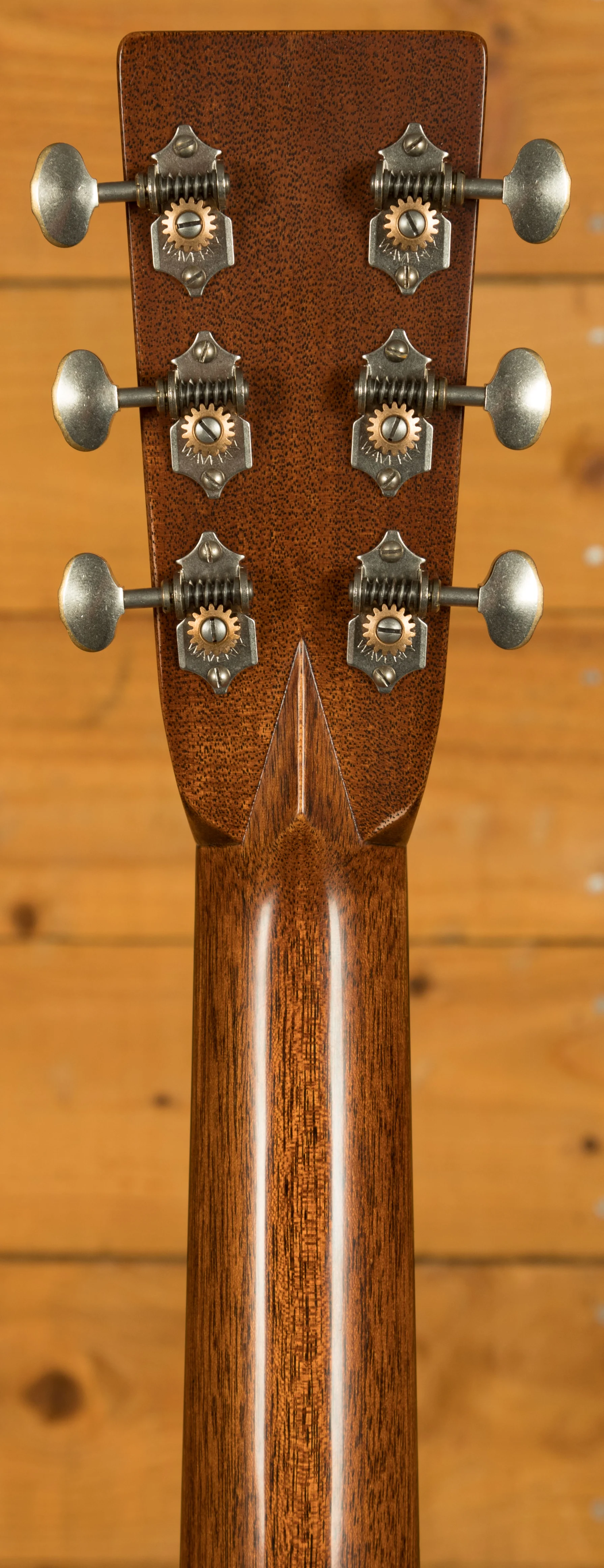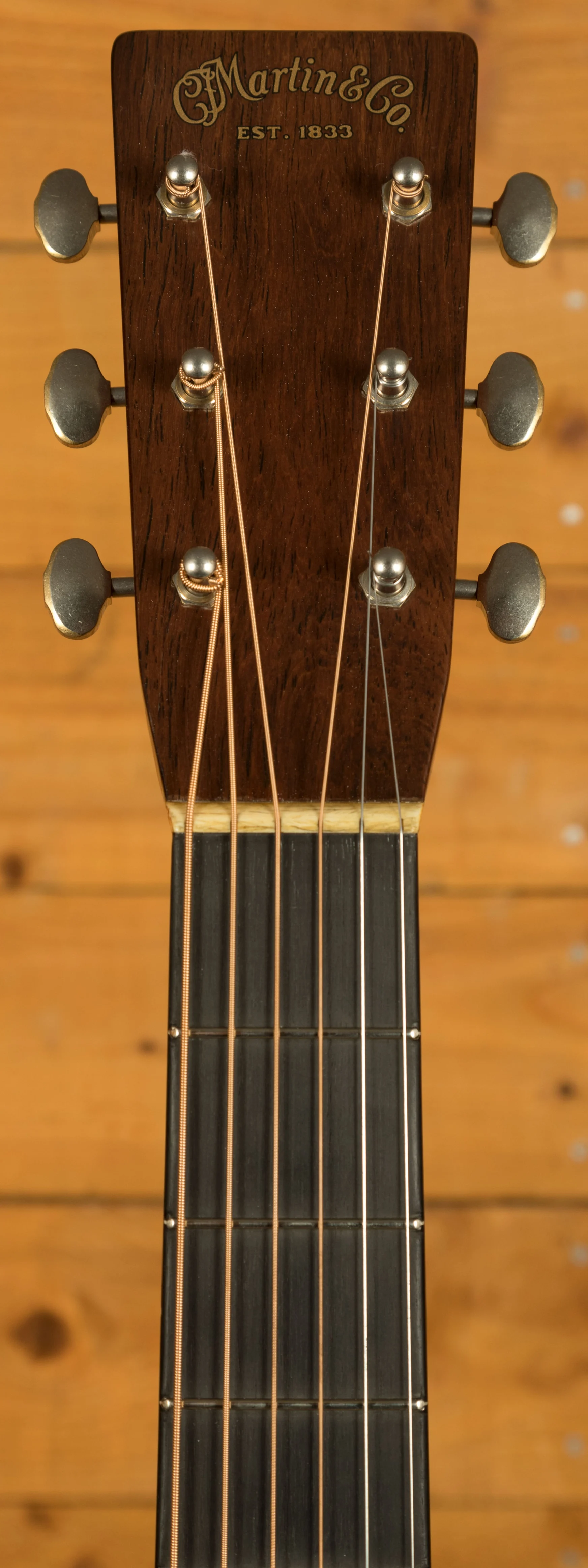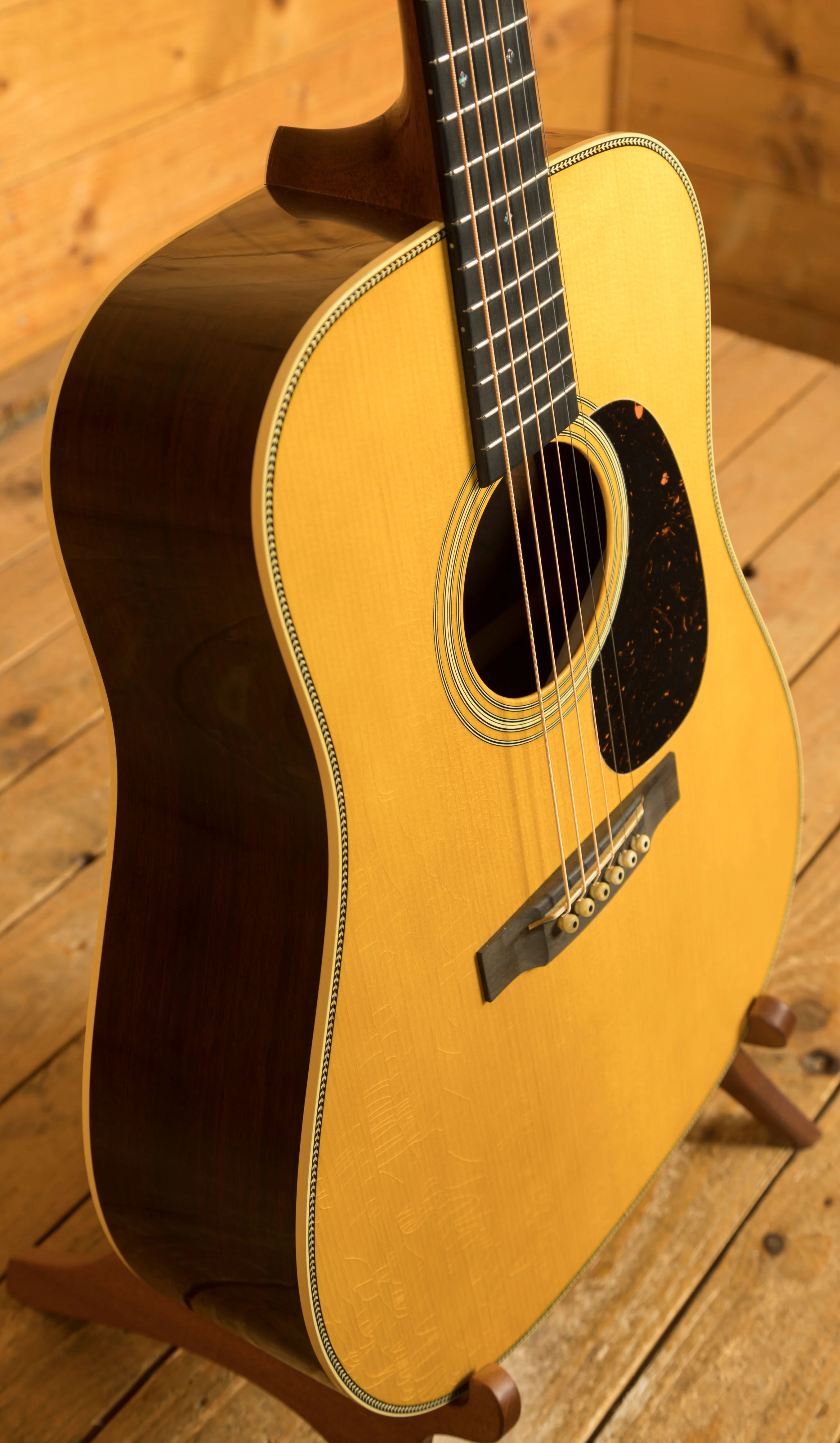 The neck is crafted from genuine mahogany with a D-28 Authentic 1937 Barrel & Heel profile and standard taper, providing a solid and familiar feel for experienced players. The ebony fingerboard features abalone inlays in the Diamond & Square Long style, combining durability with classic aesthetics. Additional premium features include a bone nut and saddle, antique white side dots and binding, aged Waverly nickel open-back tuners, and a 1930-style ebony belly bridge with long saddle.