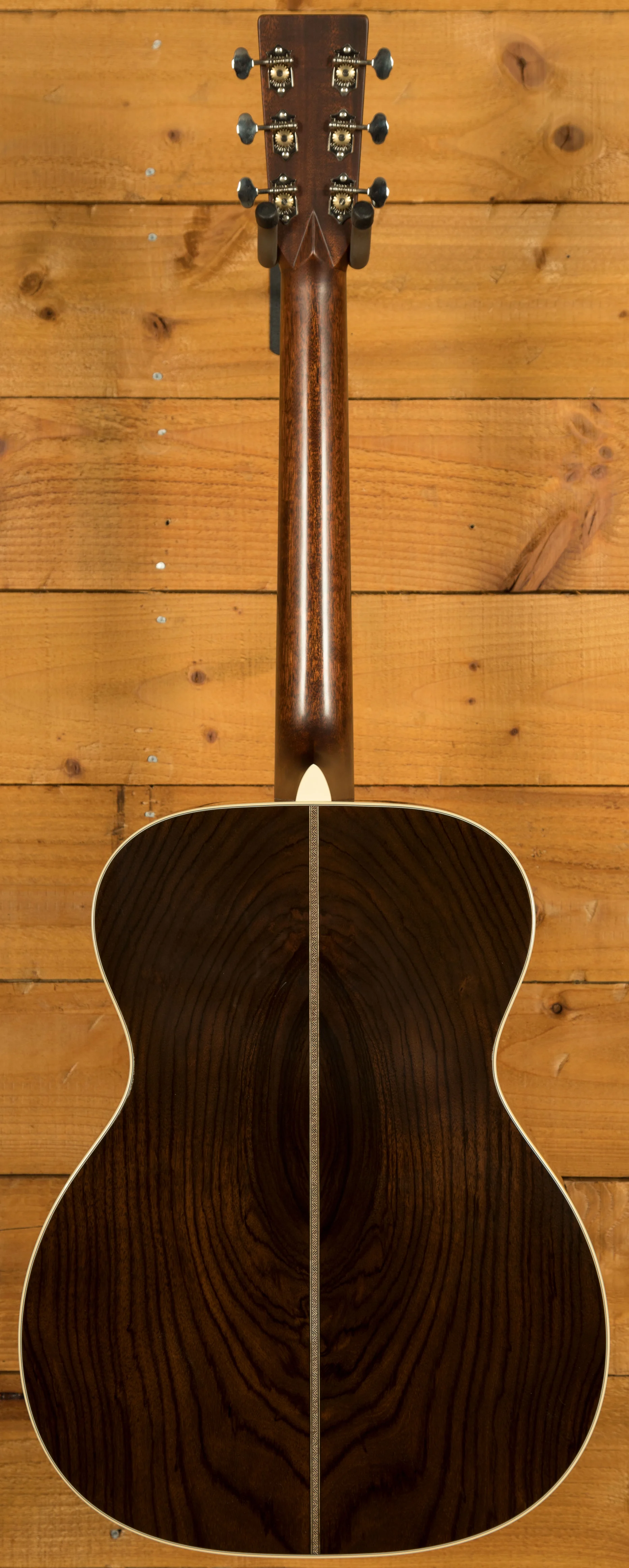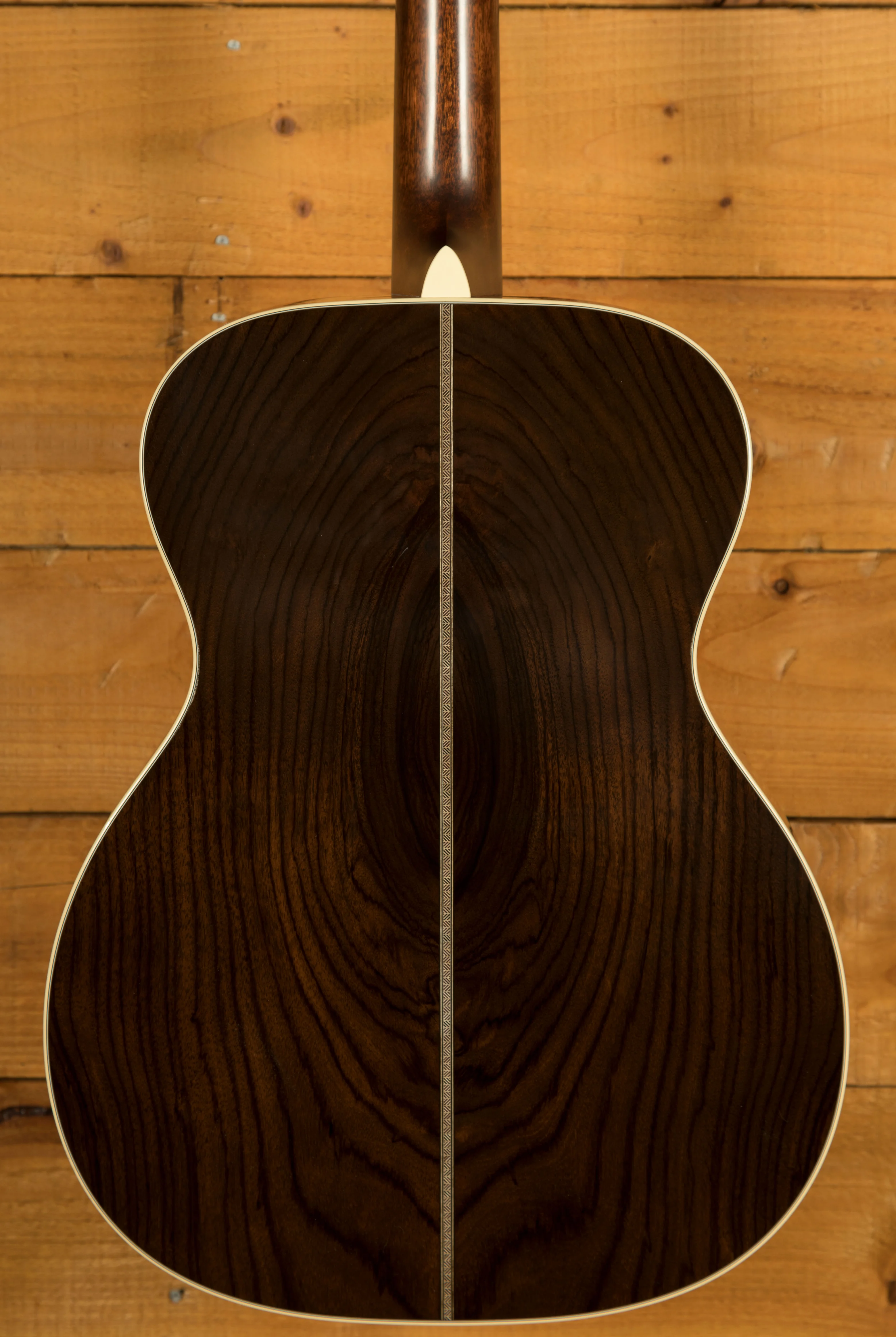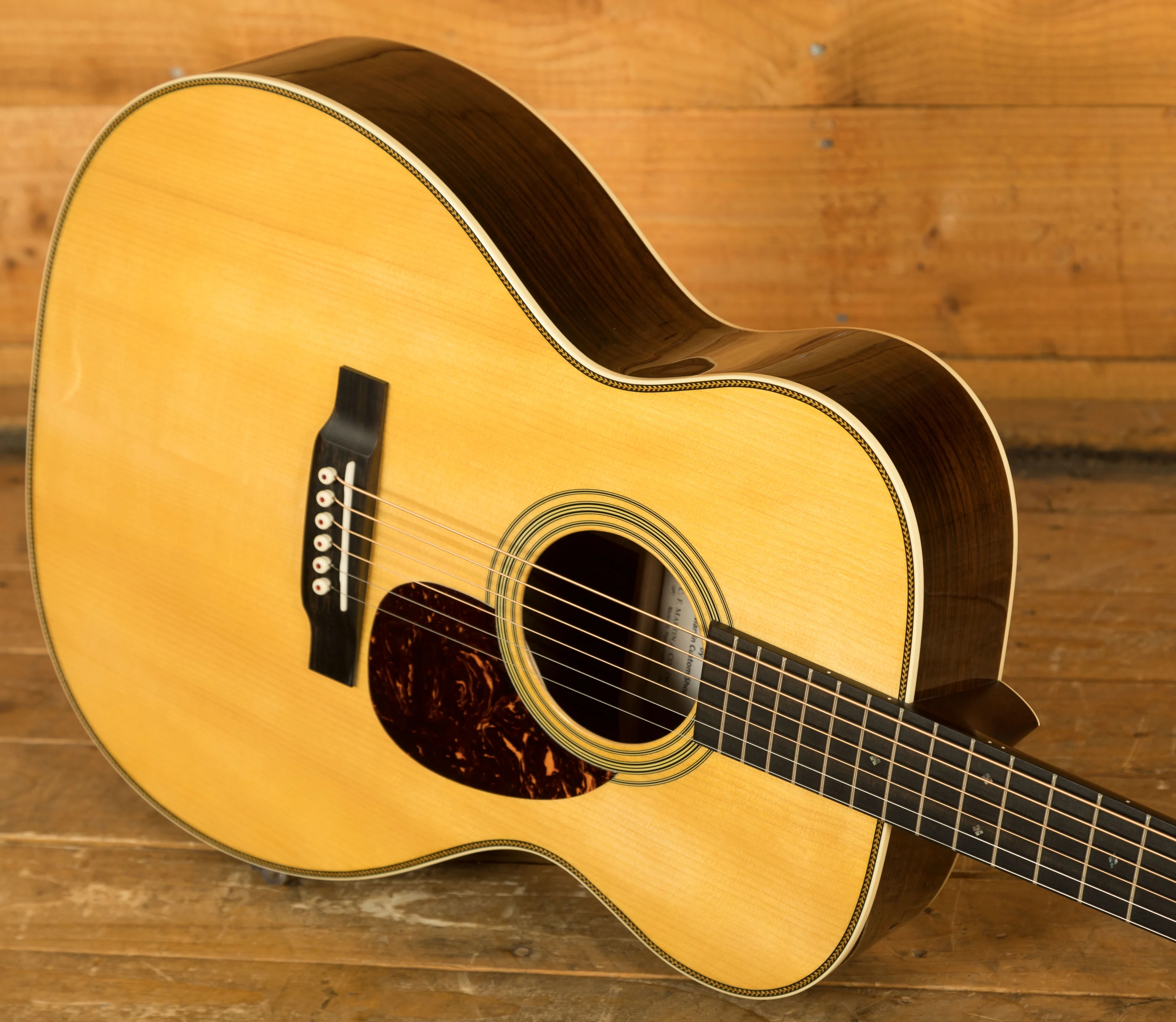 To help capture not only the visual beauty but also the tonal heaven of the Golden Era, Martin have used Adirondack Spruce tops (as opposed to Sitka) and Golden Era X-bracing. Adirondack offers lots of volume and can be pushed hard whilst staying clear and crisp. The Golden Era X-bracing is also made of Adirondack - 1/4" thick but then carefully hand-shaped and scalloped for tonal bliss. This style of bracing was used until around 1945. It is lighter in mass and allows the top to vibrate freely, with extra bass produced. It was stopped as people were using high-gauge strings and Martin wanted to combat the extra-tension this gave to their lightly built guitars by giving extra stiffness to the top braces. This model is made even more unique and special by having highly-figured and truly beautiful Wild Grain East Indian Rosewood back and sides.