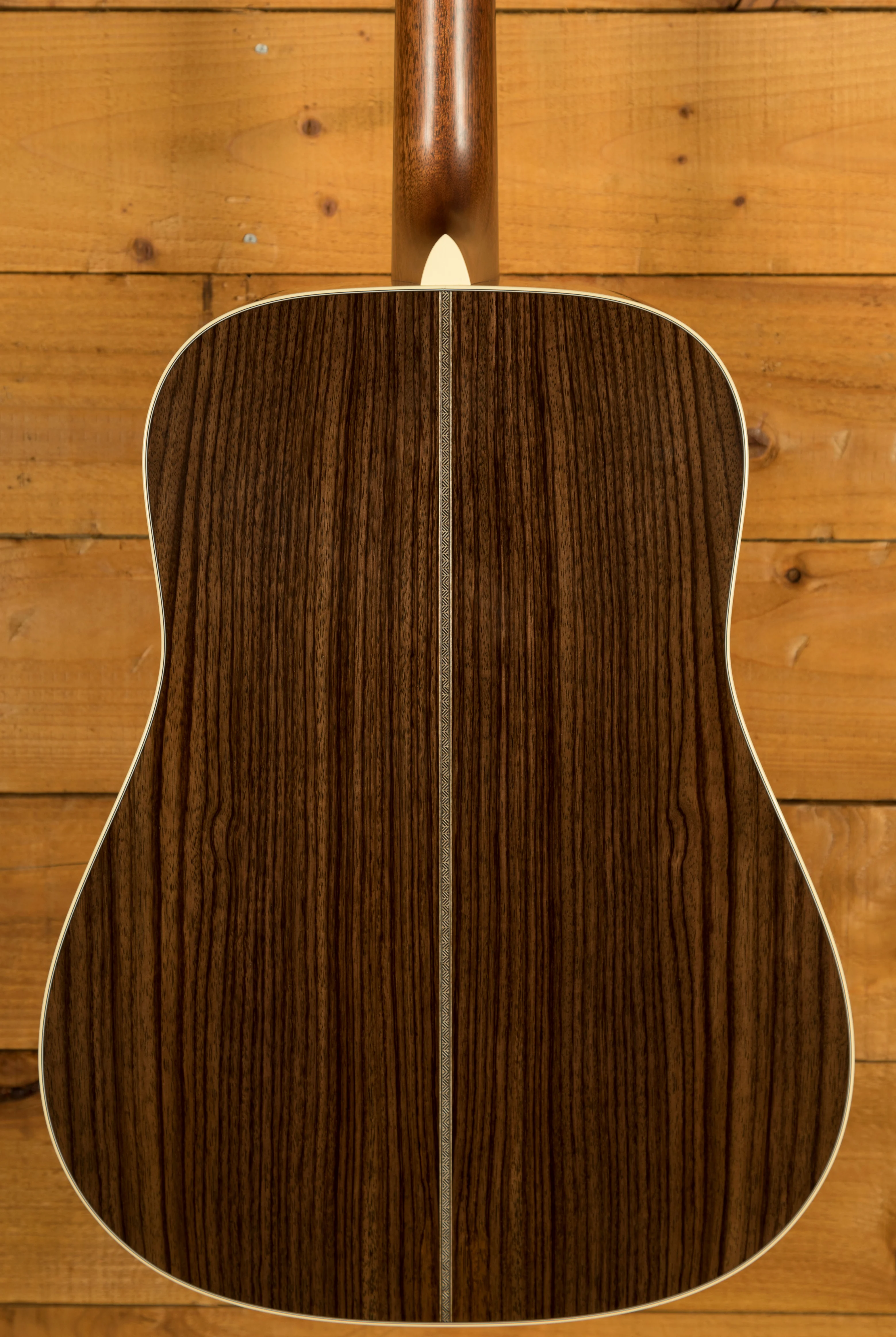 The tonal foundation of the D-28 Billy Strings is built upon the classic combination of solid East Indian rosewood back and sides and a spruce top. This tonewood pairing delivers a rich, resonant tone with a powerful bass response and clear, articulate trebles. This ensures the guitar projects beautifully in any setting, from intimate acoustic performances to larger stage environments. The guitar also features the amazing Golden Era scalloped bracing that helps nail the vintage Martin tone.