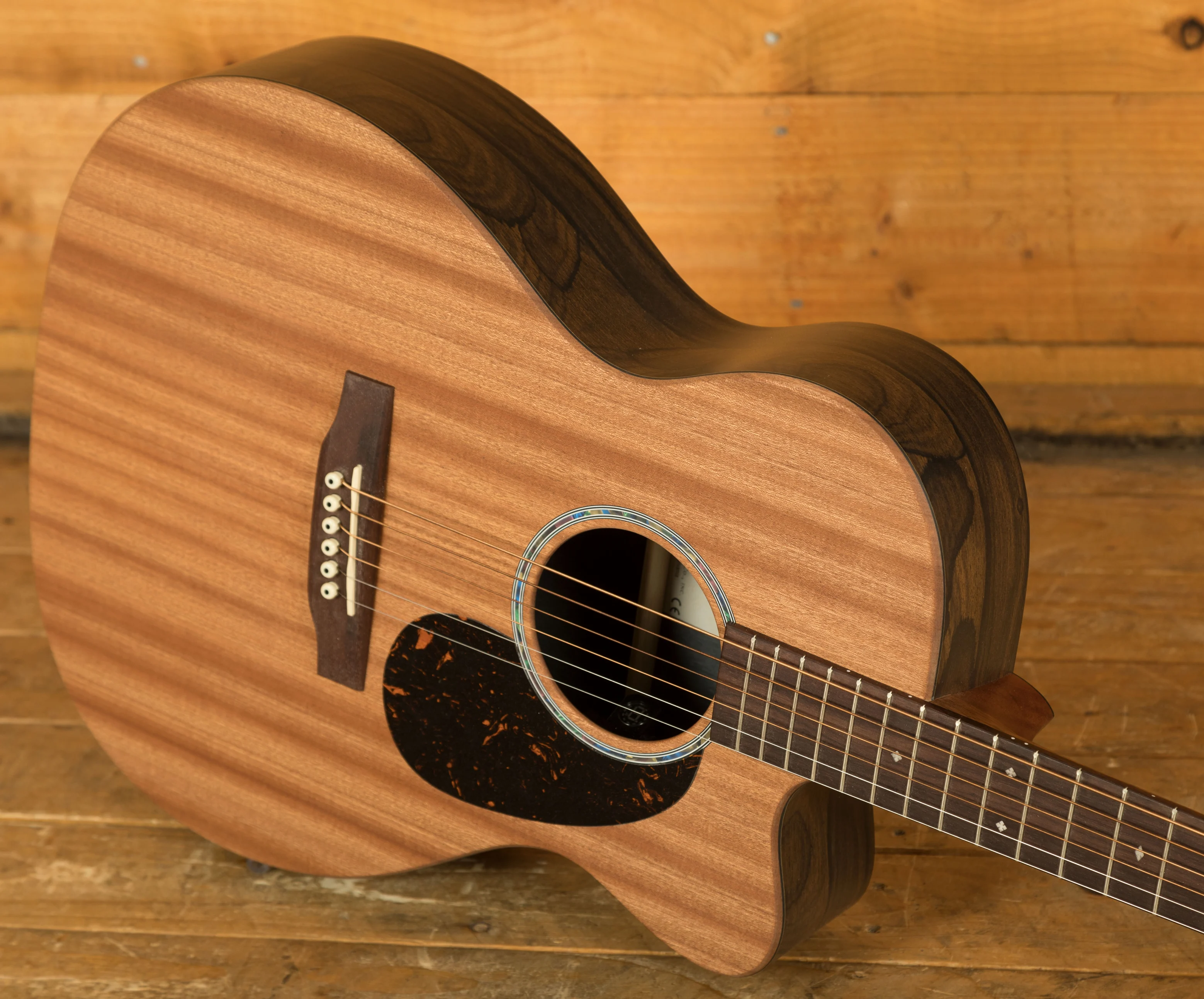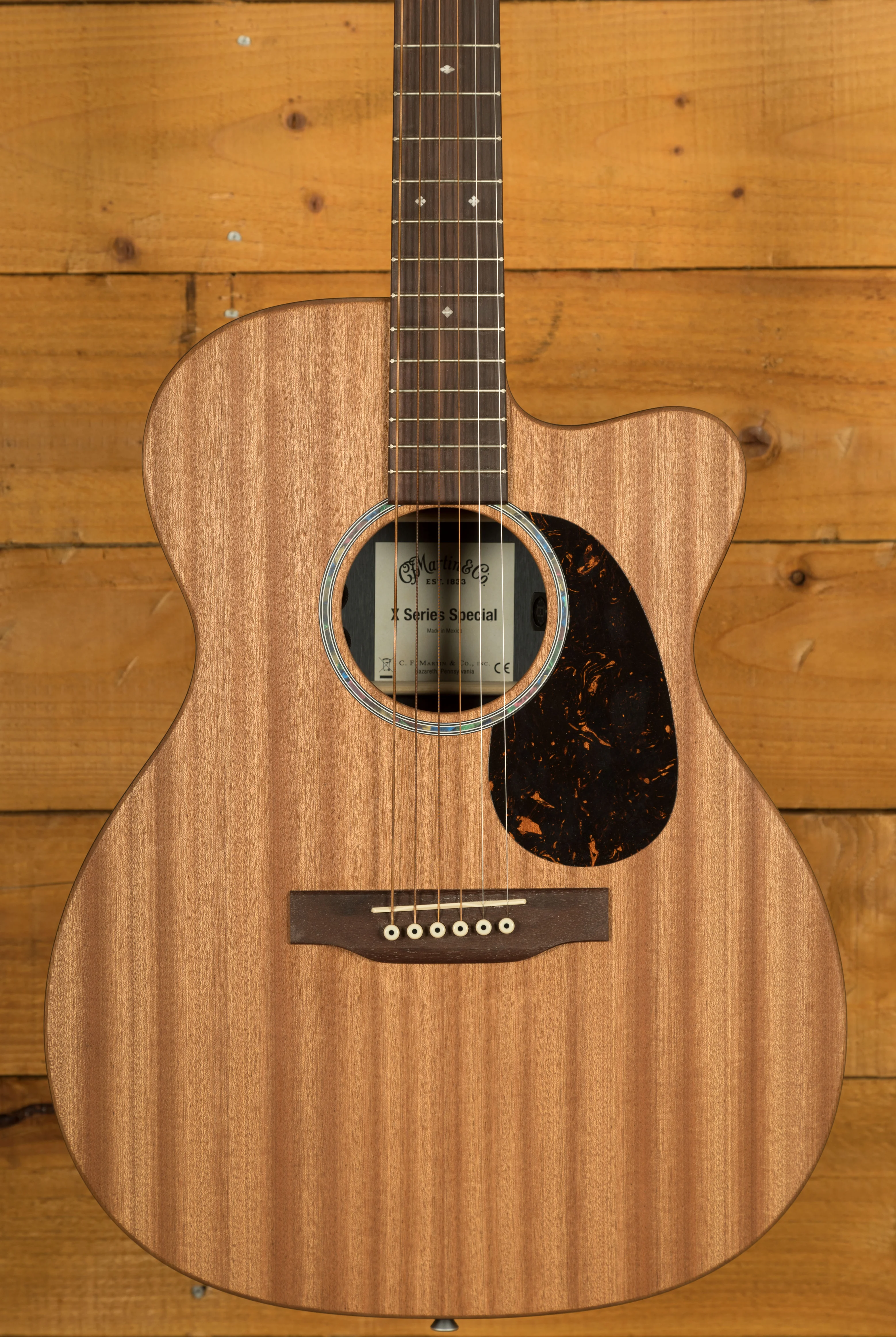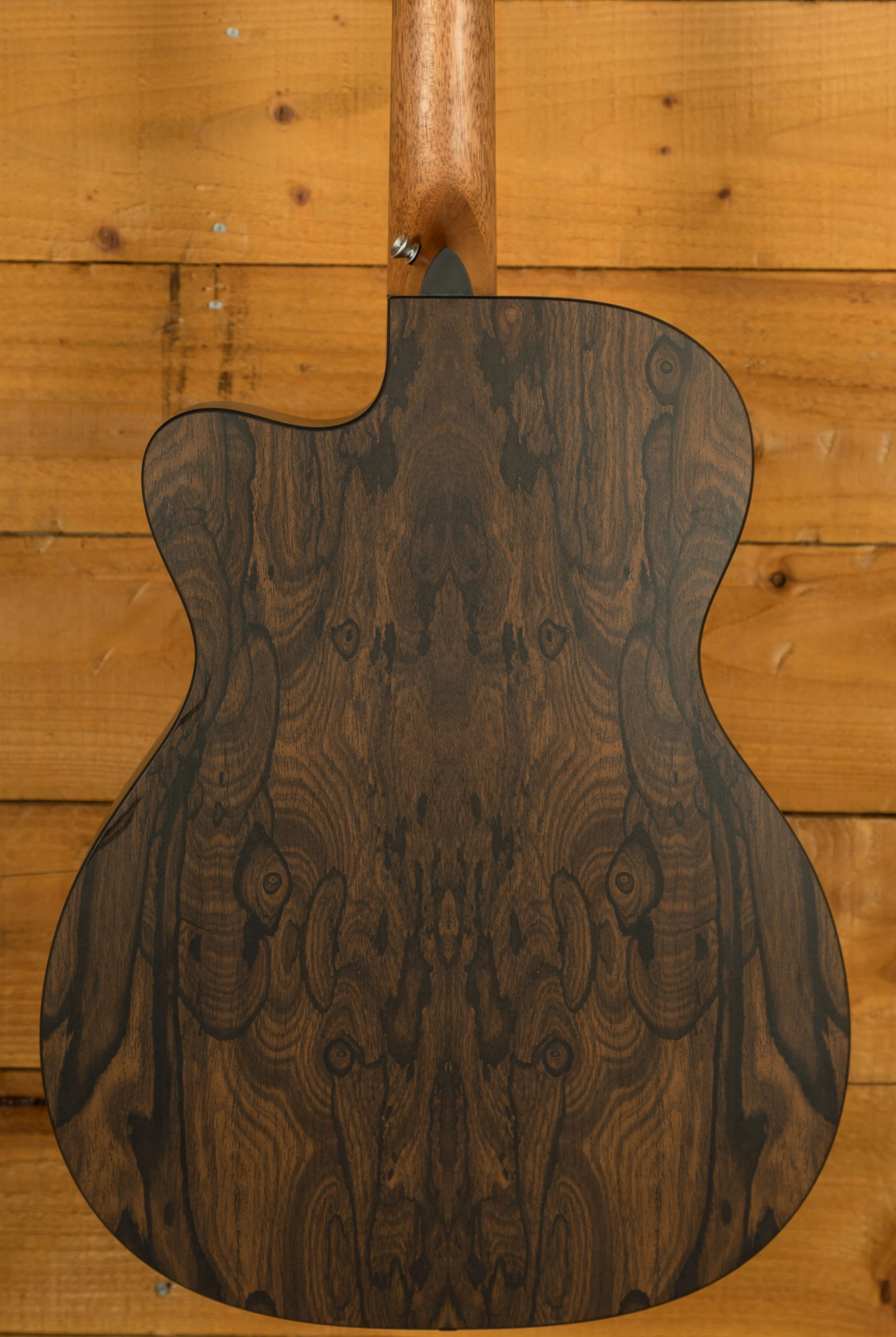 The OMC-X2E features a solid Sapele top, which gives this guitar a lovely warmth and punchy midrange. The Zirizote patterned HPL back and sides looks stunning and compliment the Sapele brilliantly. Inside the guitar you’ll find scalloped x-bracing, which helps to enhance resonance and the overall tone of the guitar.