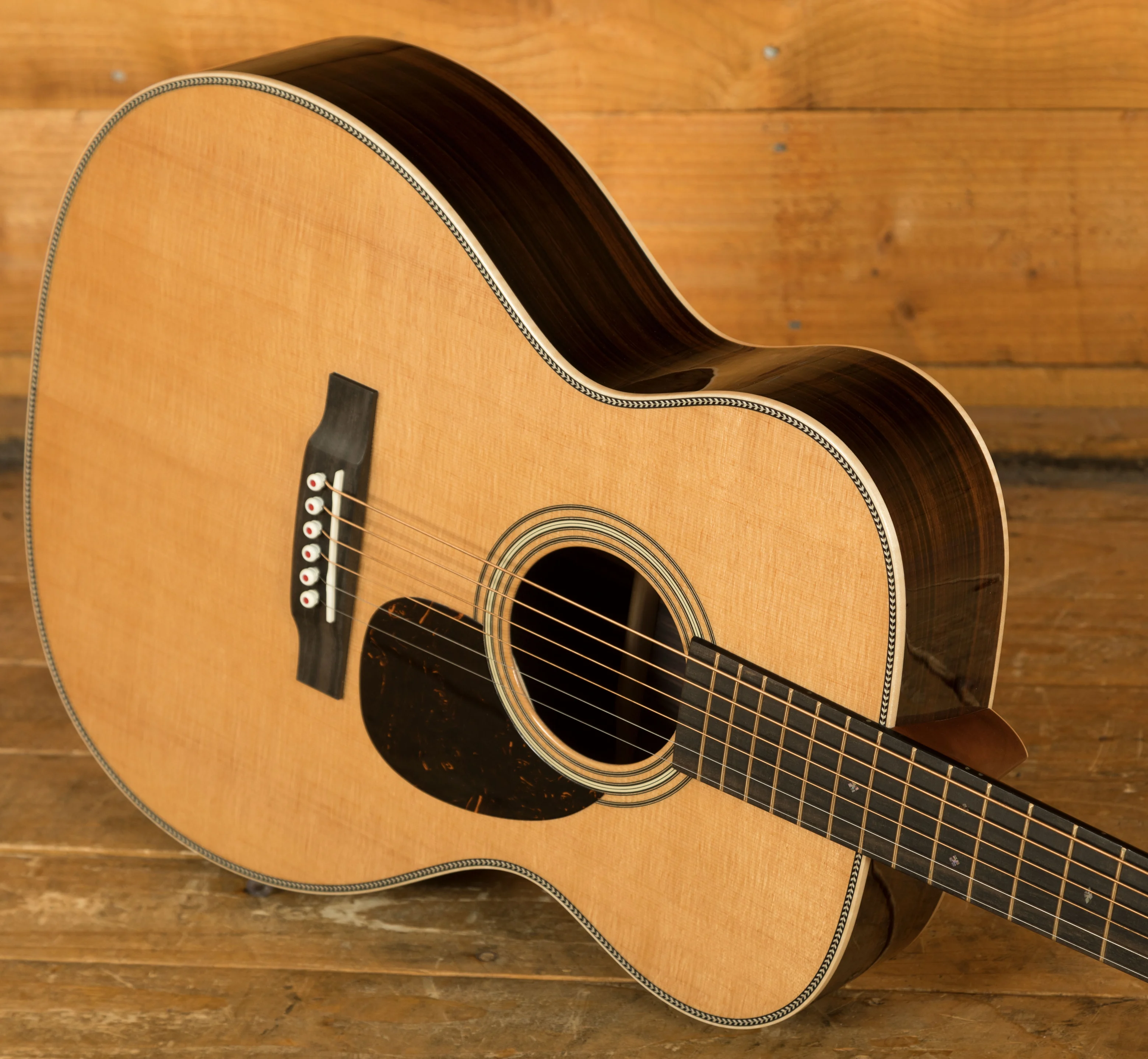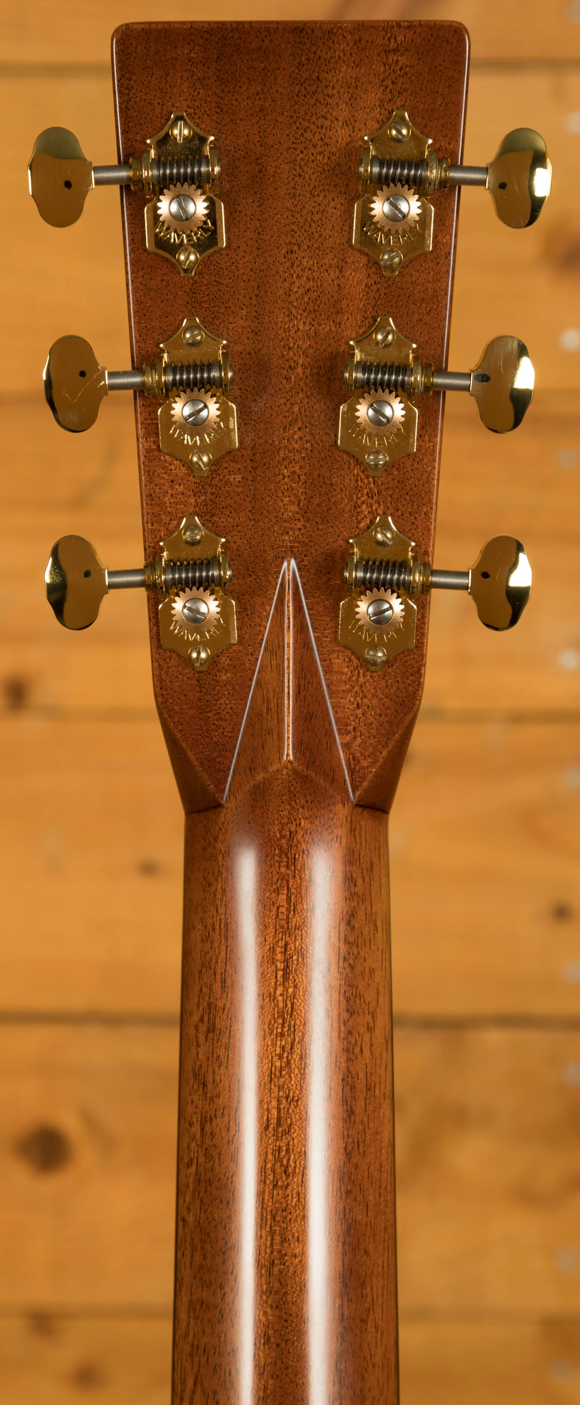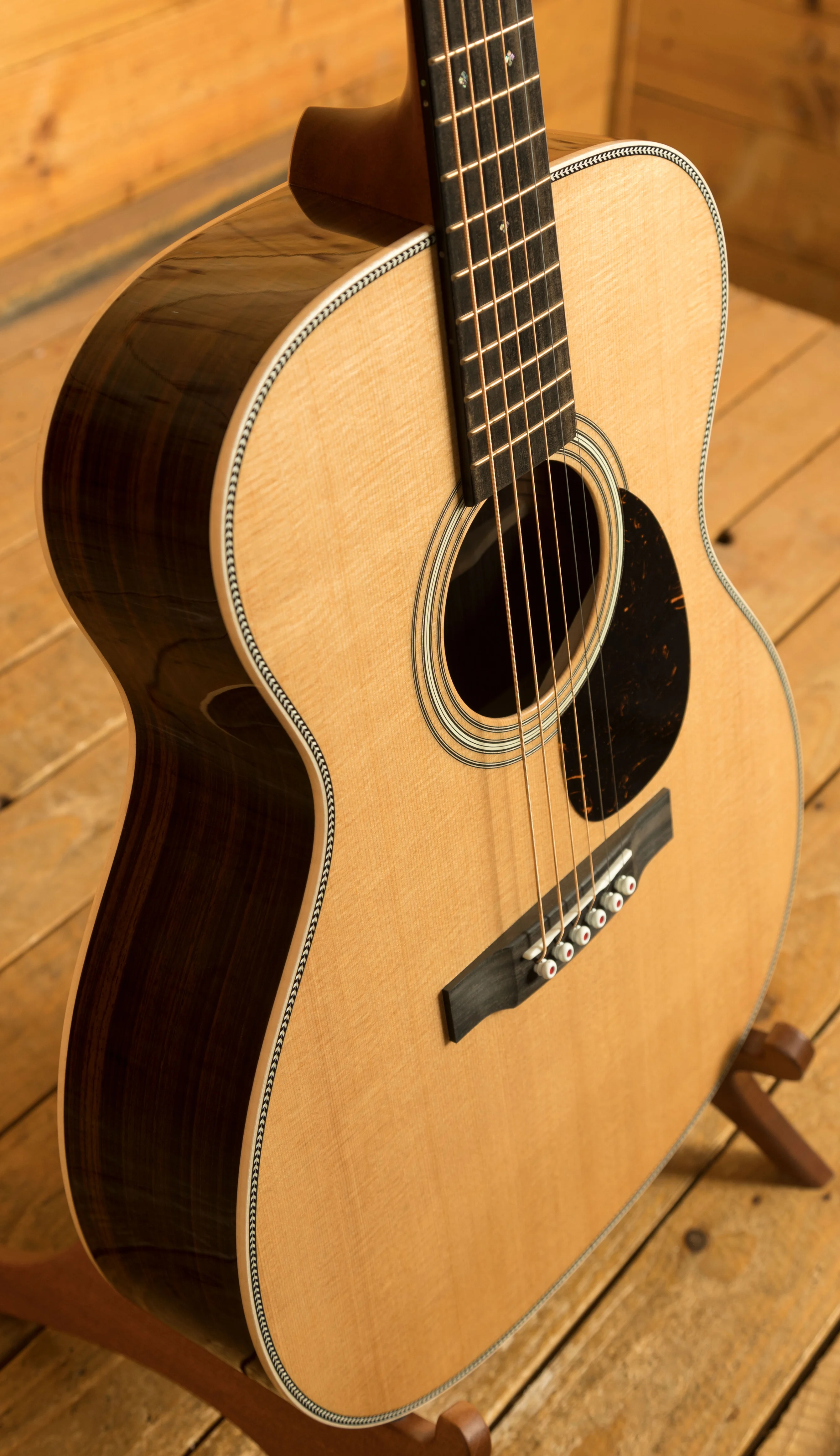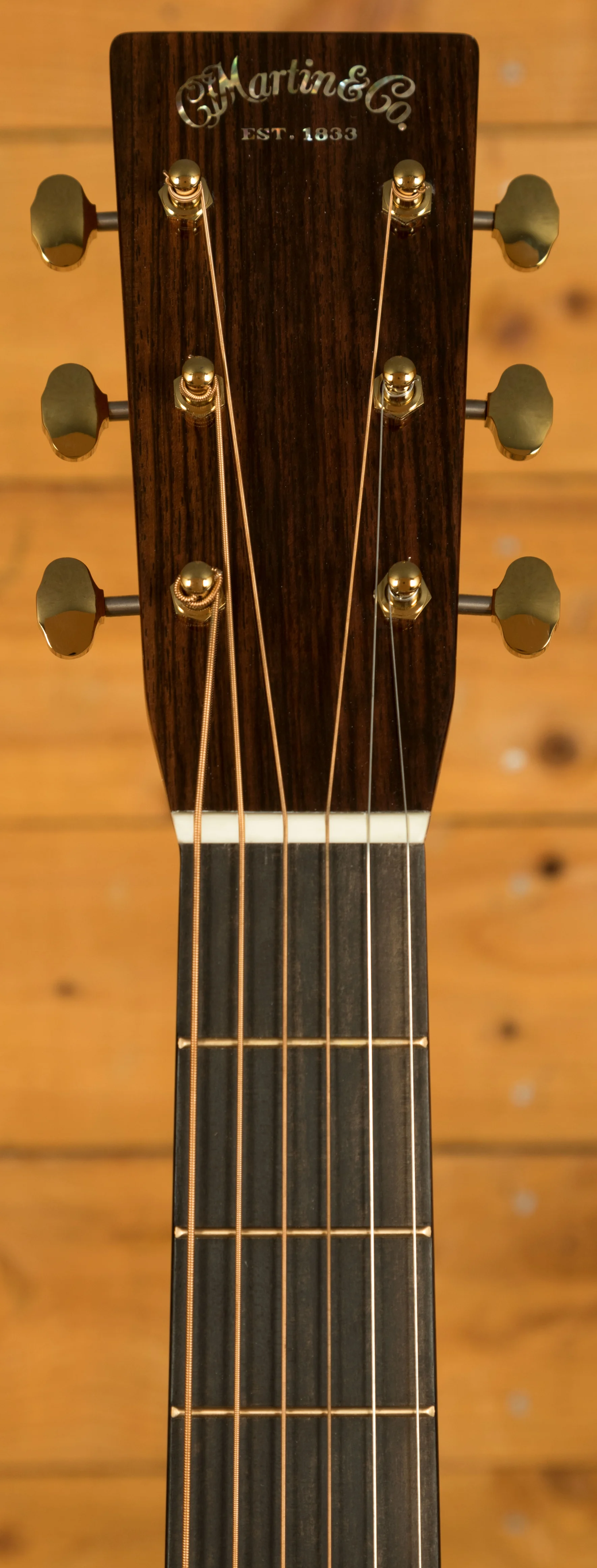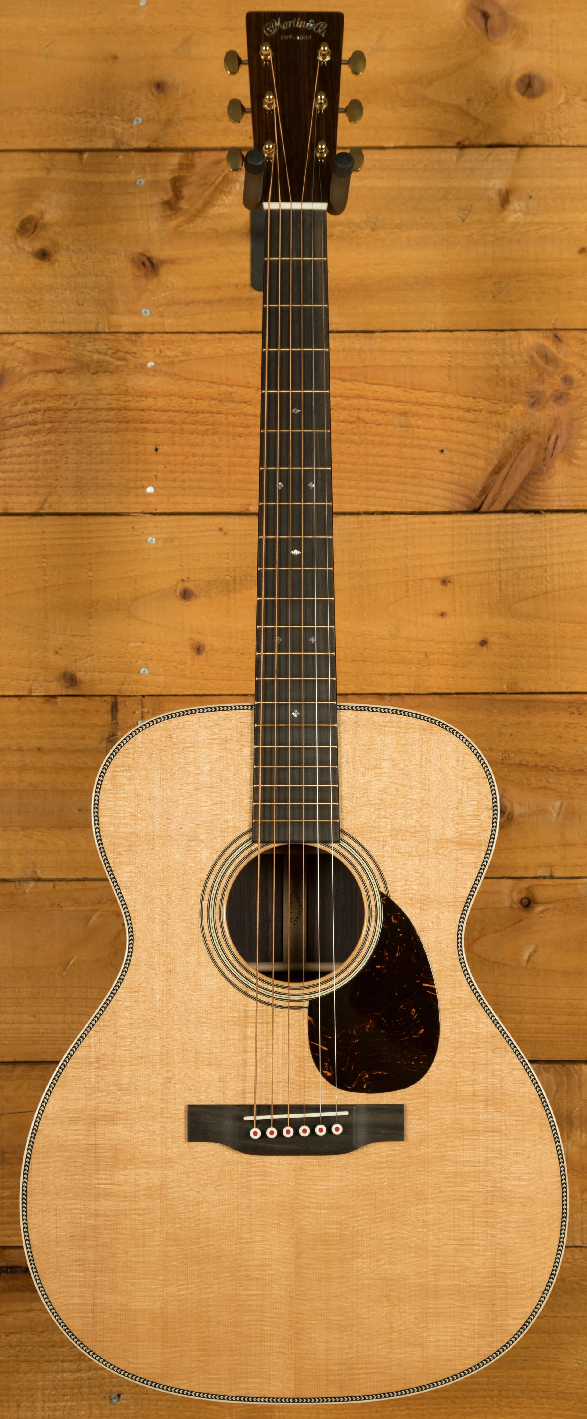 The Vintage Deluxe neck profile is slightly asymmetrical, inspired by 1930s Martin designs, and paired with a high-performance taper for enhanced comfort and playability. Flamed European maple binding, gold EVO frets, and a pearl-inlaid 1930s script logo elevate the visual detail.