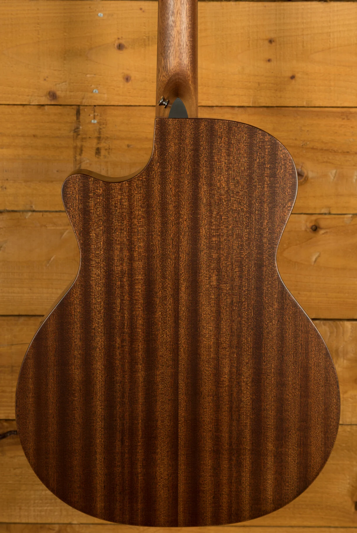 The GPC-10E's body size strikes a perfect balance between a classic Dreadnought and 000 style guitar, providing both comfort and power. This size results in a projective, balanced tone with enhanced bass, making it suitable for a variety of playing styles. The Sapele wood, similar in appearance and tone to genuine mahogany, delivers a powerful midrange, great punch, and bright trebles. This ensures a full, dynamic sound whether you're strumming chords or playing intricate melodies.