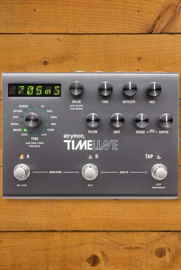 - Seven front-panel tone shaping knobs: Time, Repeats, Mix, Filter, Grit, Mod Speed, Mod Depth