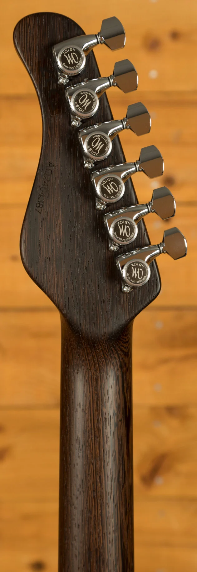 The Wenge neck boasts an incredible Ebony fingerboard, with stainless steel frets and a 25.4" scale length, its comfortable and fast. The 12" radius feels great under hand and offers a platform perfect for both low end riffing and treble side lead work.