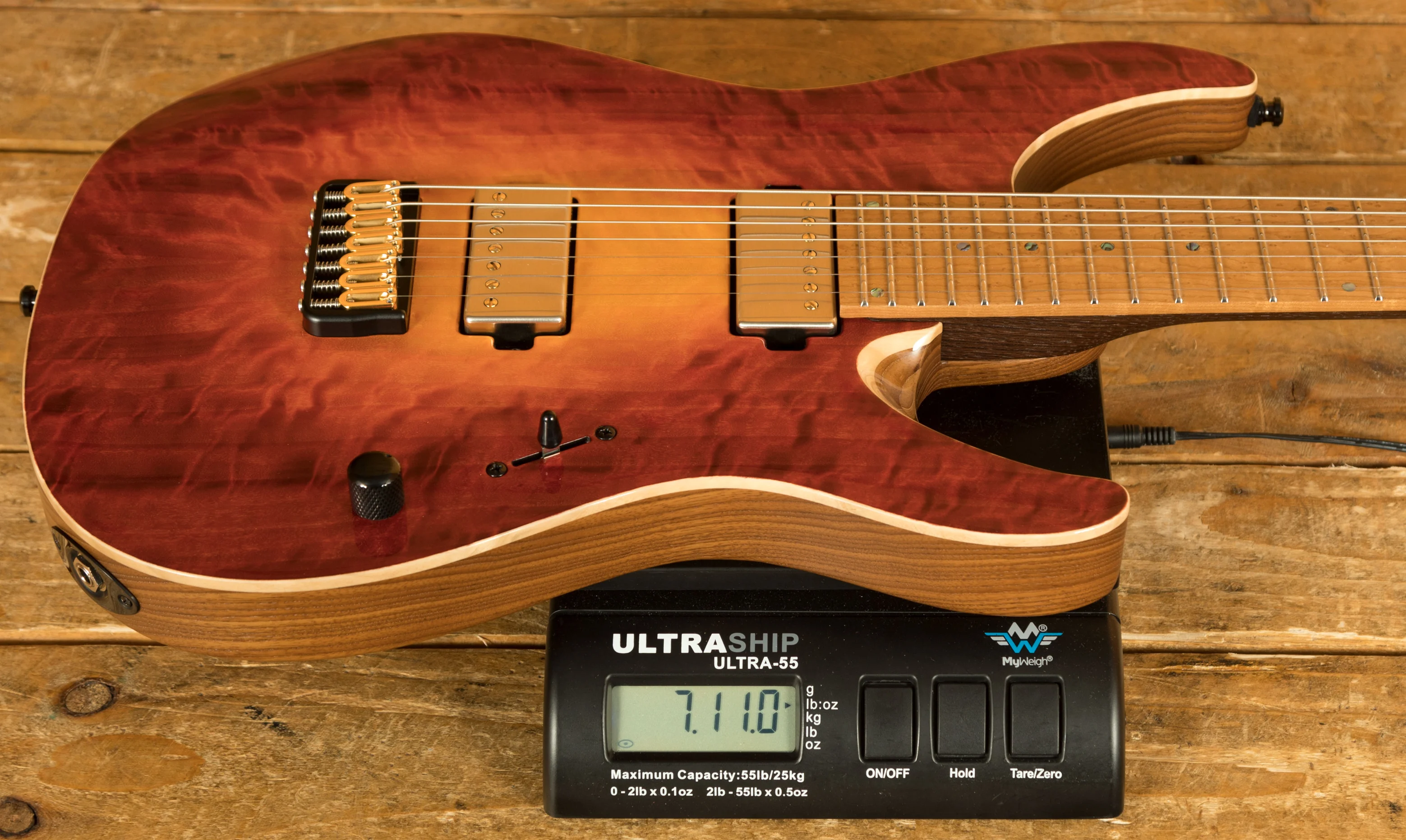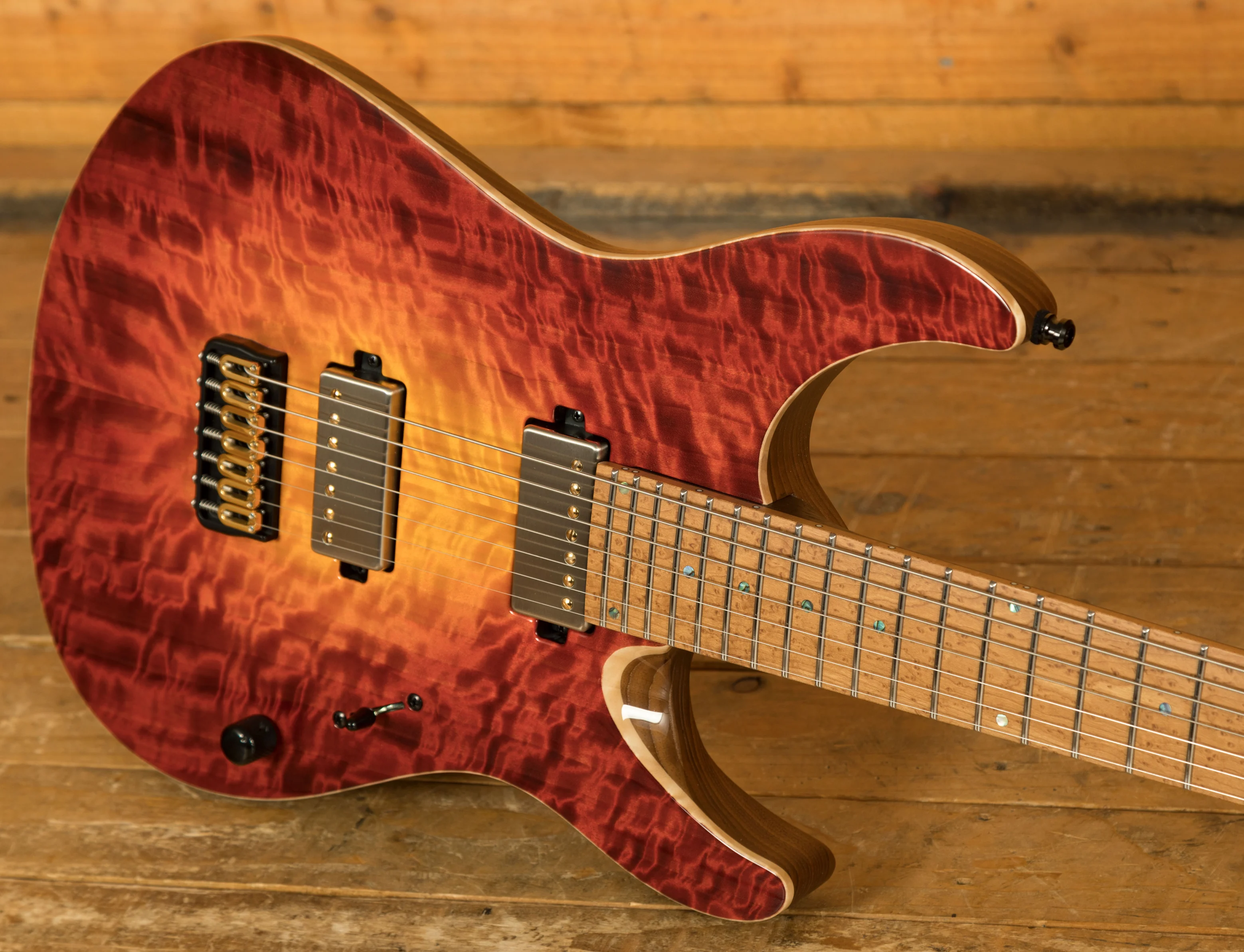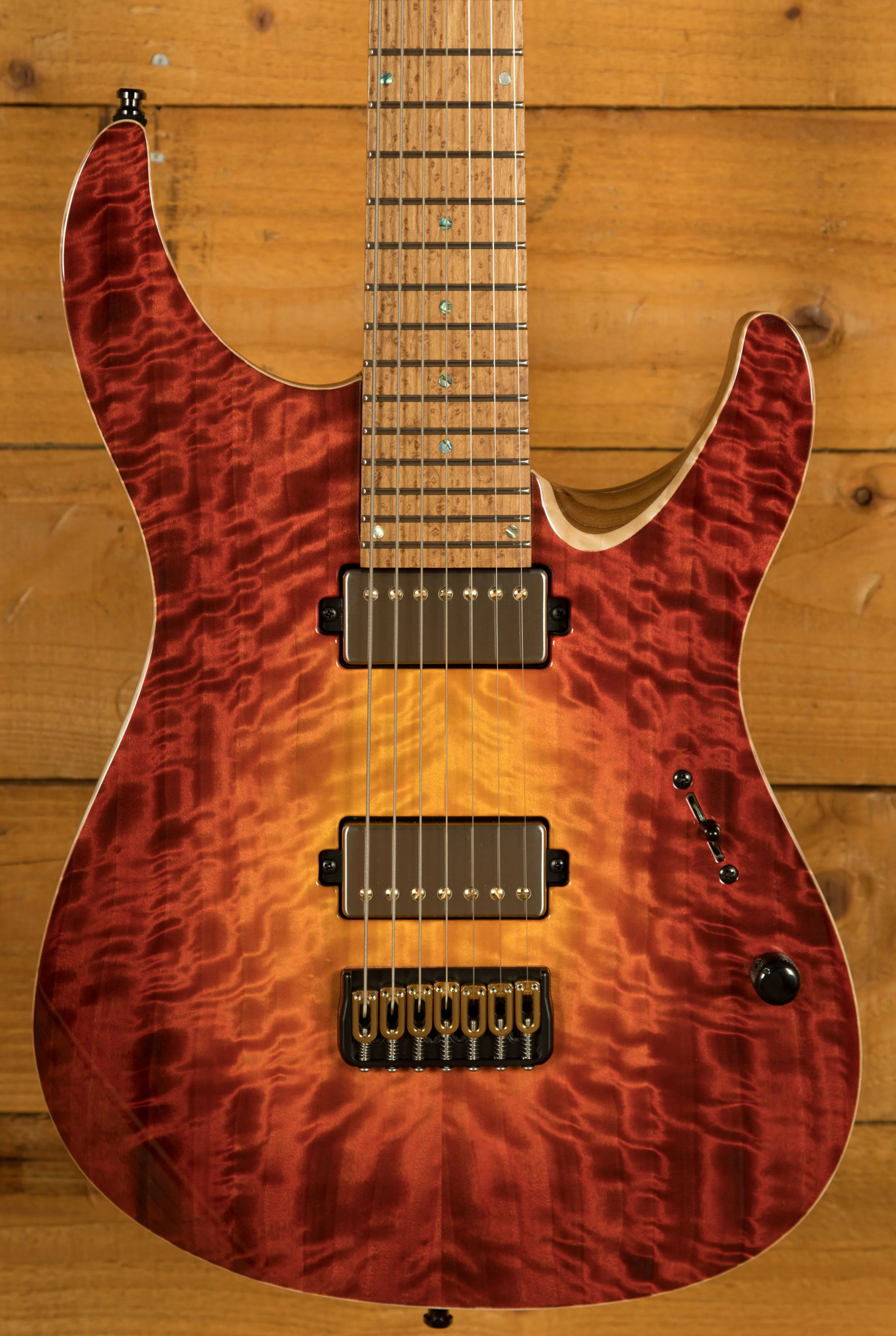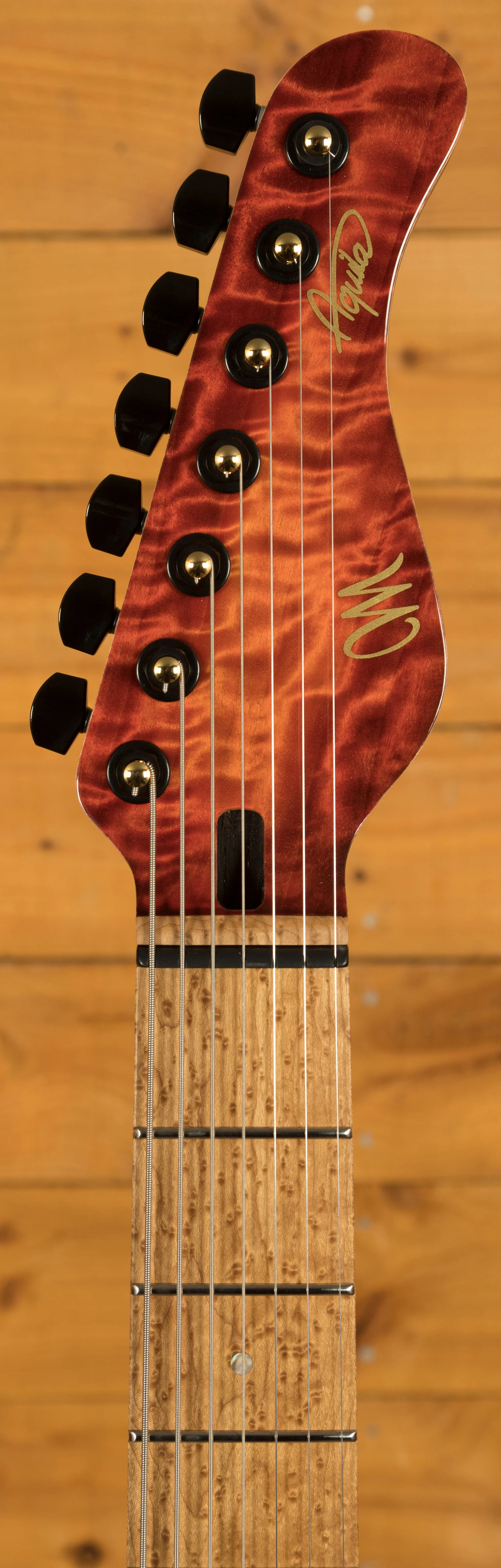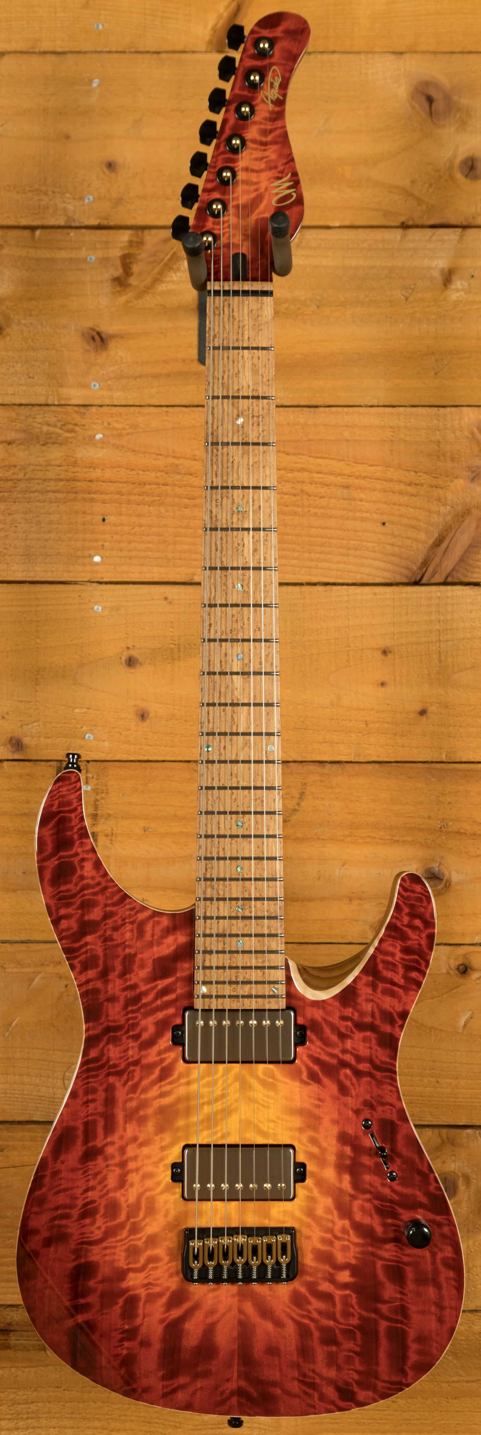 This Aquila Elite S features a T.E.W Swamp Ash body which has received Mayones’ unique “Tonally Enhanced Wood”, this increases the resonance and stability of the wood. This body is paired up with a 4A grade Curly Poplar top, which is a great choice. Visually, Curly Poplar looks very similar to Figured Maple, and this particular model features prominent figuring right across the entire top. It’s stained with Mayones’ Lava Burst finish, which is one of their most iconic and vibrant colour options. The Curly Poplar top is further enhanced with a gloss finish, which makes the figuring even more eye-catching.