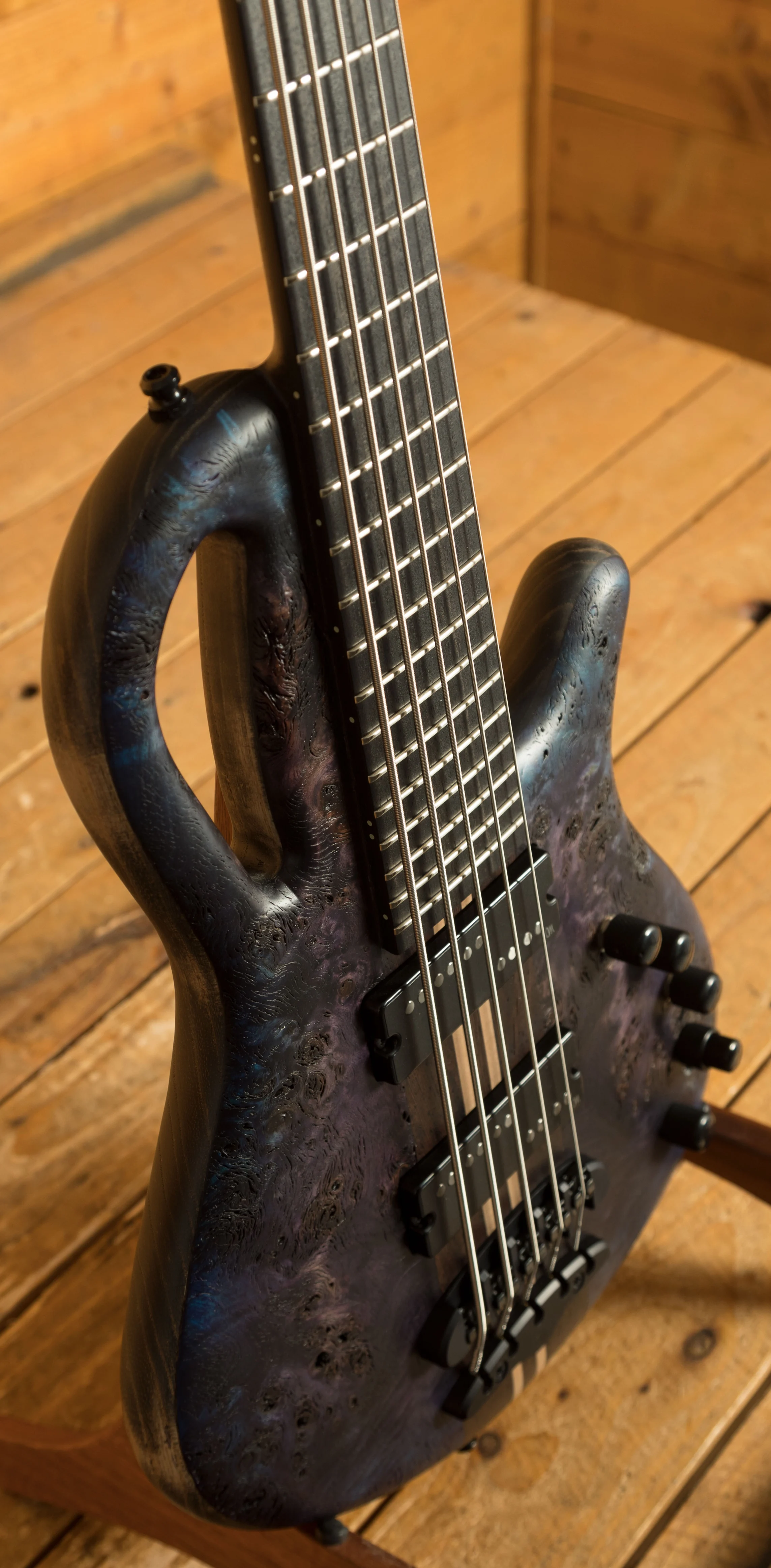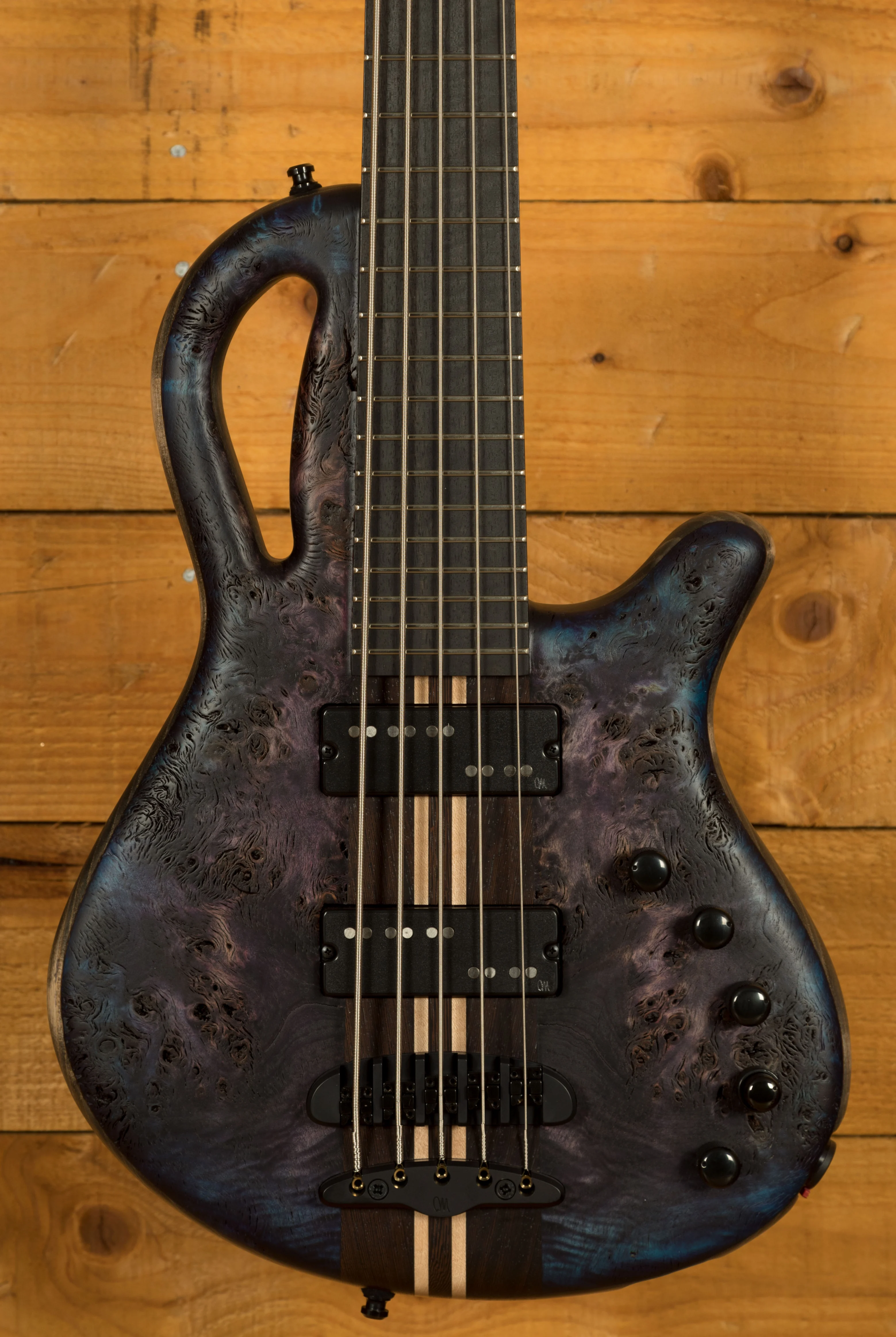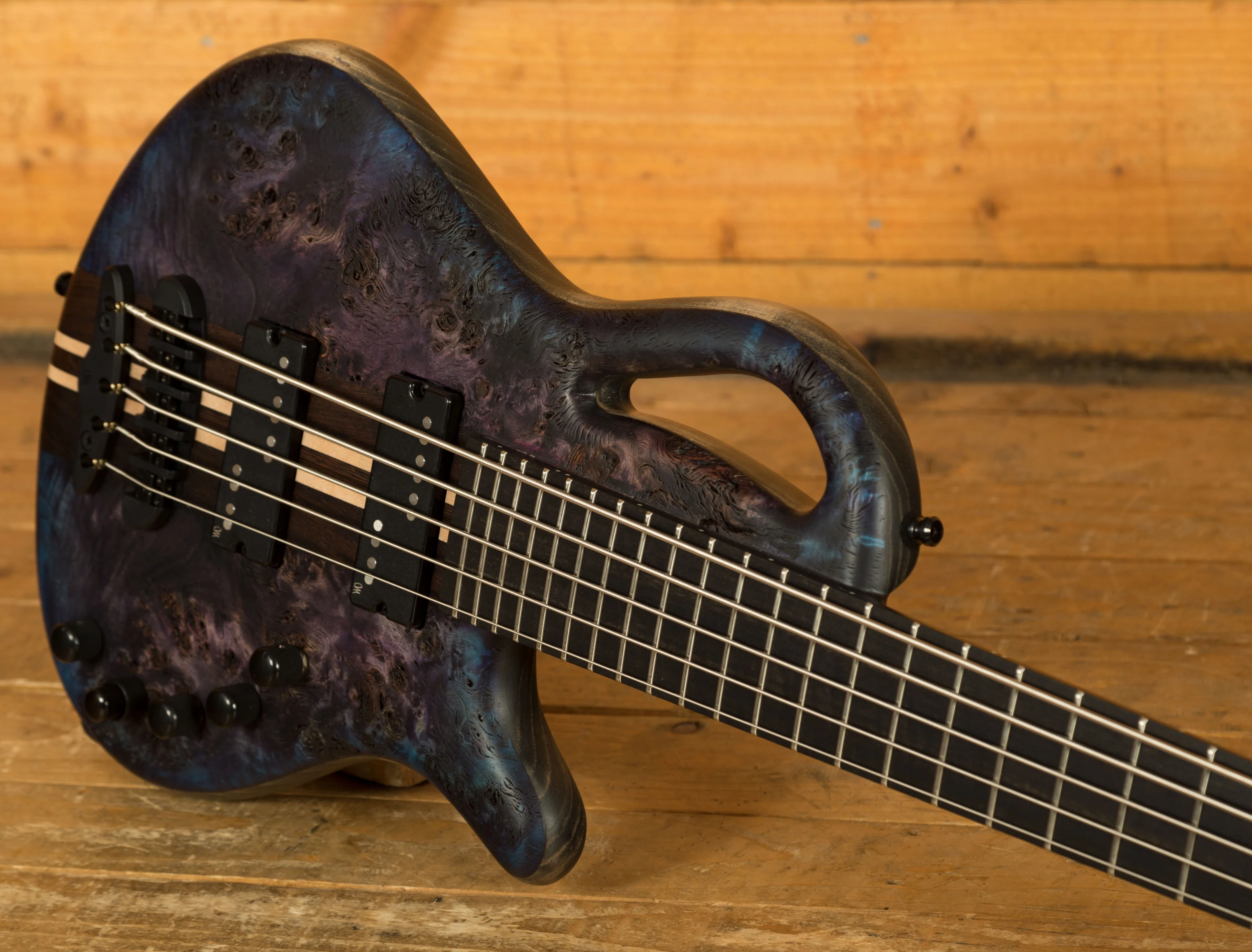 With a Swamp Ash body, this bass benefits from a 4A Eye Poplar top. This Poplar top features the Mayones RAW treatment, which creates an awesome texture right across the top of the guitar, the figuring on display is truly astonishing! The Trans Dirty Purple Blue Burst finish applied to the body is super thin, so you can rest assured that this bass is super punchy and vibrant in tone. It's beautifully poised, balanced and thanks to the special contoured neck heel you get great access right up the neck.