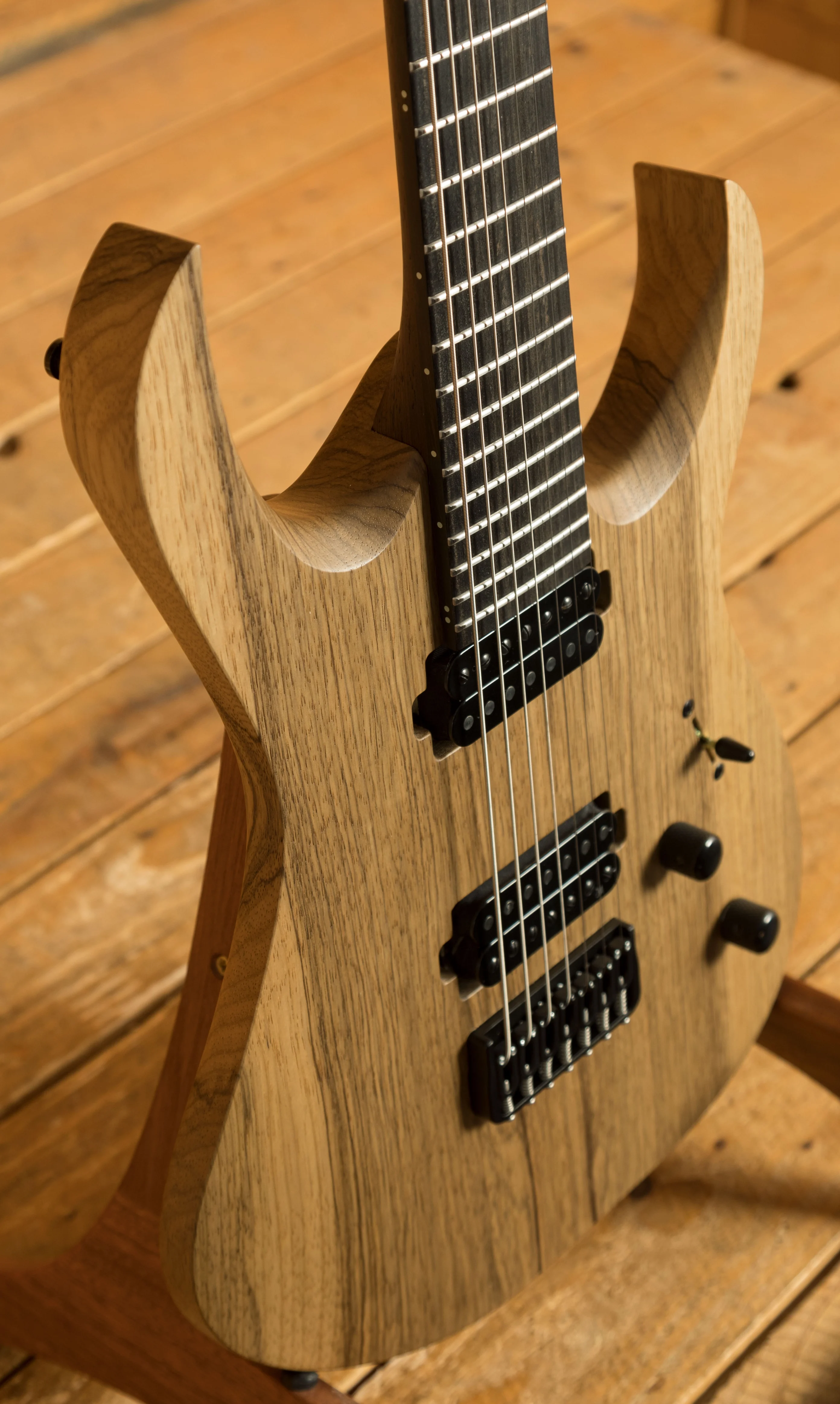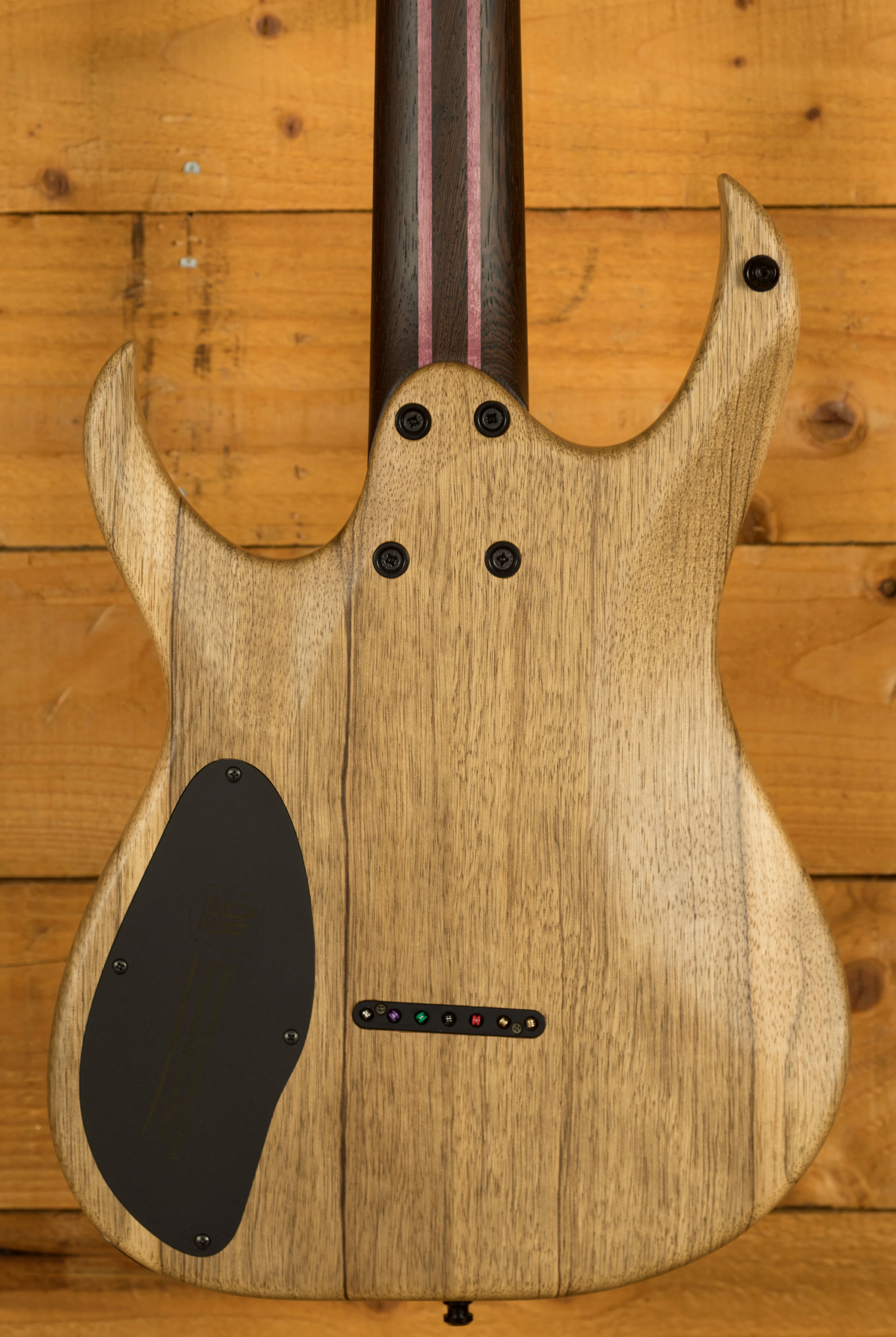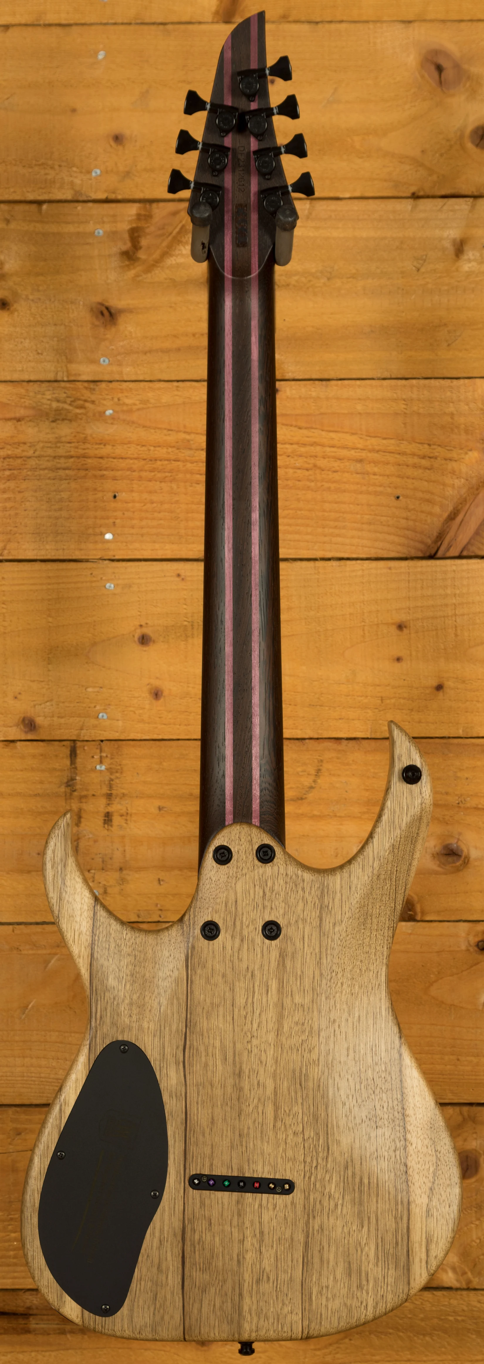 The Wenge/Purpleheart neck boasts a slick Ebony fingerboard, with 24 stainless steel frets and a 25.4" scale length, its comfortable and fast. The 16" radius feels great under hand and offers a platform perfect for both low end riffing and treble side lead work.
