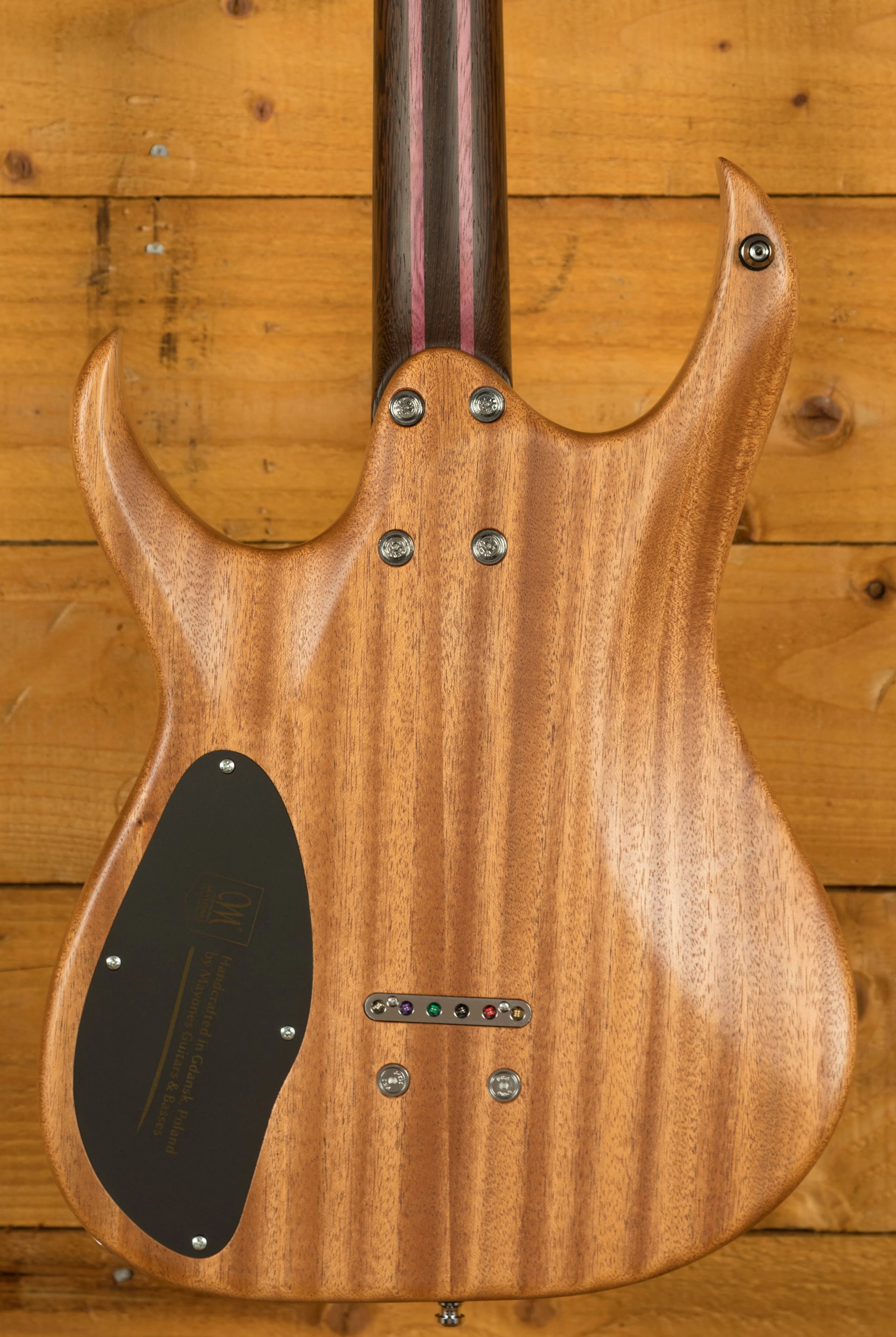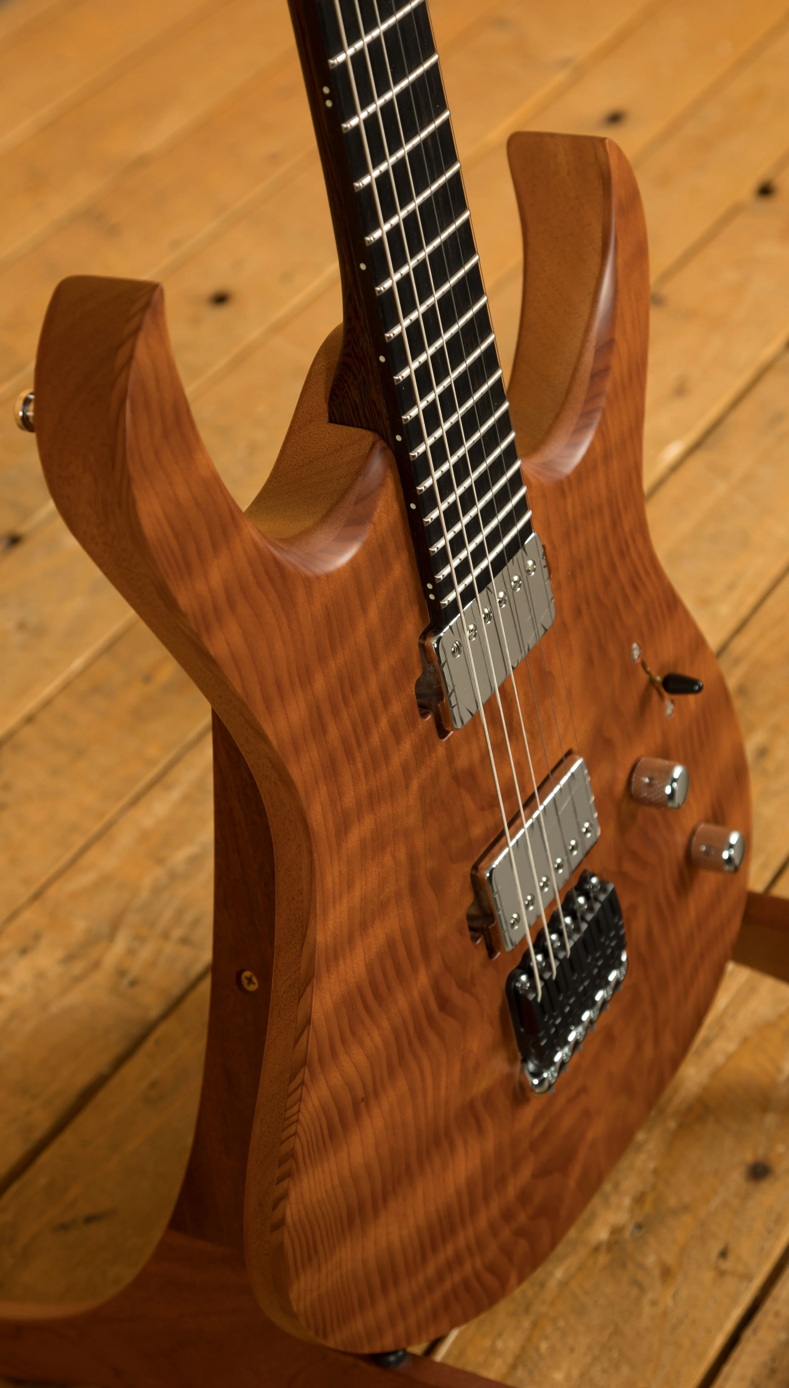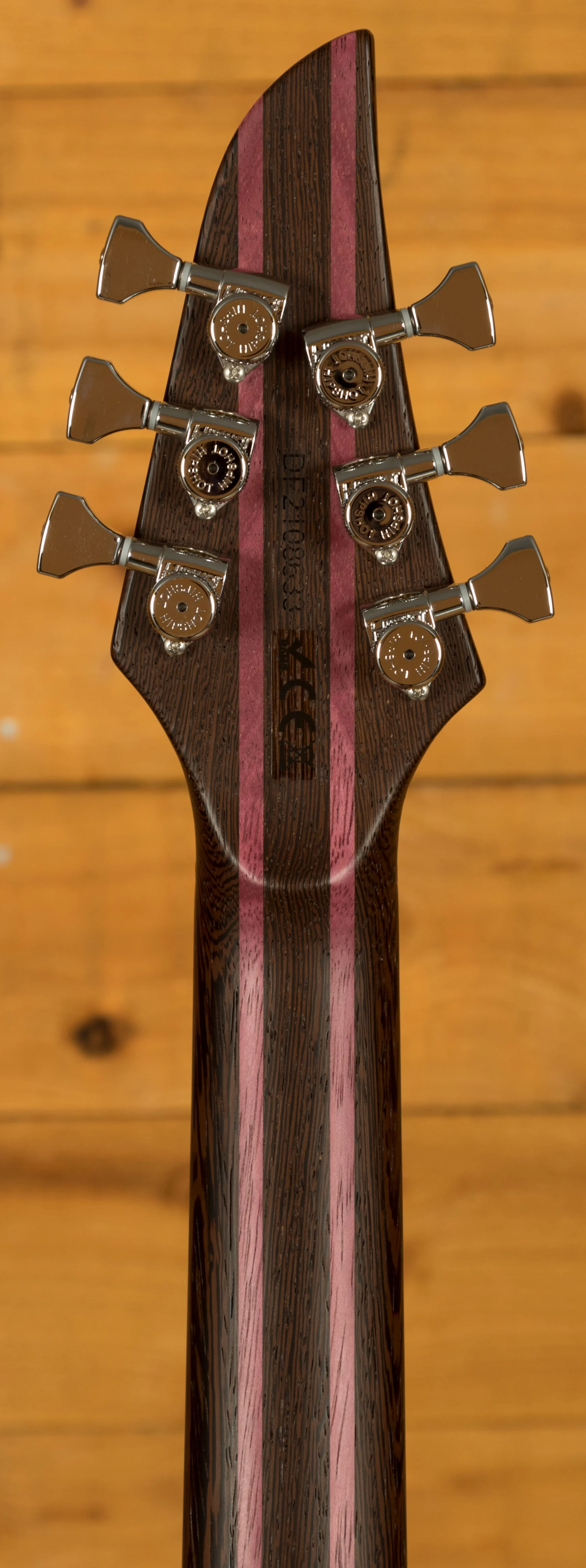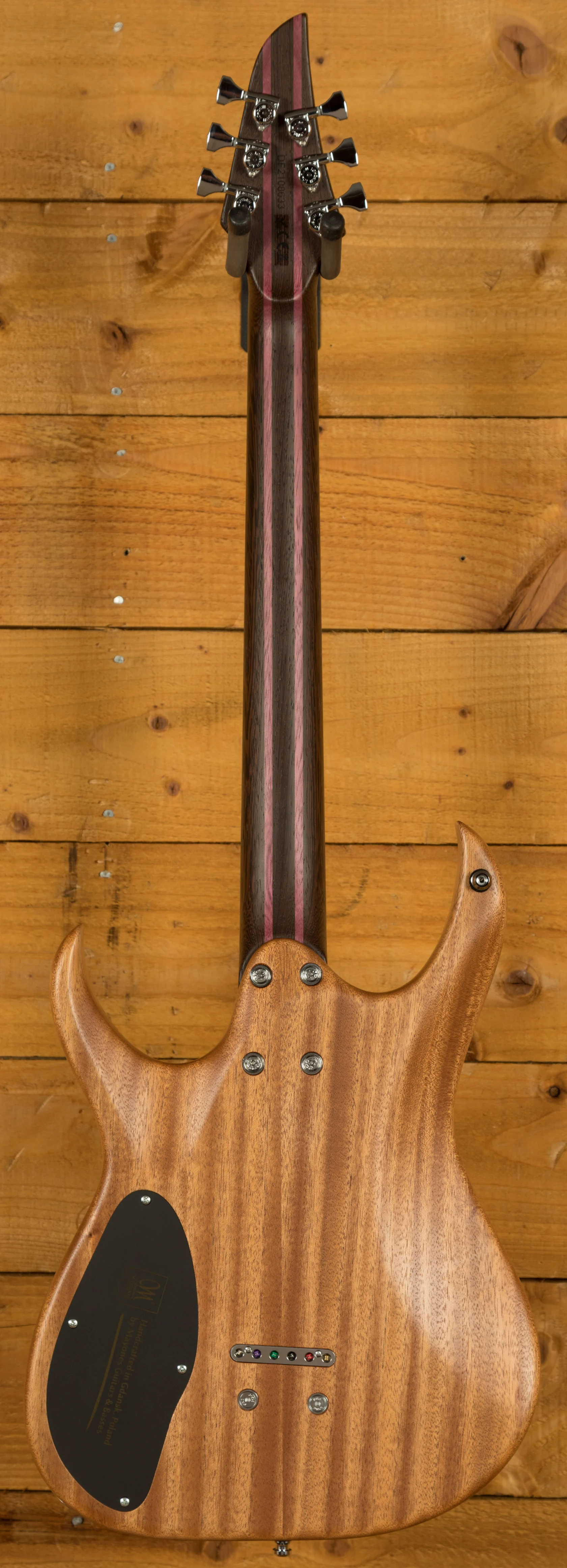 The Wenge/Purpleheart neck boasts a slick Ebony fingerboard, with 24 stainless steel frets and a 25.4" scale length, its comfortable and fast. The 16" radius feels great under hand and offers a platform perfect for both low end riffing and treble side lead work.
