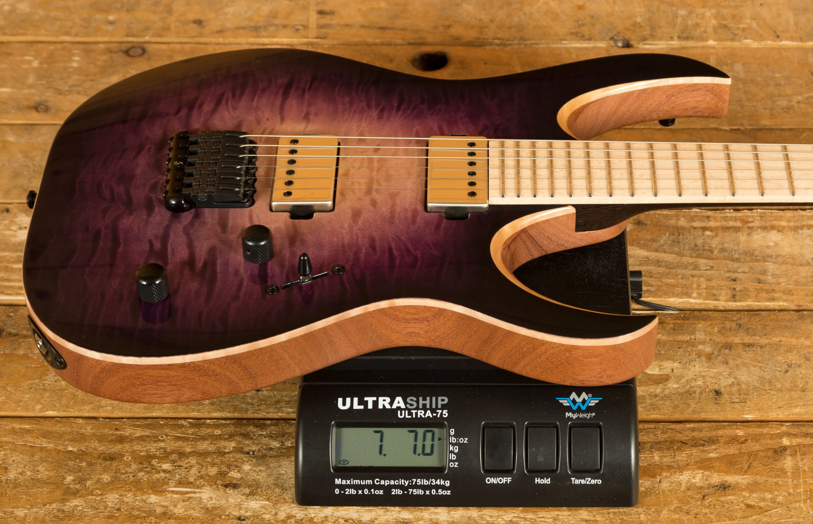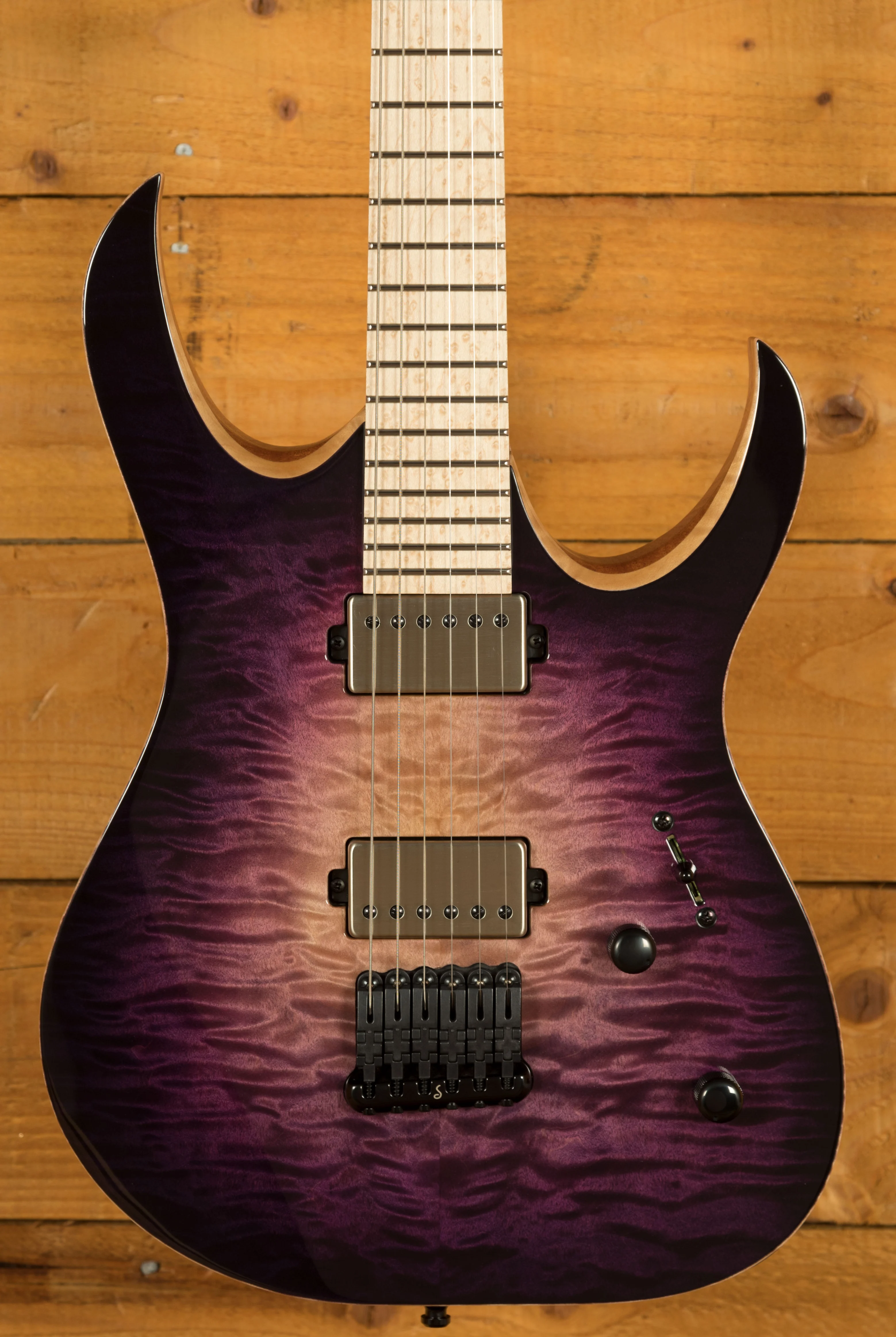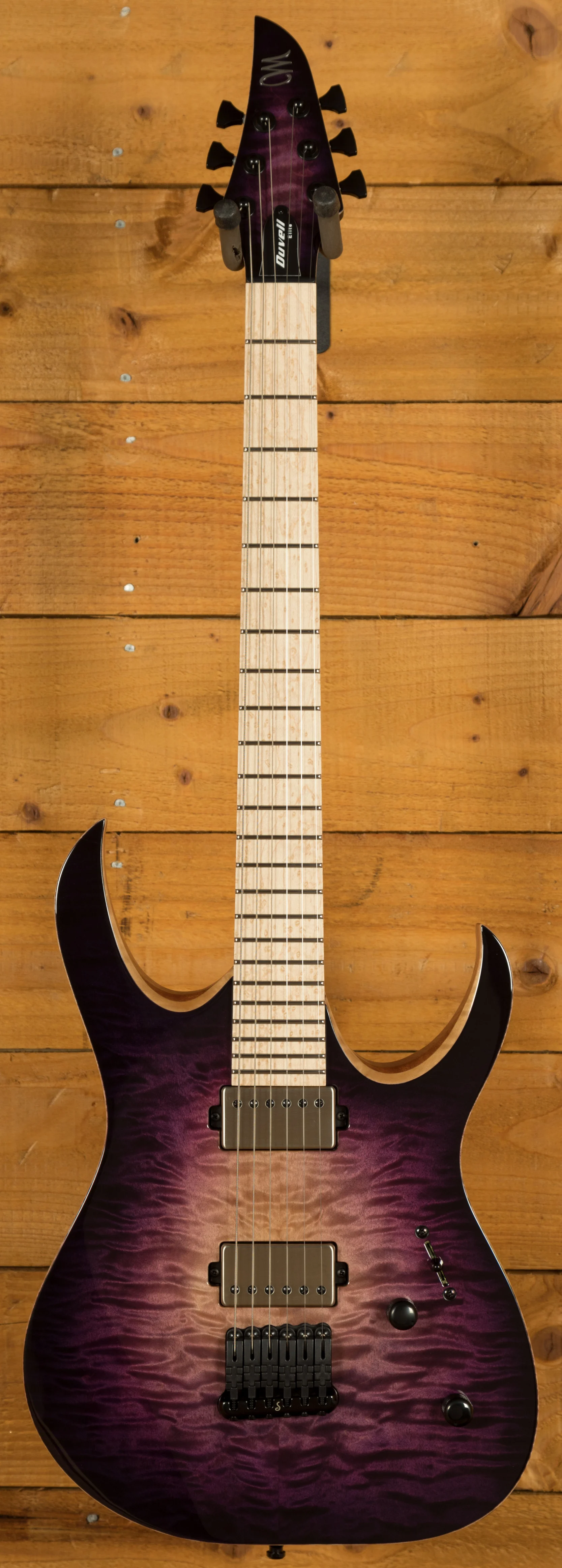 With a profiled Khaya Mahogany body, the Duvell benefits from a special contoured heel for easy access up the neck and a back belly cut and forearm contour for the ultimate in modern comfort. The 5A Quilted Maple top looks stunning and features a Custom Trans finish spec’d by the Peach Guitars team. With a vibrant purple burst this Duvell is visually unique and a real eye catcher! It's beautifully poised, balanced, and feels great.