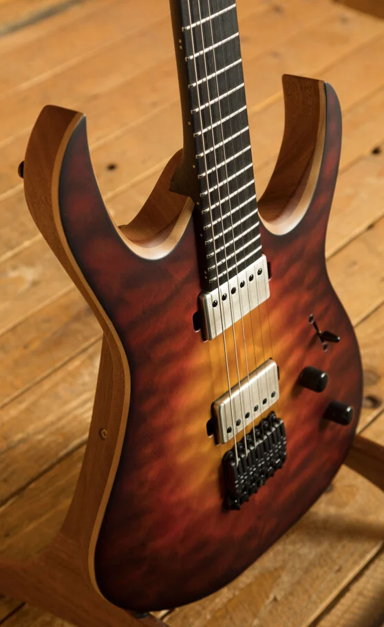 With a profiled Khaya Mahogany body, the Duvell benefits from a special contoured heel for easy access up the neck and a back belly cut and forearm contour for the ultimate in modern comfort. The 4A Quilted Maple top looks stunning and features a stunning Lava Burst Satin finish. It's beautifully poised, balanced, and feels great.