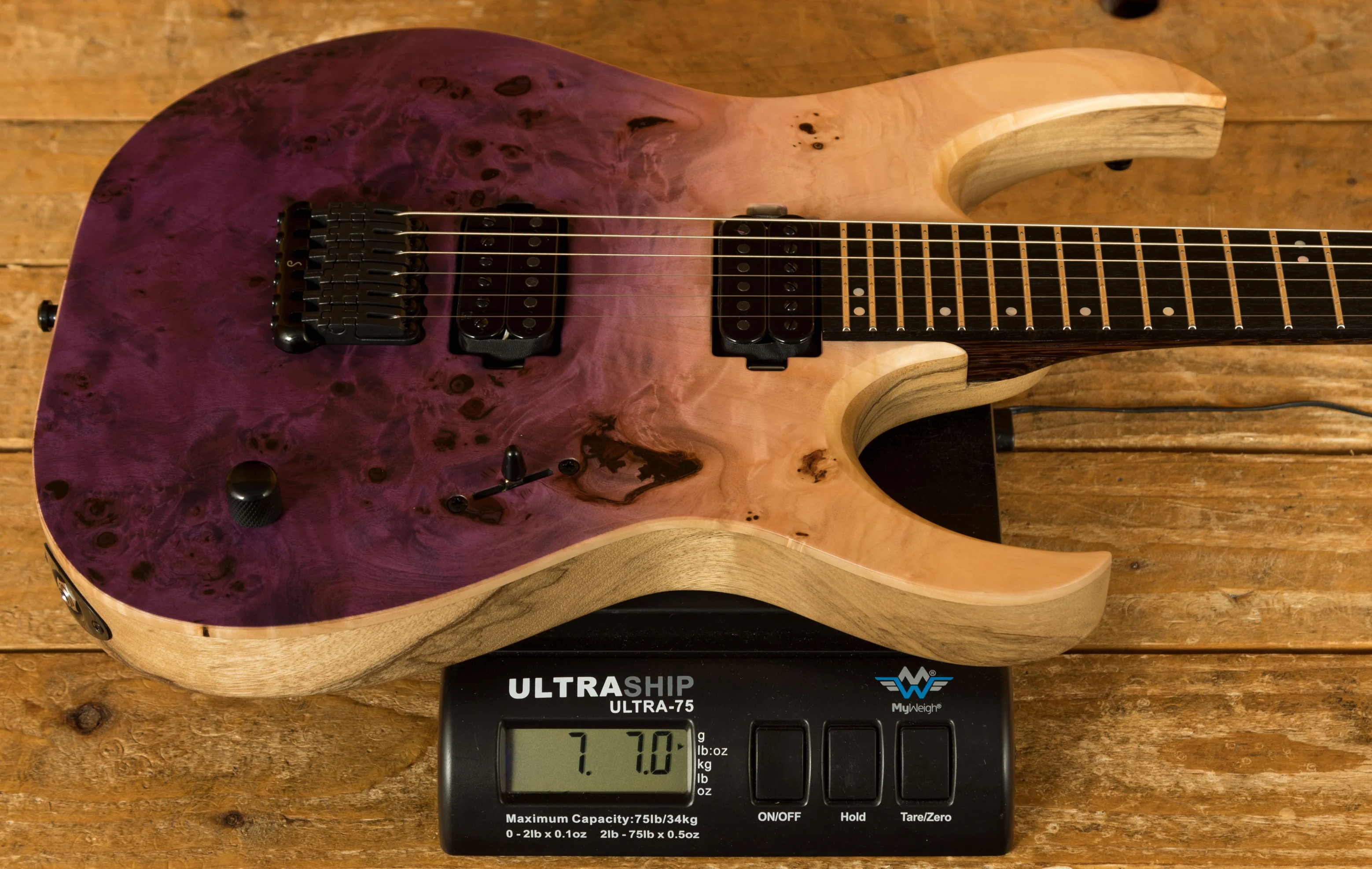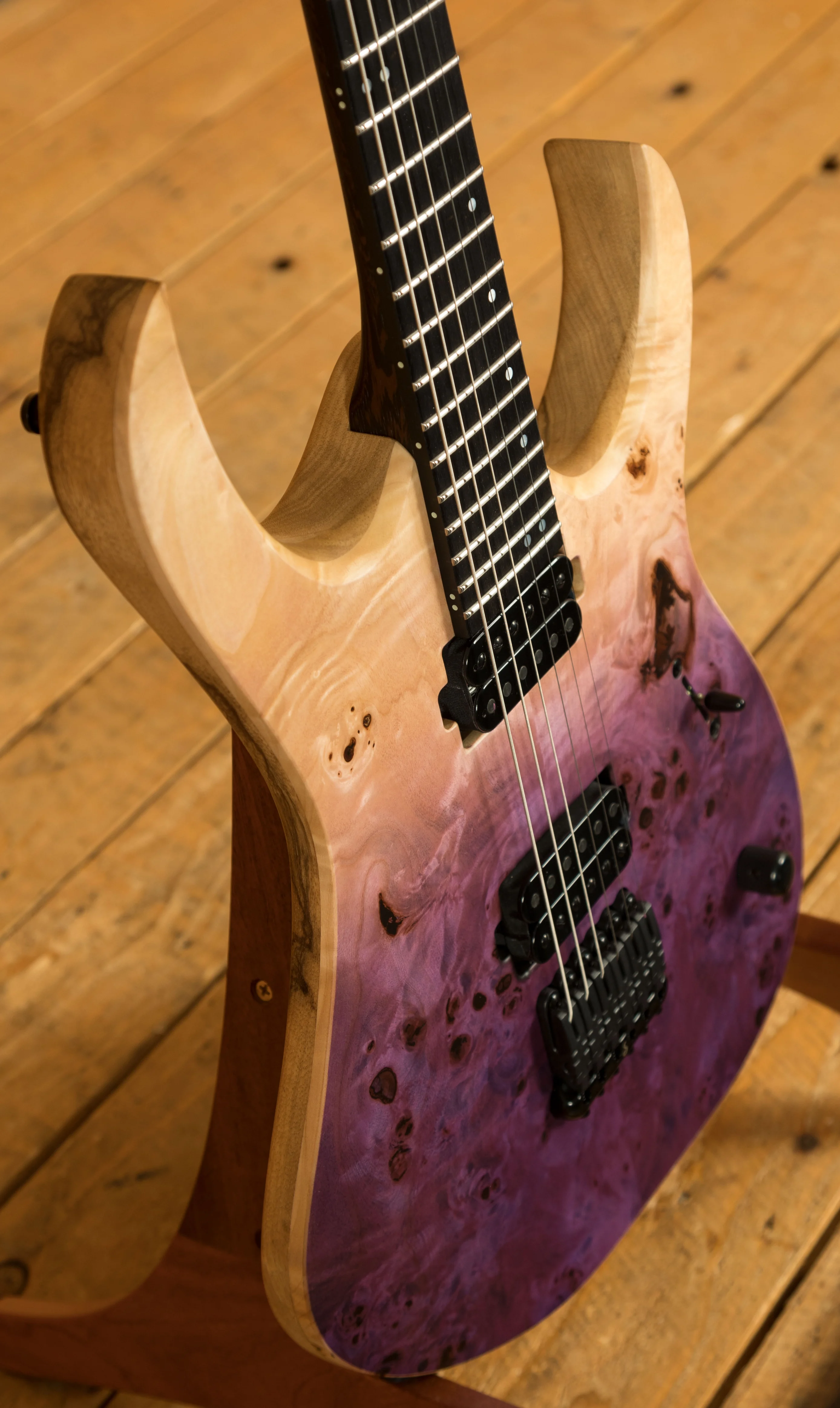With a profiled Black Limba body, the Duvell benefits from a special contoured heel for easy access up the neck and a back belly cut and forearm contour for the ultimate in modern comfort. The 3A Eye Poplar top looks stunning and features a Trans Purple Horizon Satin finish. It's beautifully poised, balanced and feels great.