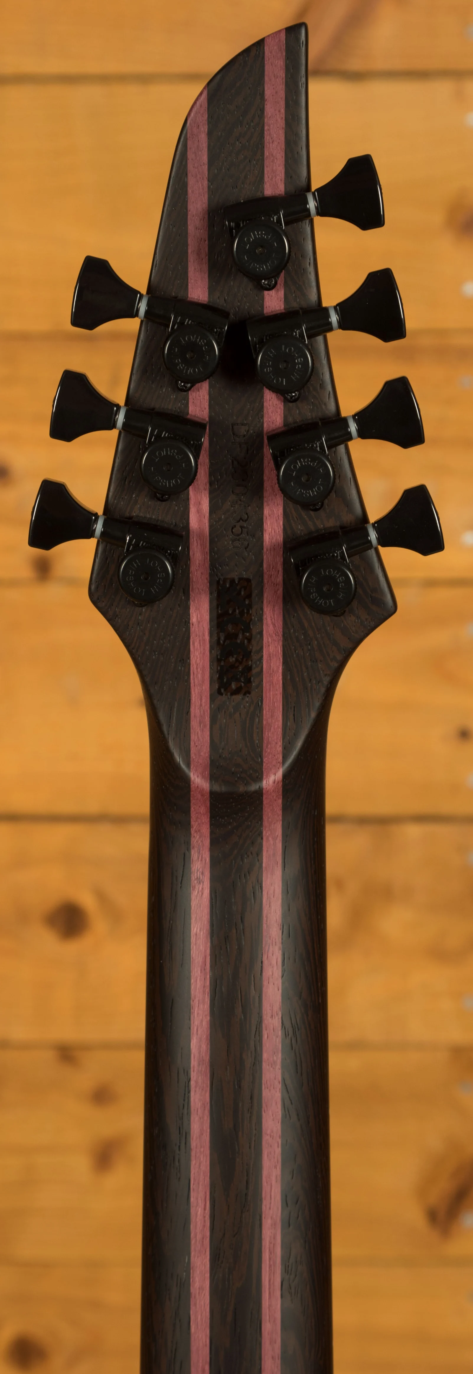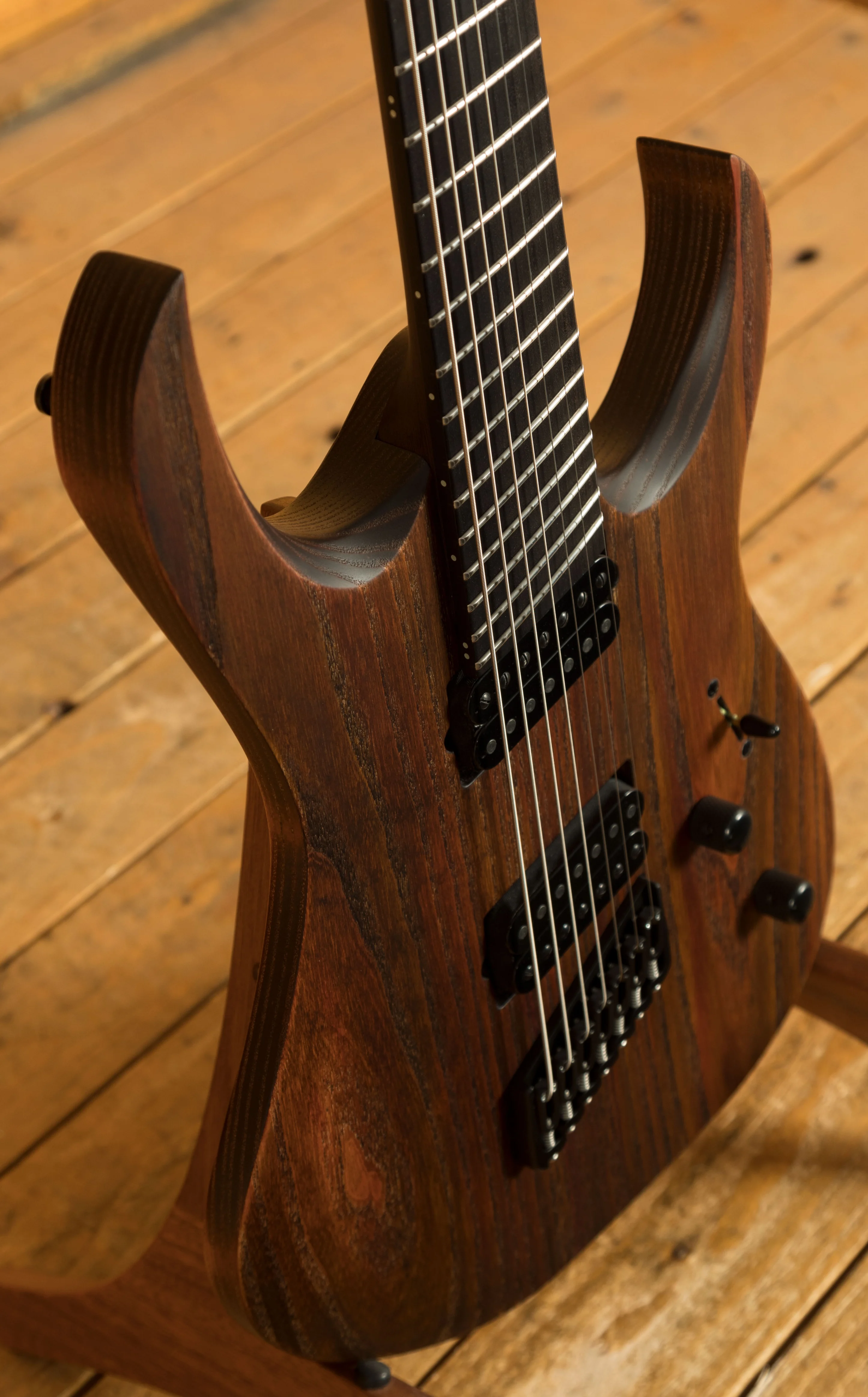 The Wenge-Purpleheart 5-ply neck boasts a slick Ebony fingerboard, with 24 stainless steel frets and a 25.4"-27 Multi scale length, its comfortable and fast. The 16" radius feels great under hand and offers a platform perfect for both low end riffing and treble side lead work. This Duvell feels great and really comfortable.