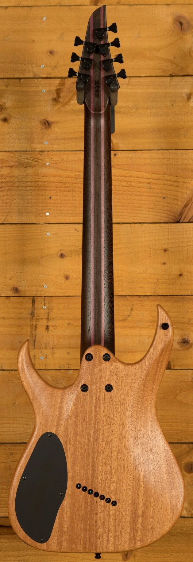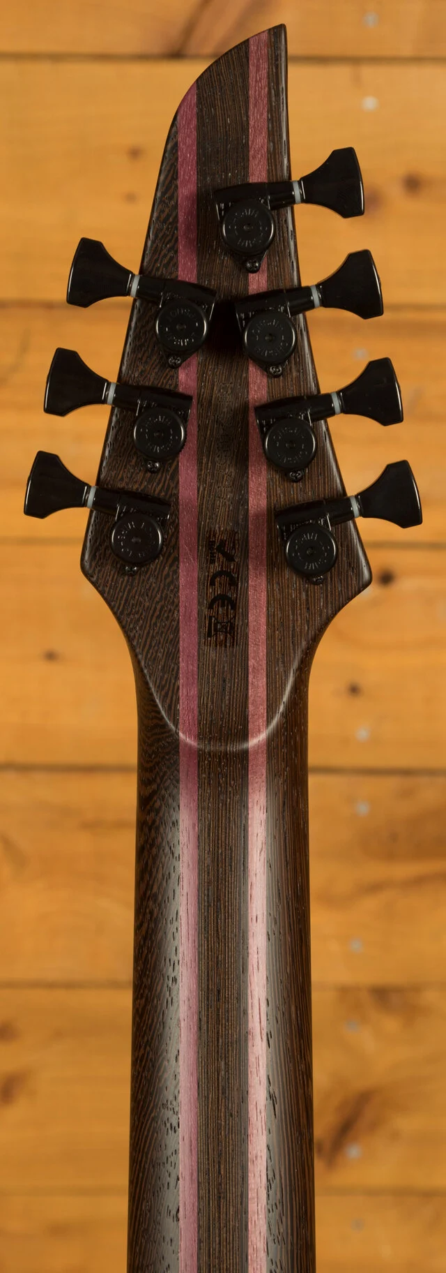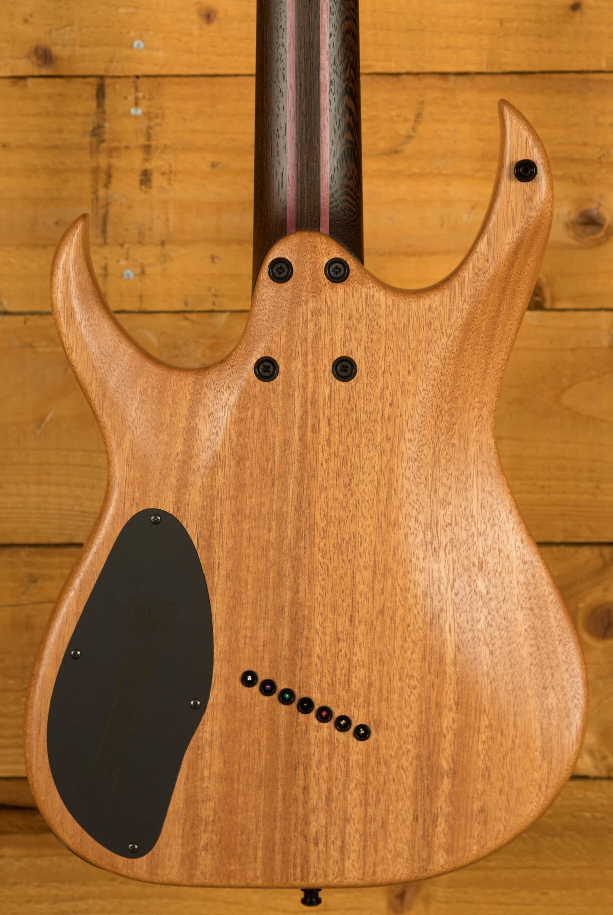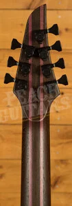 The Wenge-Purpleheart 5-ply neck boasts a slick Ebony fingerboard, with 24 stainless steel frets and a 25.4"-27 Multi scale length, its comfortable and fast. The 16" radius feels great under hand and offers a platform perfect for both low end riffing and treble side lead work. This Duvell feels great and really comfortable.