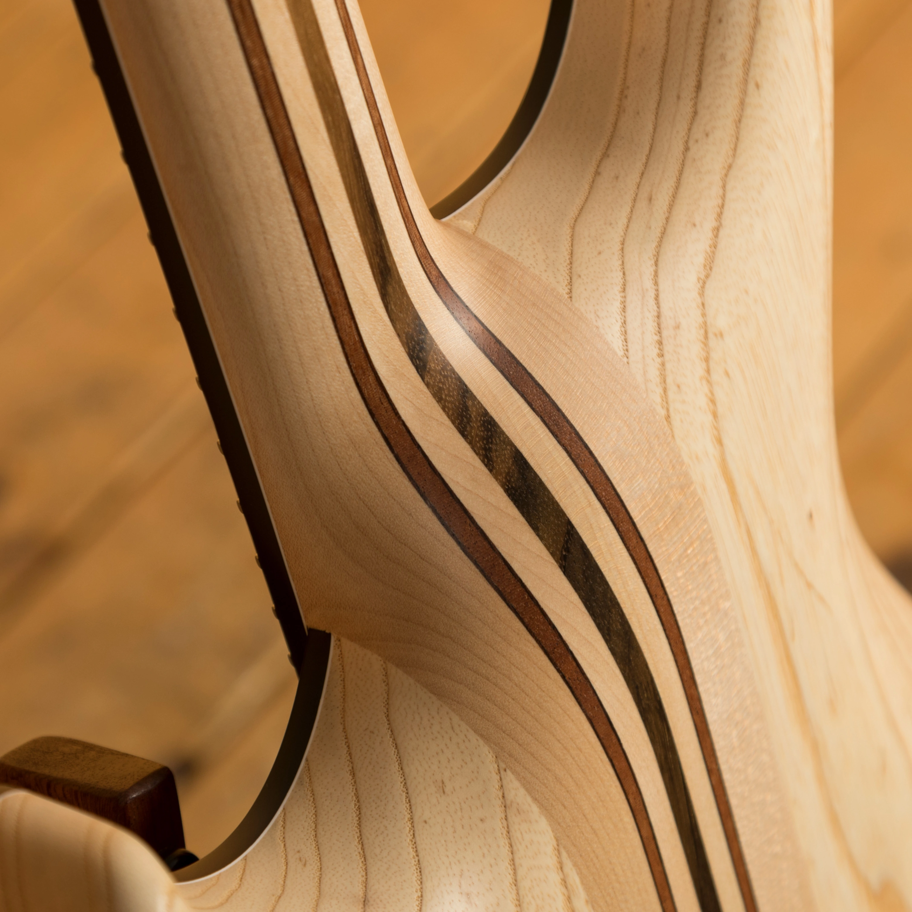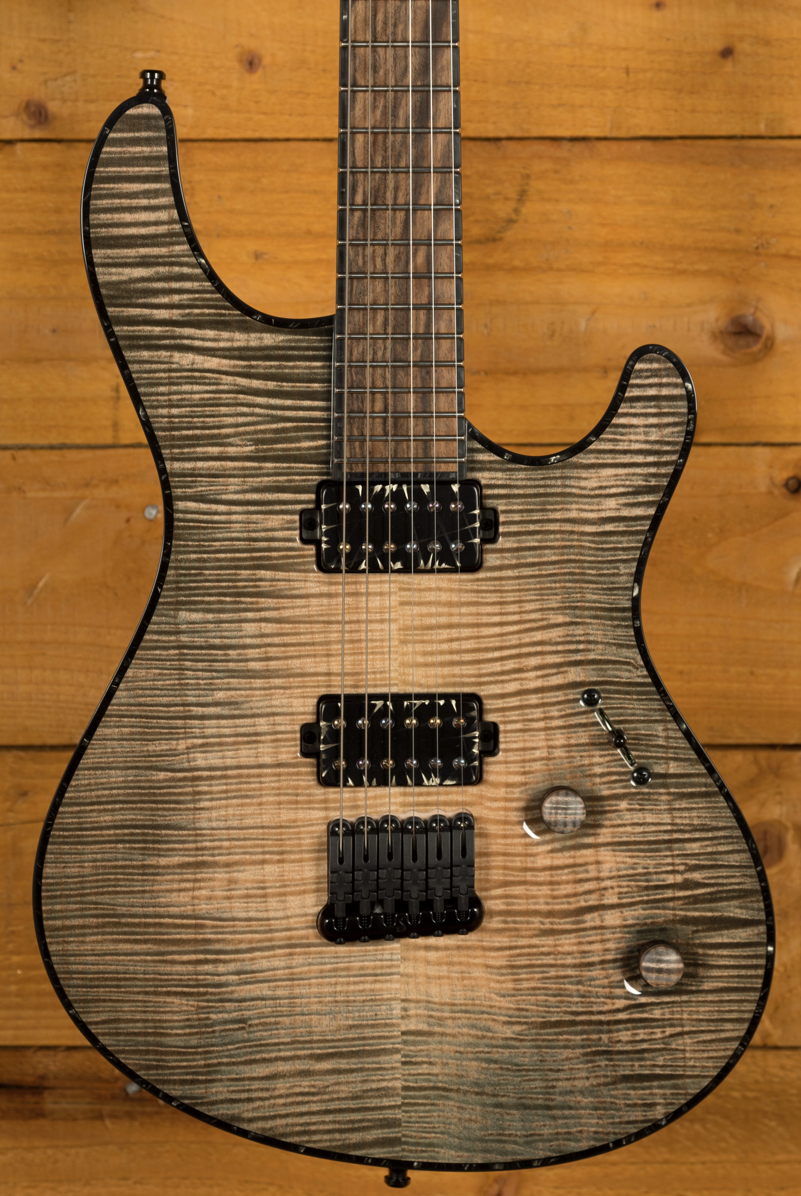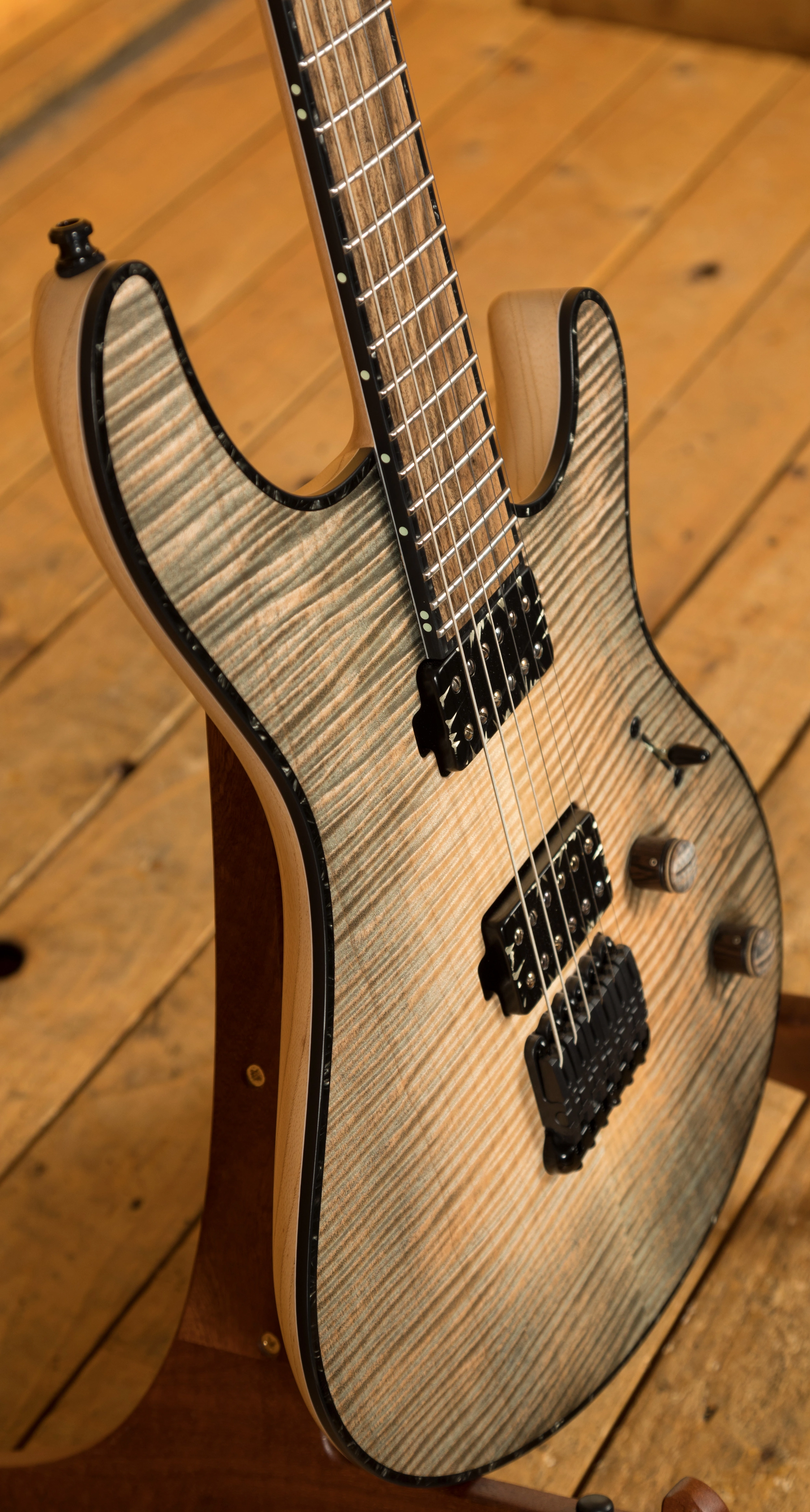 The Maple/Amazakoe/Wenge/Mahogany neck thru body boasts an incredible Ebony fingerboard, with stainless steel frets and a 25.4" scale length, its comfortable and fast. The 16" radius feels great under hand and offers a platform perfect for both low end riffing and treble side lead work.