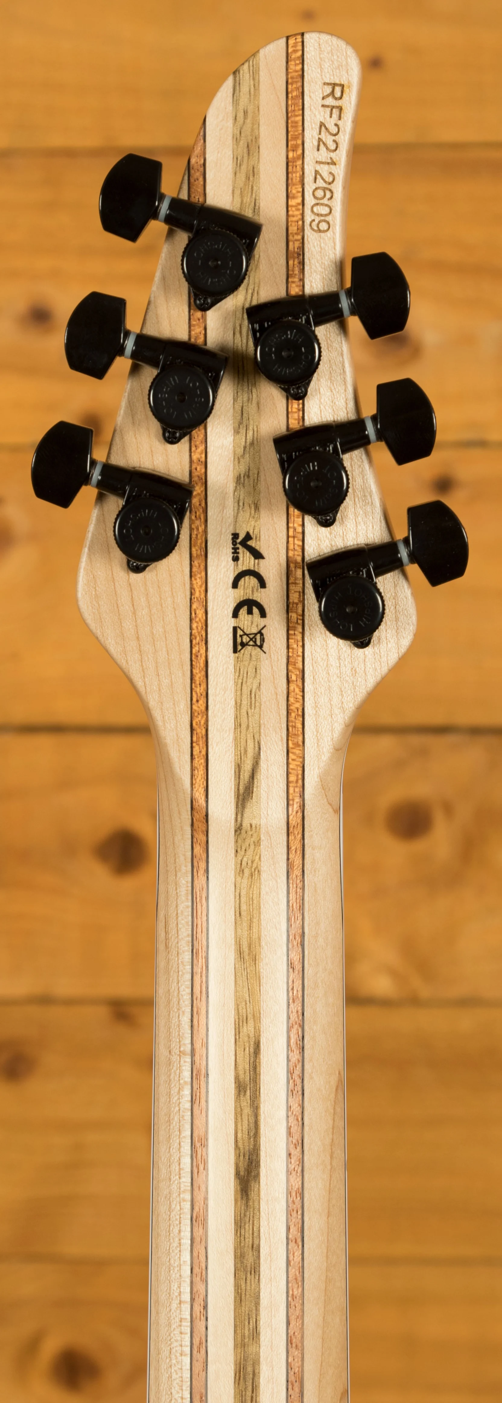 The Maple/Amazakoe/Wenge/Mahogany neck thru body boasts an incredible Ebony fingerboard, with stainless steel frets and a 25.4" scale length, its comfortable and fast. The 16" radius feels great under hand and offers a platform perfect for both low end riffing and treble side lead work.
