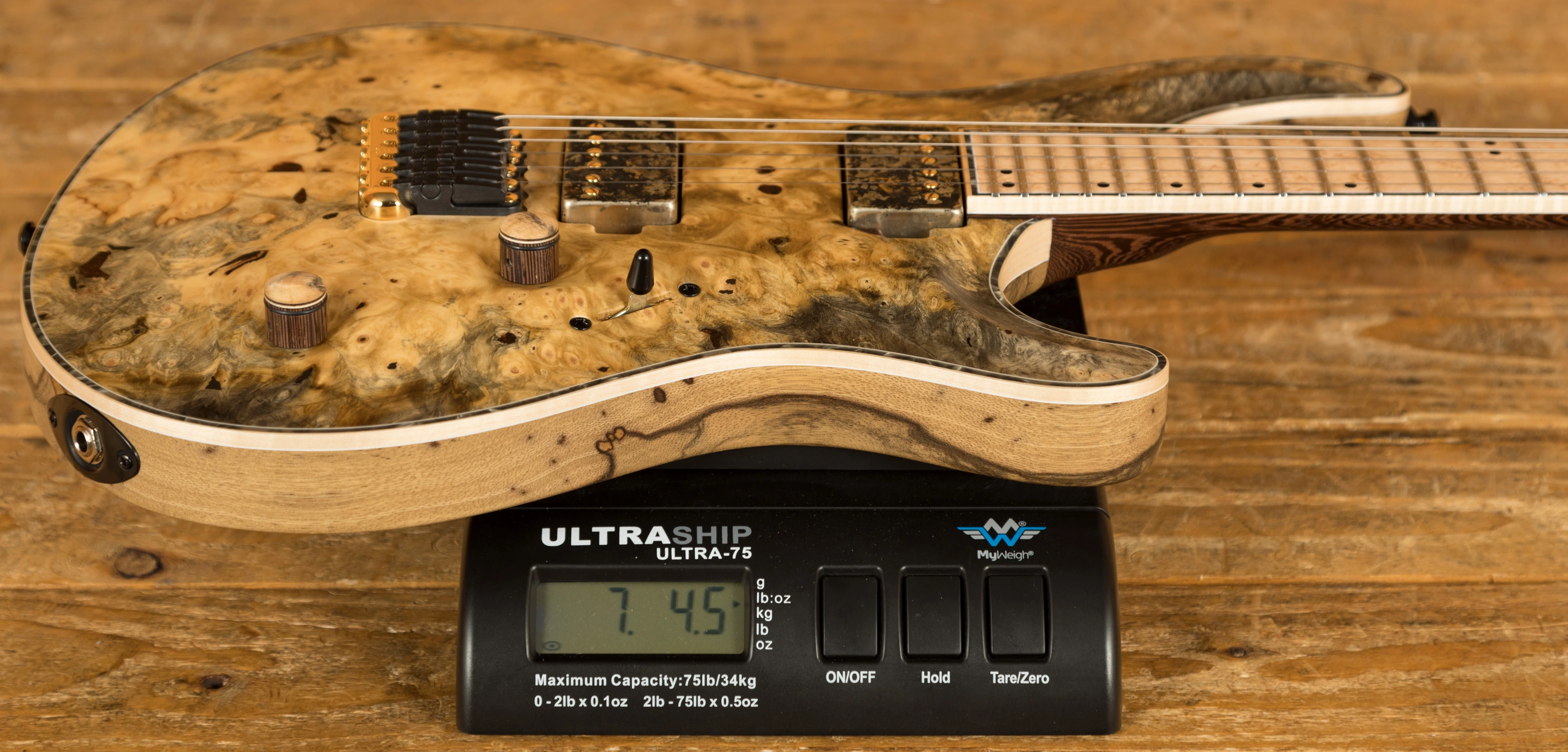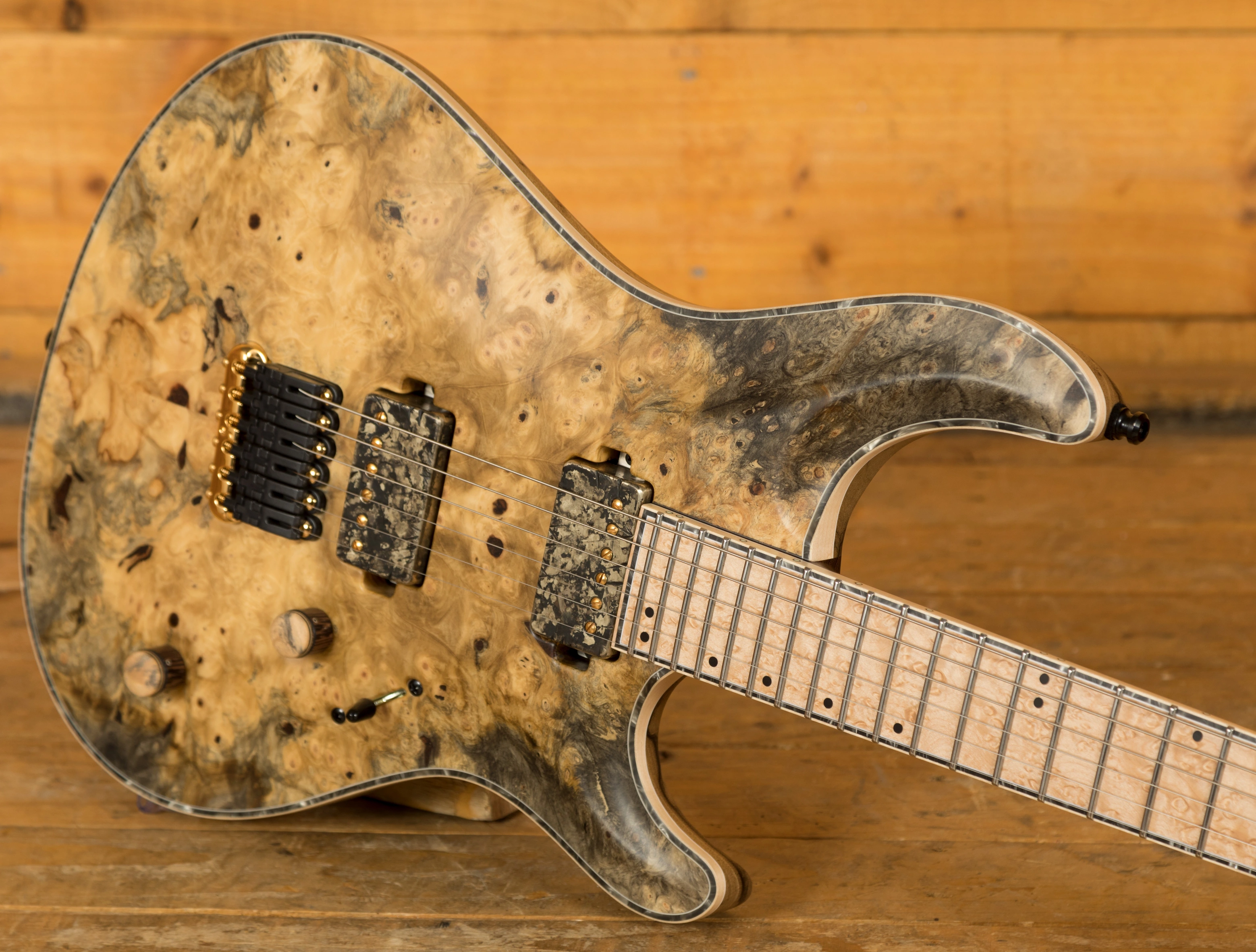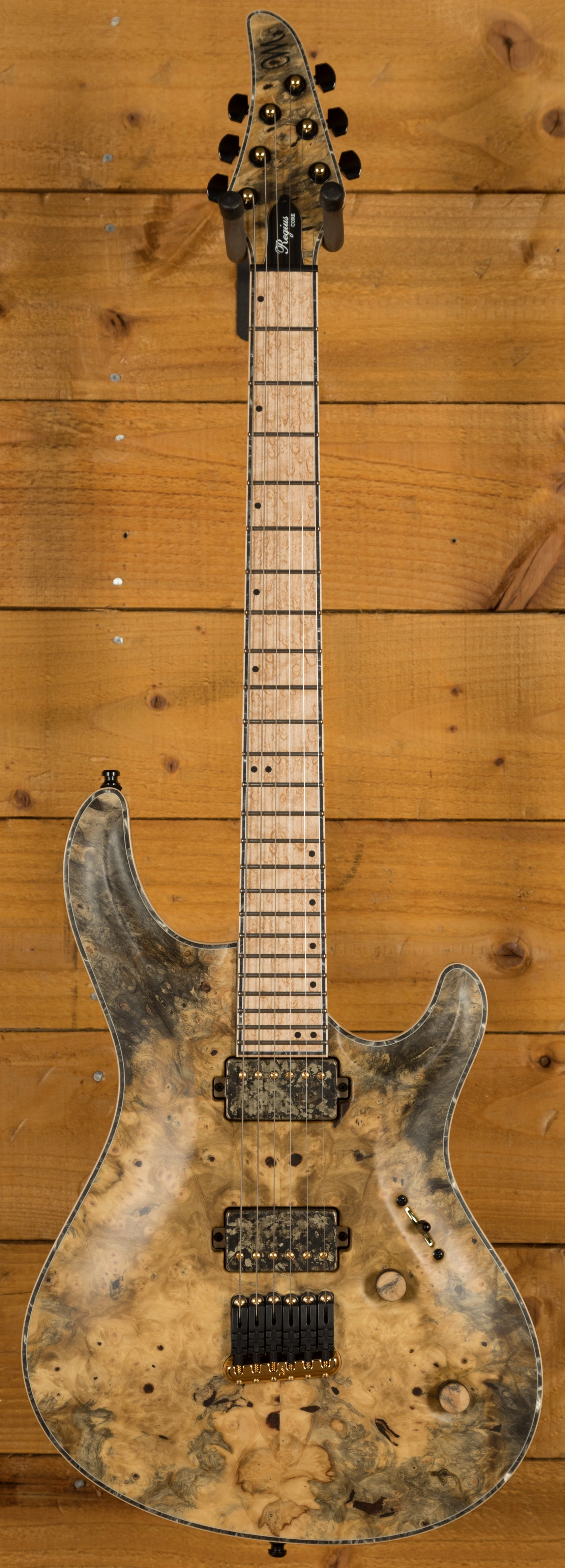 With a Black Limba body, the Regius benefits from a Master Grade Buckeye Burl top with a Natural finish which allows you to really appreciate the quality of the top. It's beautifully poised, balanced and allows great access right up the neck. With Flame Maple binding across the body, neck and headstock, this guitar really is the ultimate fusion of power and luxury!