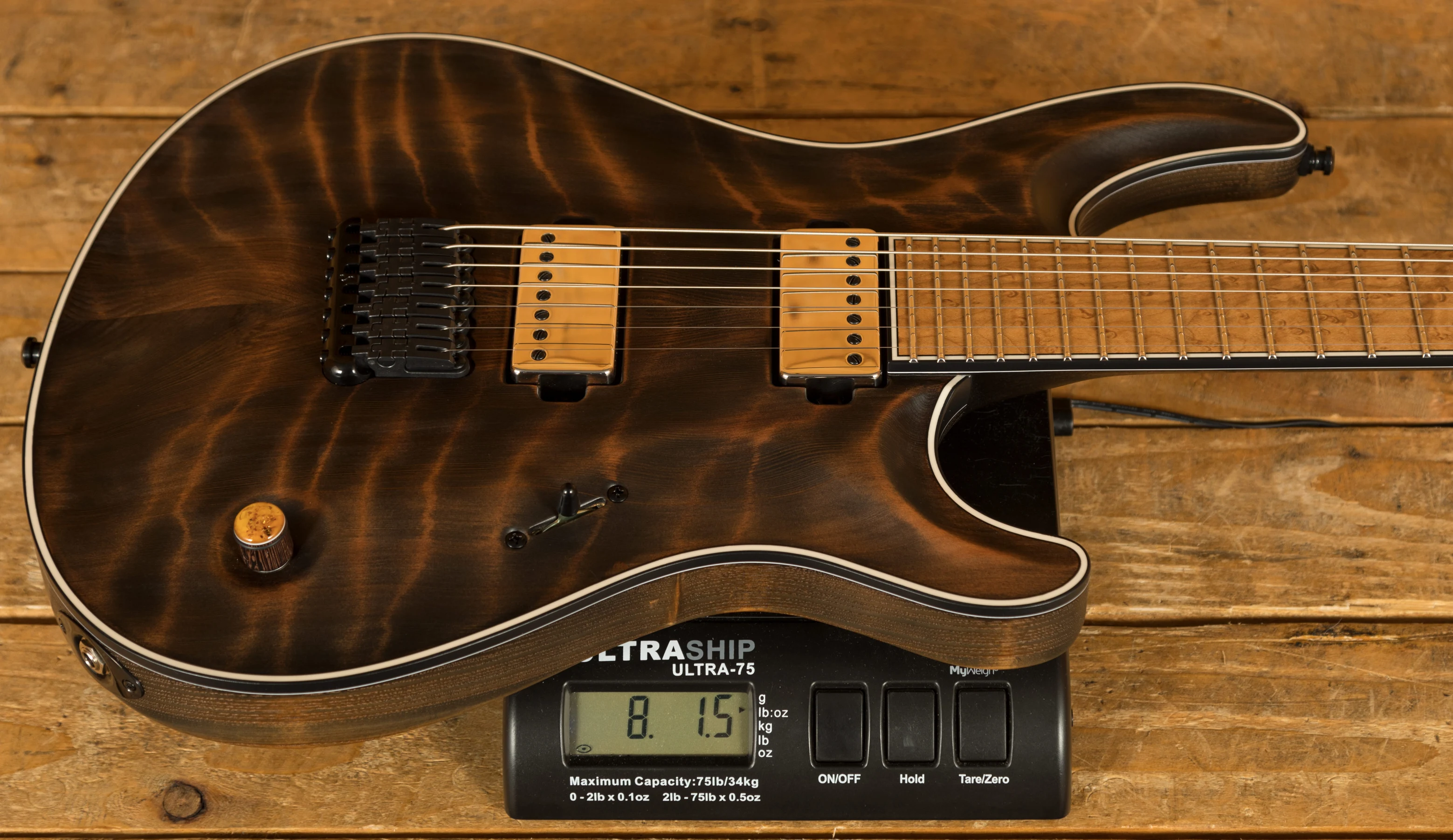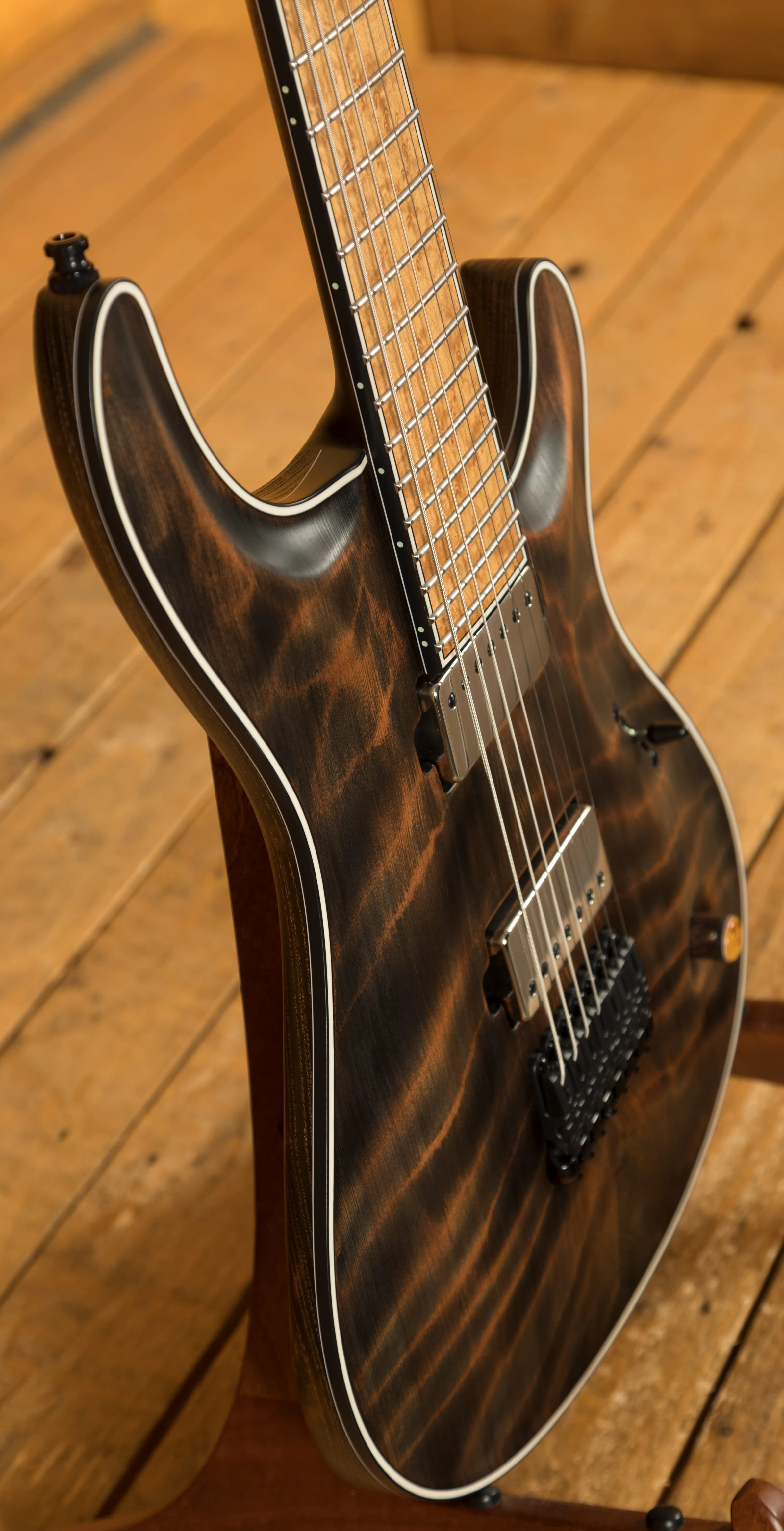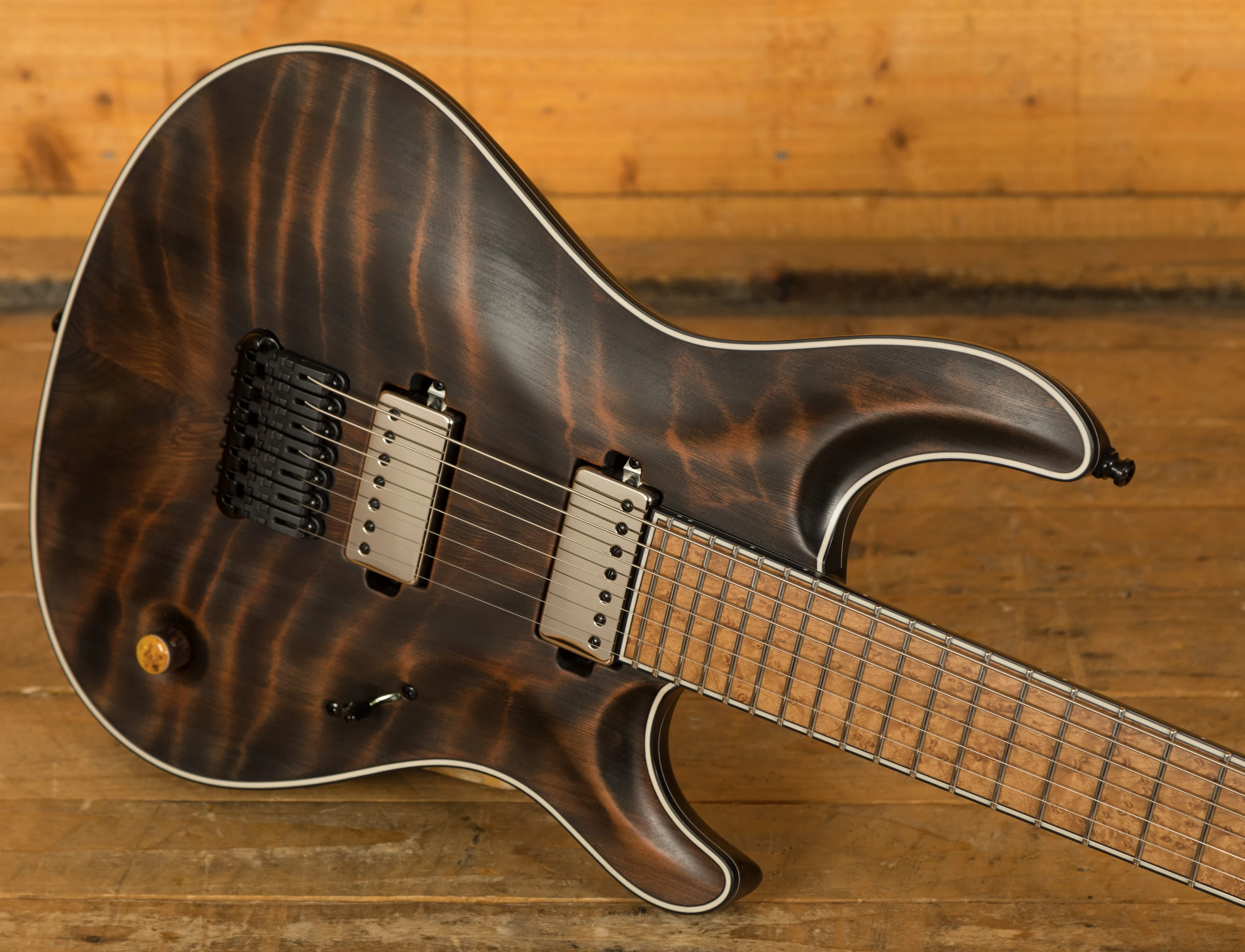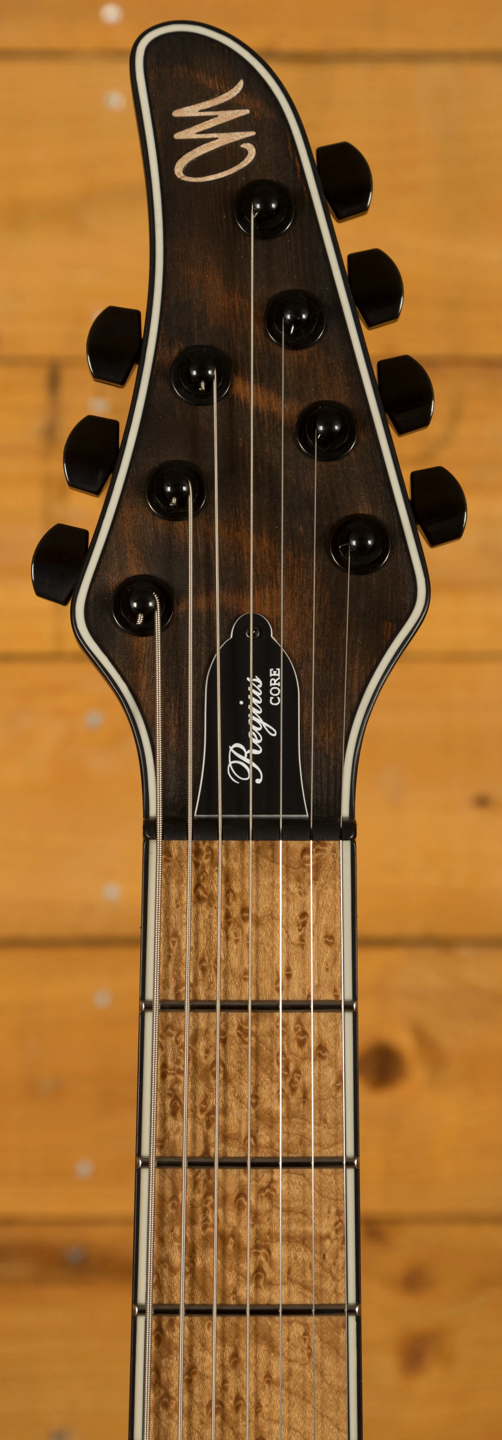 With a Tonally Enhanced American Ash body, the Regius benefits from a gorgeous Curly Redwood top with an Antique Black Matte finish which allows you to really appreciate the quality of the top. The TEW process adds incredible resonance and stability to this guitar, it's these little extra details that make Mayones guitars so desirable. It's beautifully poised, balanced and allows great access right up the neck.