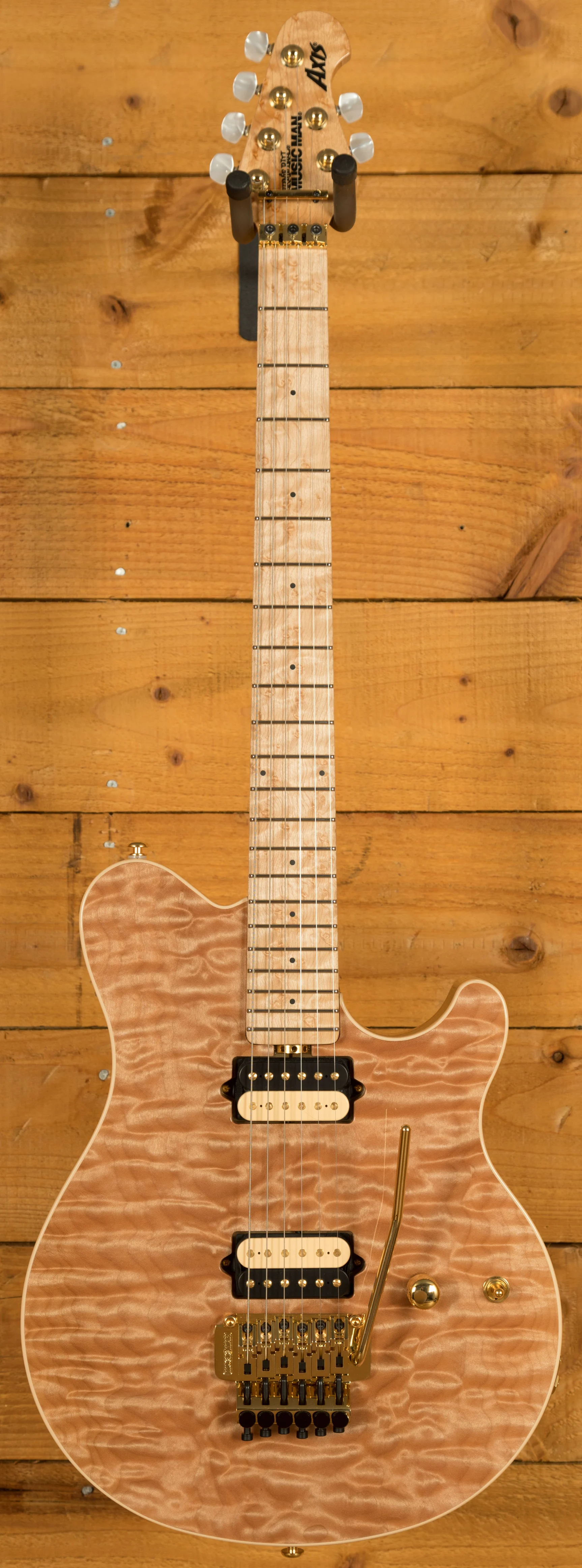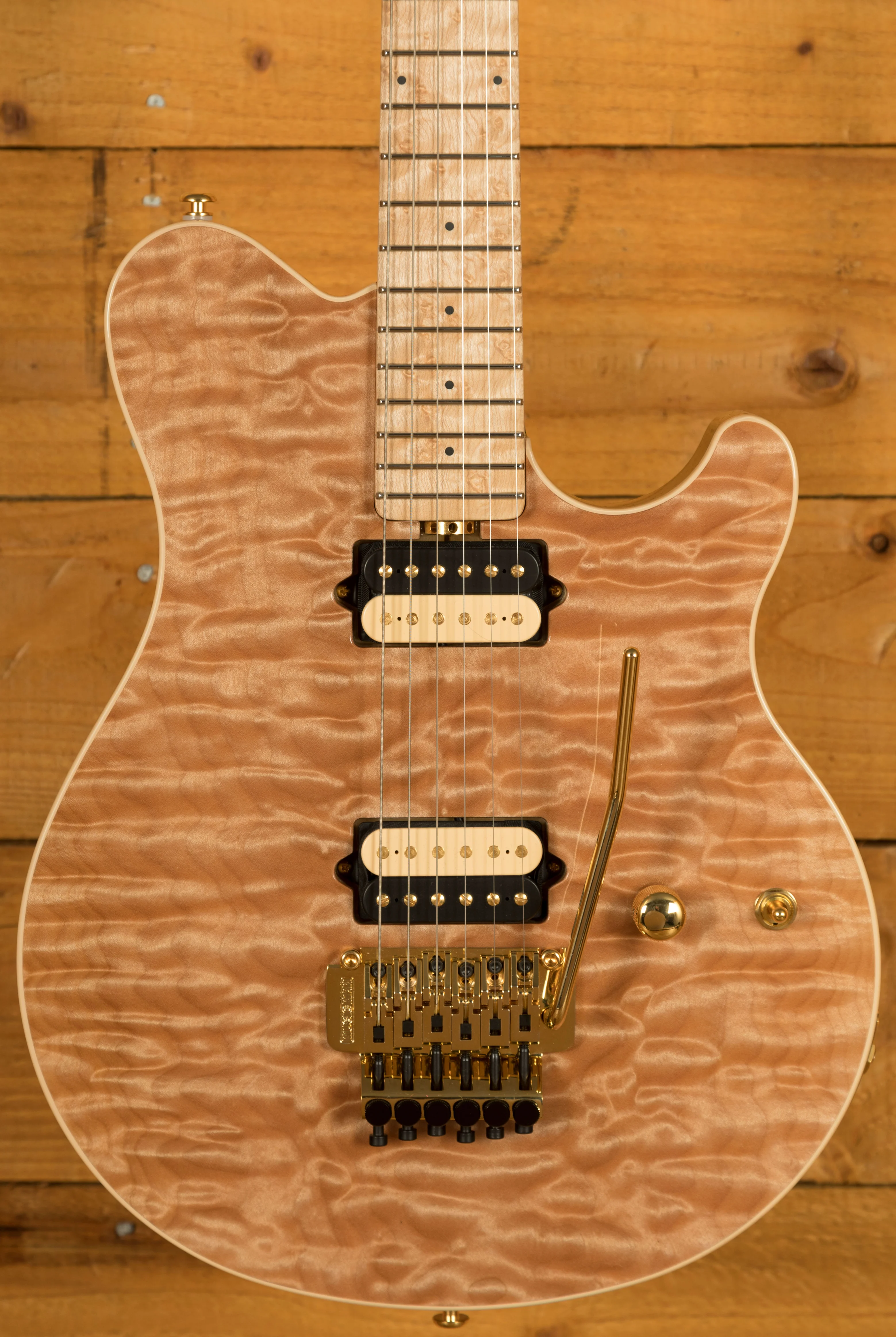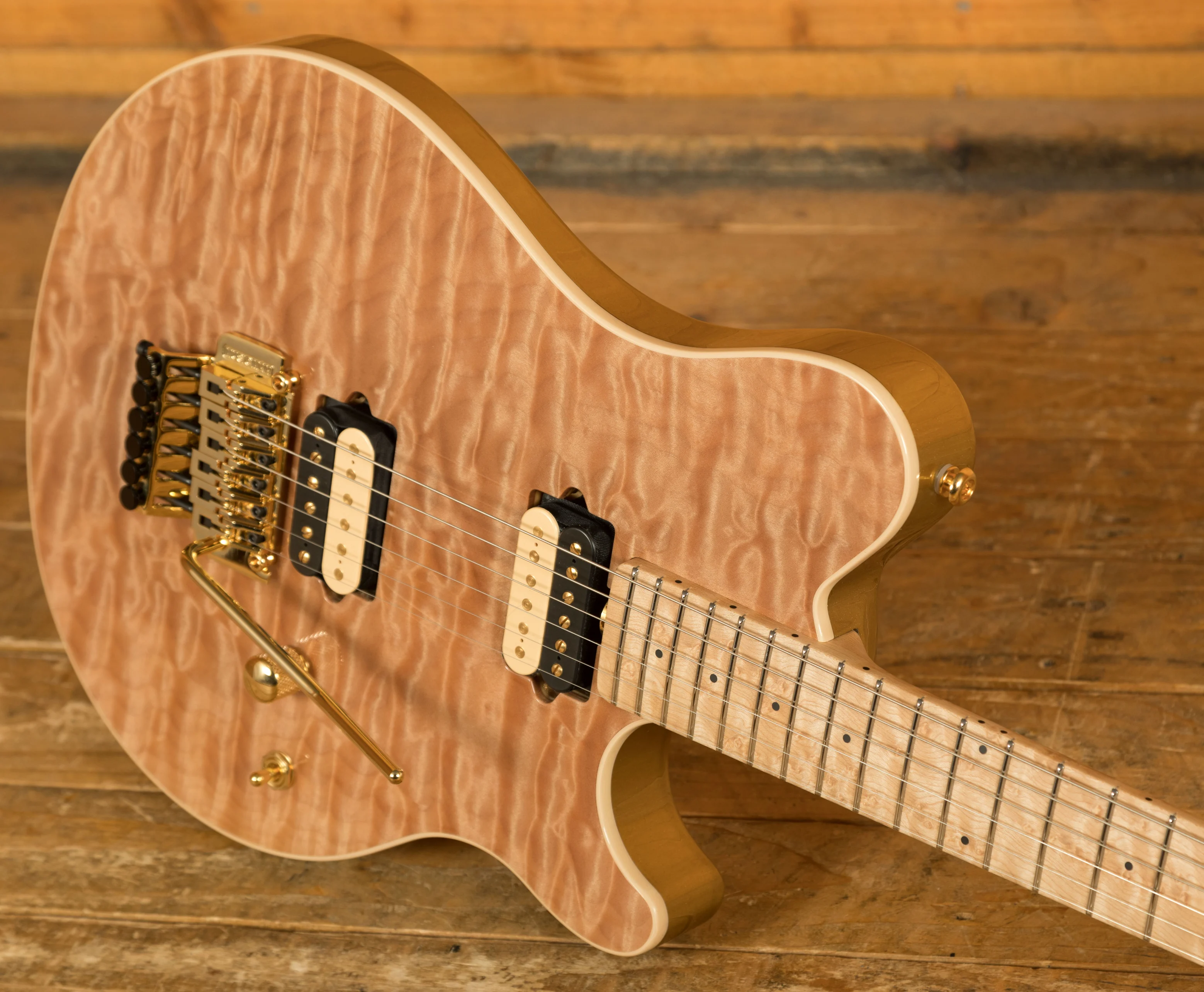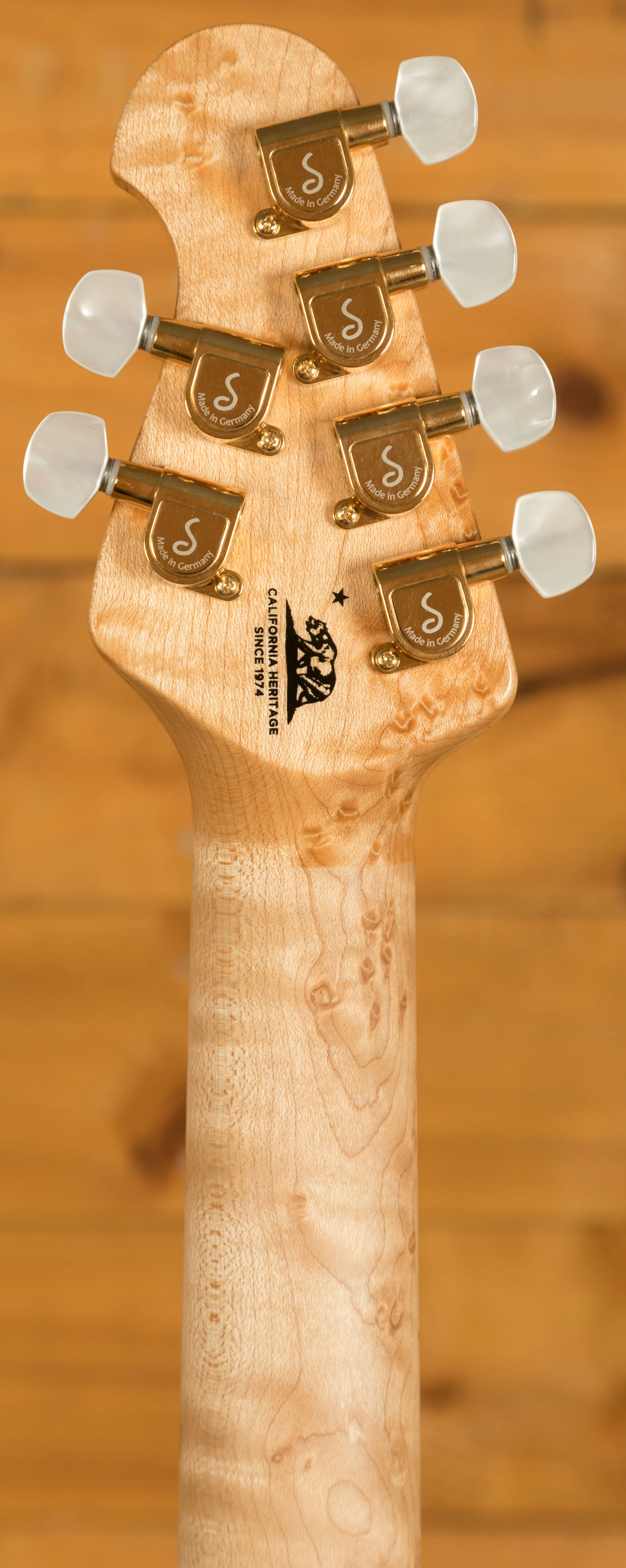 At the core of this instrument is a basswood body topped with a one-piece quilt maple cap, carefully chosen for its striking figure and tonal balance. Unlike bookmatched tops, the one-piece construction offers a seamless, continuous grain pattern that enhances both aesthetics and resonance. The back of the body is custom finished and colour-matched to the translucent top, creating a cohesive and premium look. Paired with Music Man's double-locking tremolo system with fine tuners, players can achieve expressive pitch control while maintaining rock-solid tuning stability.