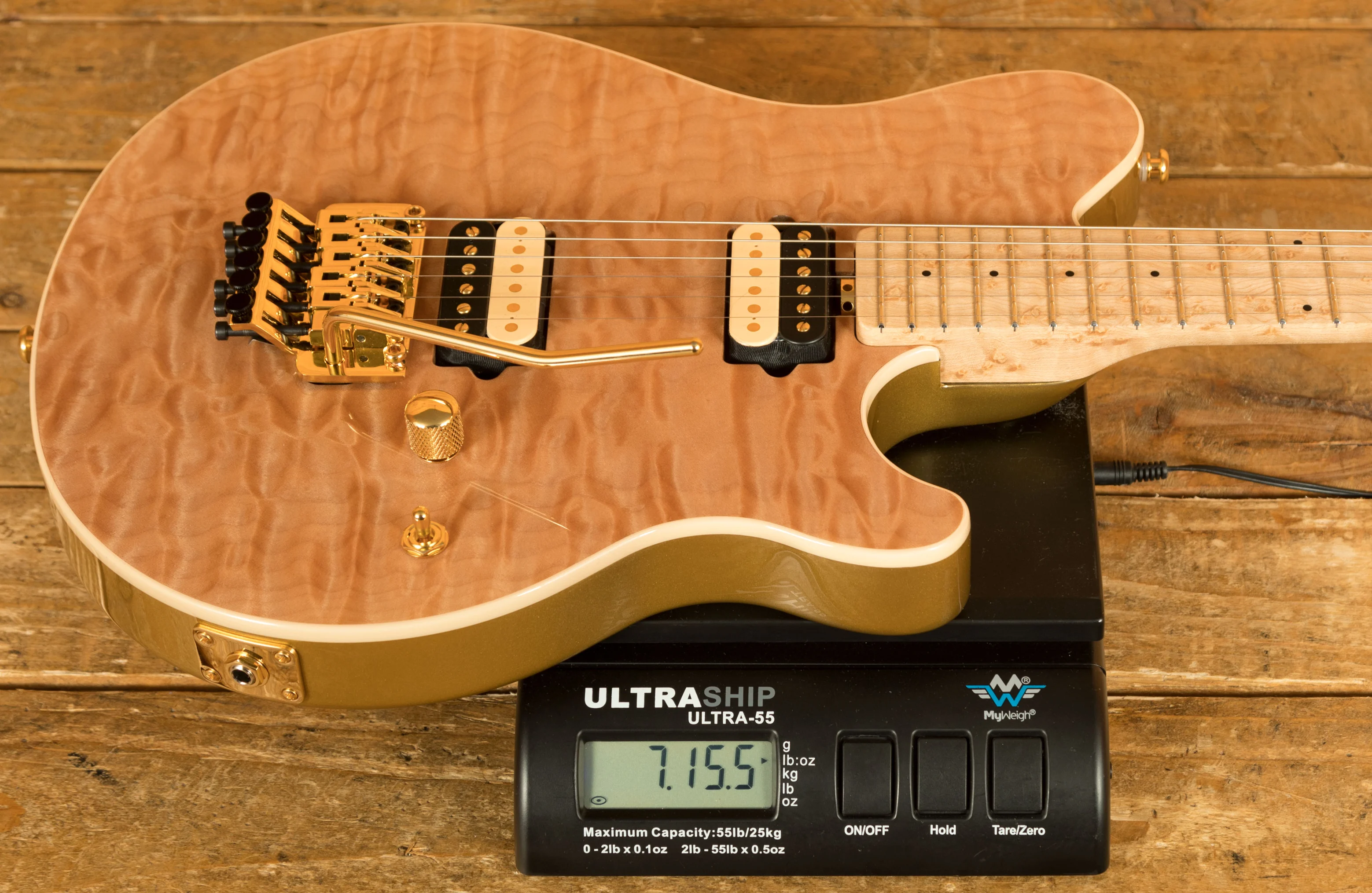 The neck and fingerboard are crafted from figured birdseye maple, delivering a unique visual character and exceptional playability. The asymmetrical neck profile is specifically designed for comfort, allowing effortless movement across the 25.5" scale length and 10" radius fingerboard. 22 high-profile, medium-width stainless steel frets provide long-lasting durability and smooth bending, while the sculpted 5-bolt neck joint ensures unhindered access to the upper frets. The gunstock oil and hand-rubbed wax finish add a natural, fast-playing feel that many players prefer over thicker lacquer finishes. Schaller M6LA tuners with pearl buttons complete the setup, offering reliable tuning and a refined aesthetic.