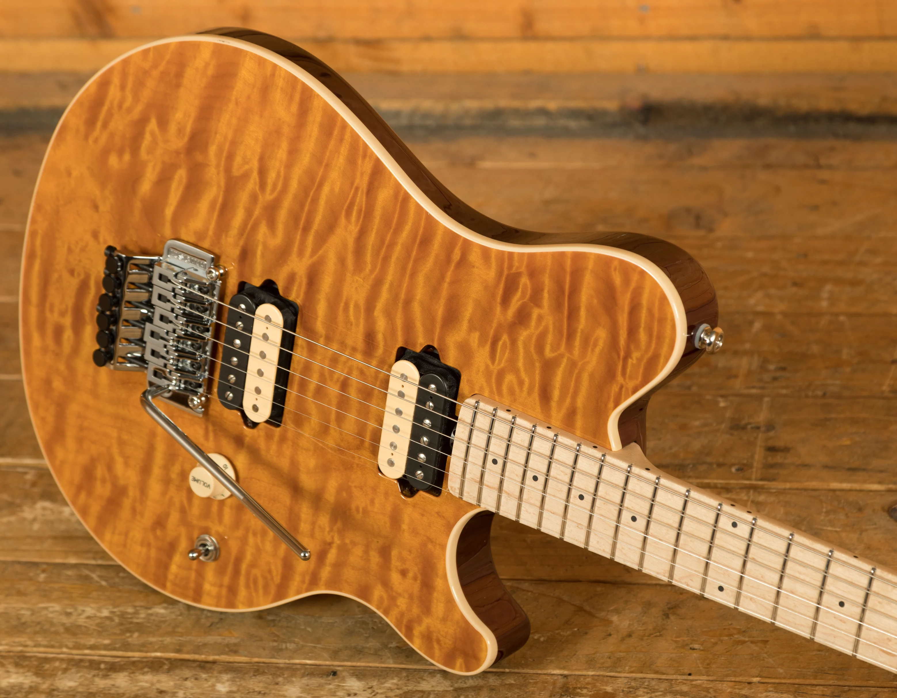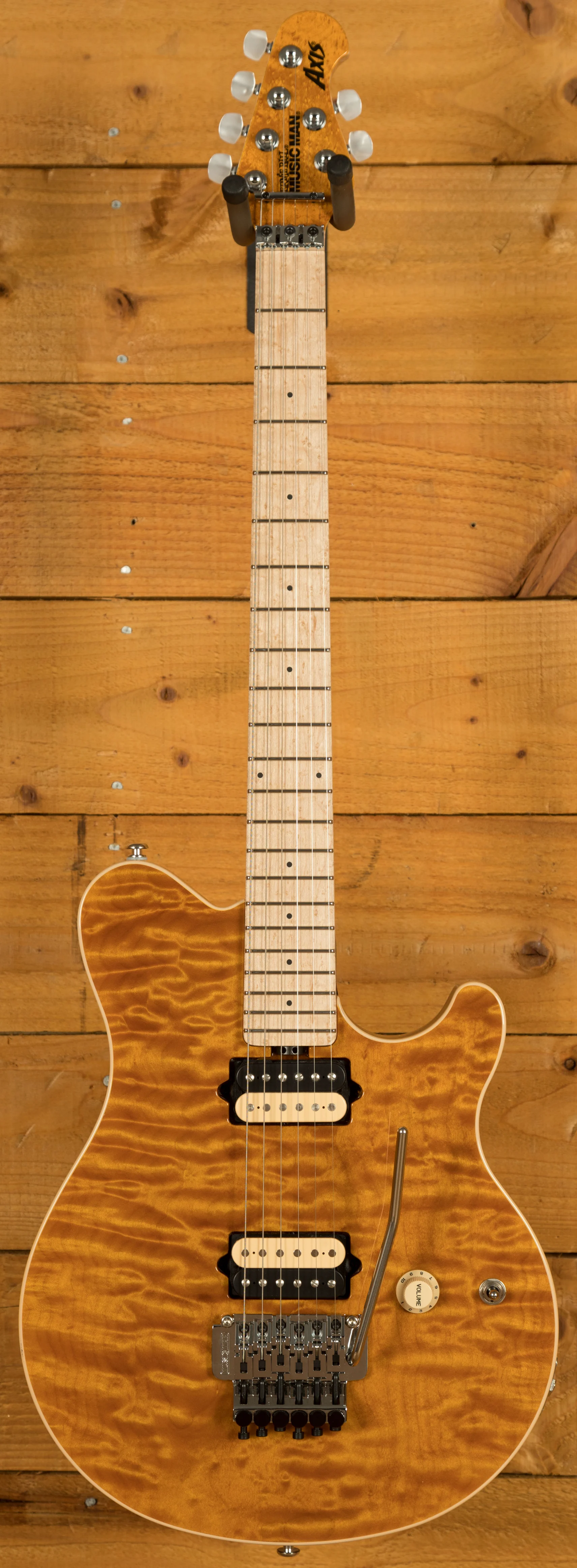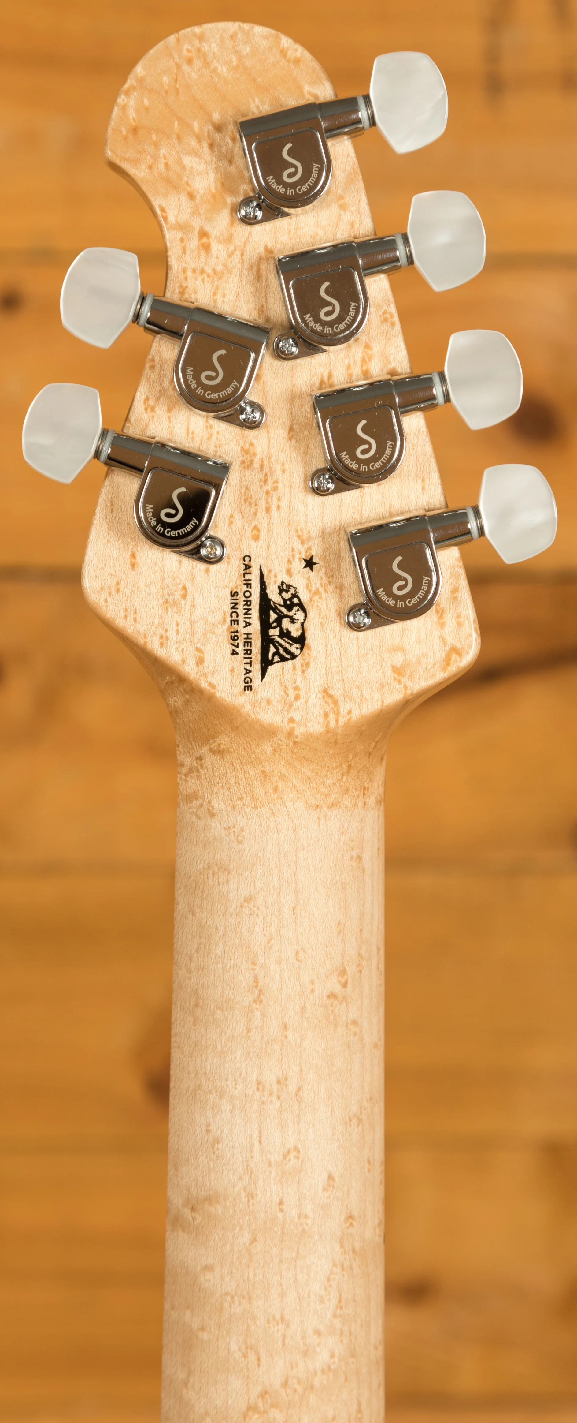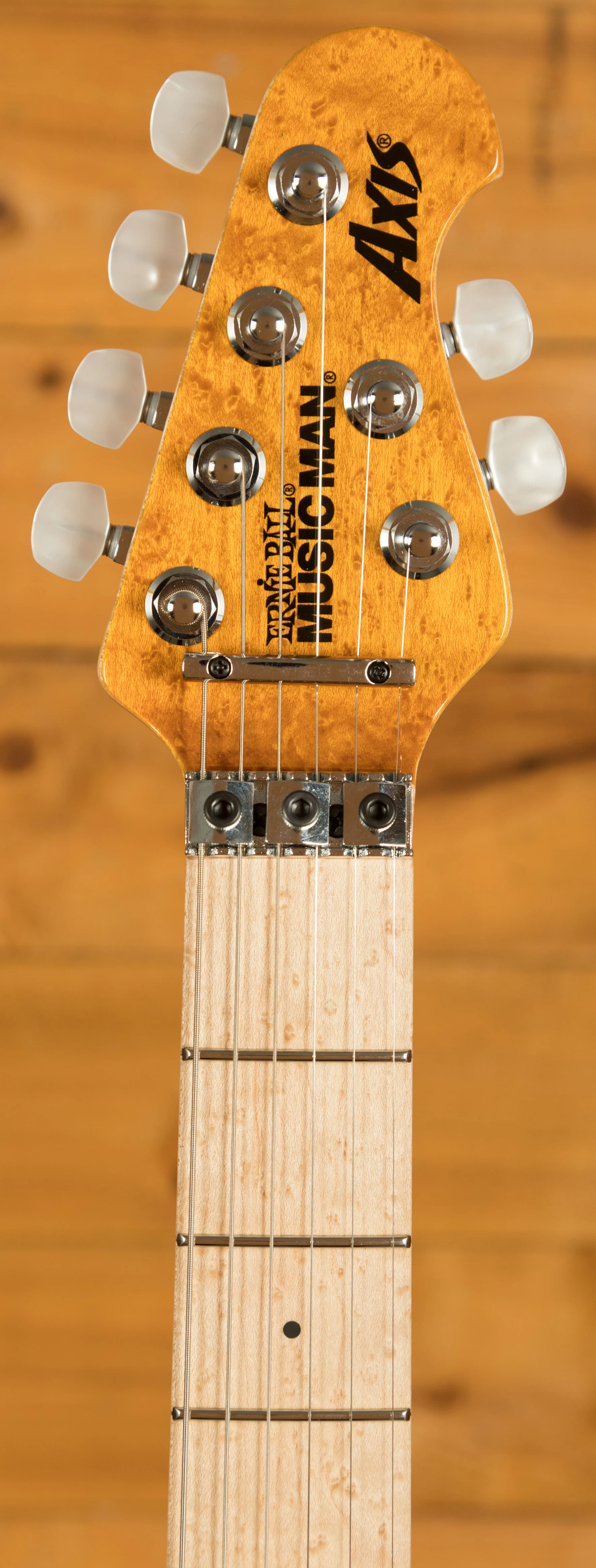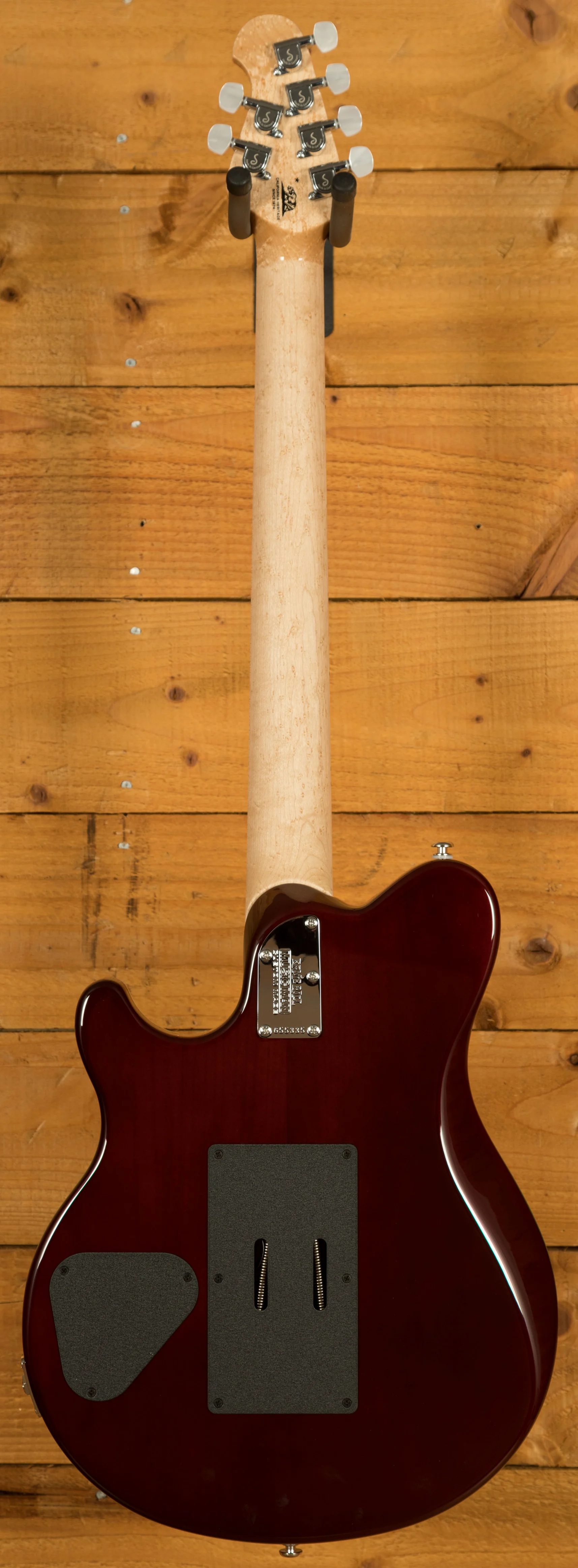 At the core of this instrument is a basswood body topped with a one-piece quilt maple cap, carefully chosen for its striking figure and tonal balance. Unlike bookmatched tops, the one-piece construction offers a seamless, continuous grain pattern that enhances both aesthetics and resonance. The back of the body is custom finished and colour-matched to the translucent top, creating a cohesive and premium look. Paired with Music Man's double-locking tremolo system with fine tuners, players can achieve expressive pitch control while maintaining rock-solid tuning stability.