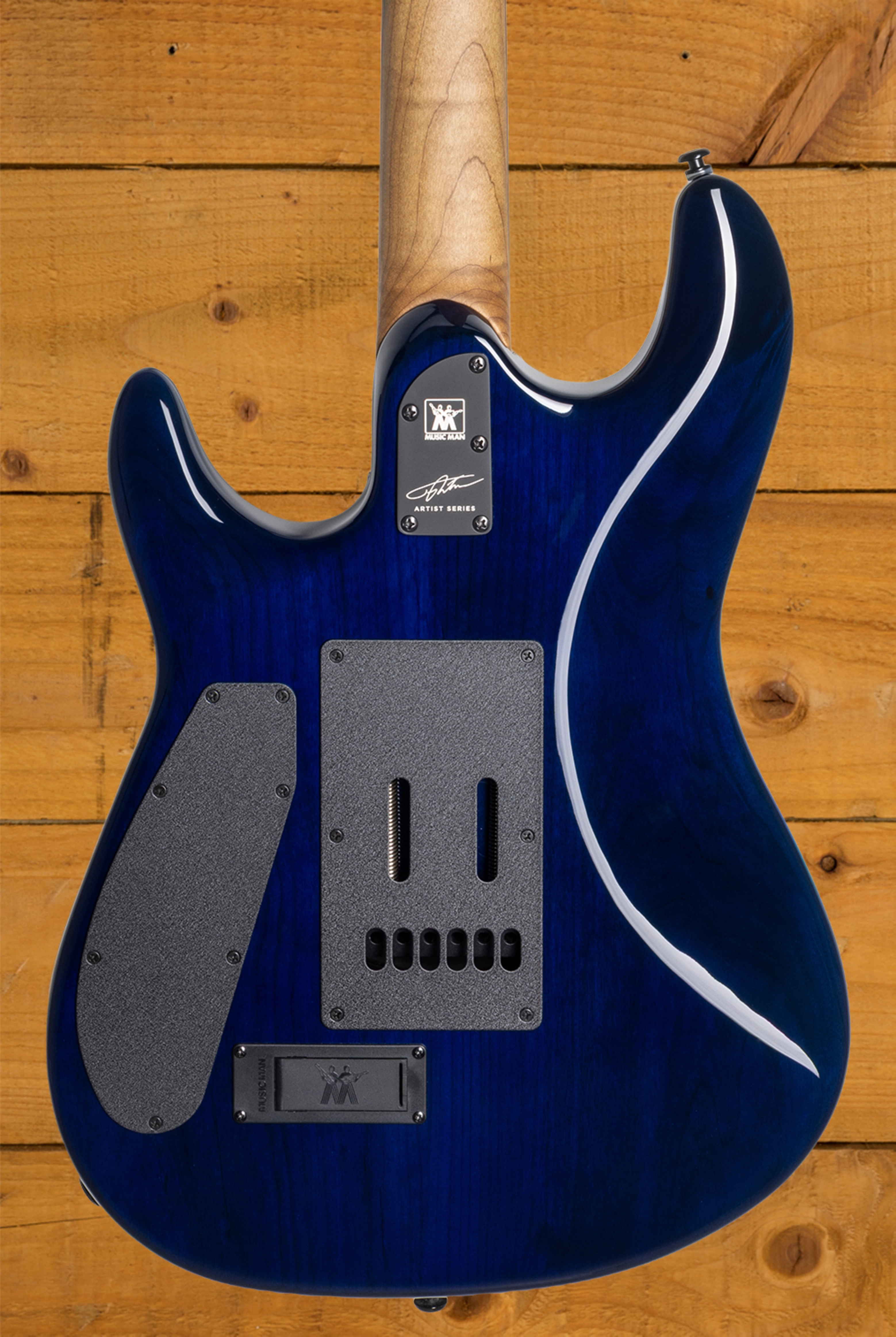 This guitars neck is crafted from Figured Maple which has been roasted for extra stability. The roasting process also helps to give the neck a unique darker colour, which really compliments the blue body. It features a Flat/Thin C neck shape, which feels great in your hands, it offers fast, modern playability with exceptional comfort. The back of the neck also features Music Man’s gunstock oil and hand-rubbed wax finish, which feels smooth and broken in straight out of the case. The Ebony fingerboard is dark in colour and features a 25.5” scale length, 24 stainless steel frets, 15” radius, 1.6875” nut width, and white dot inlays.