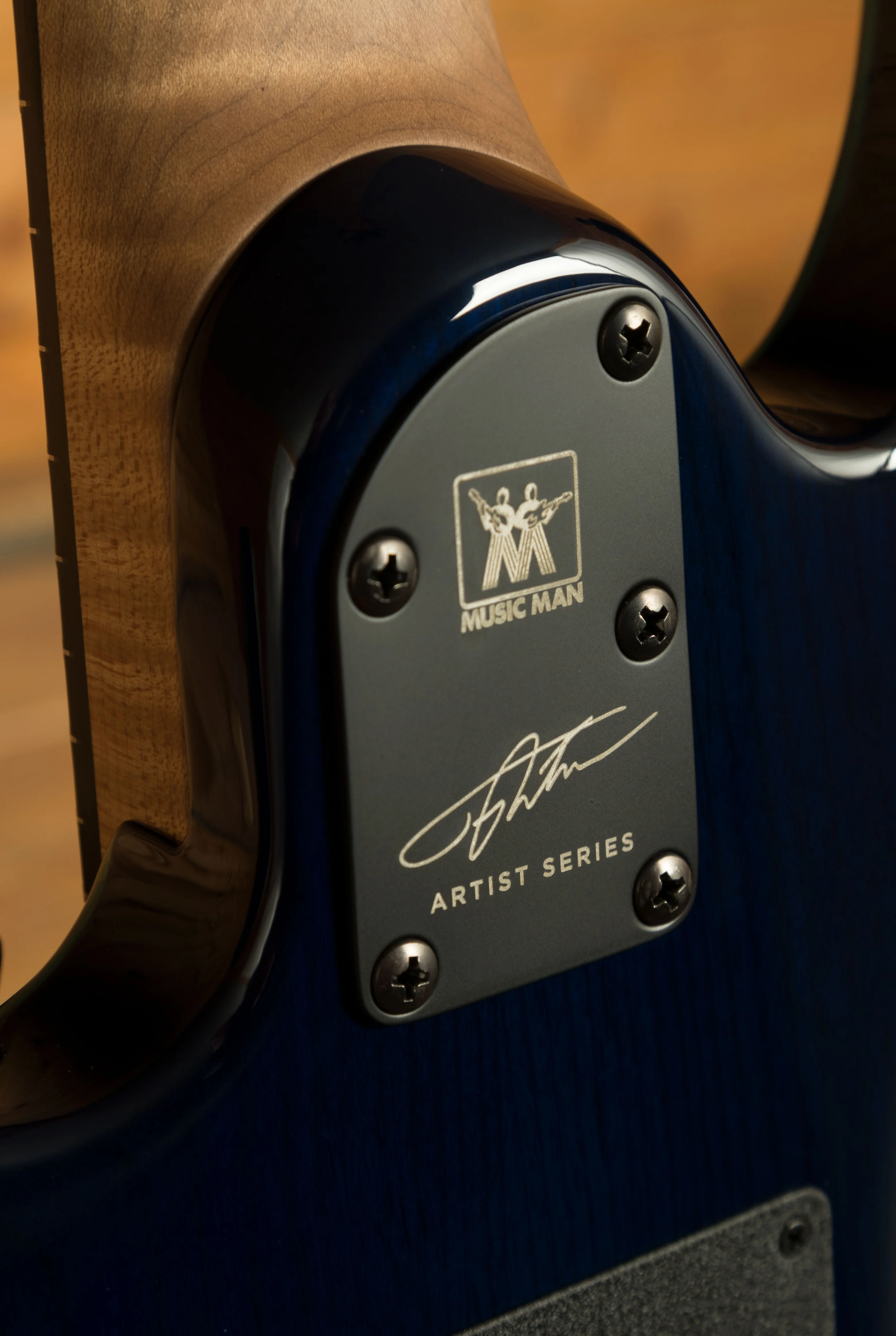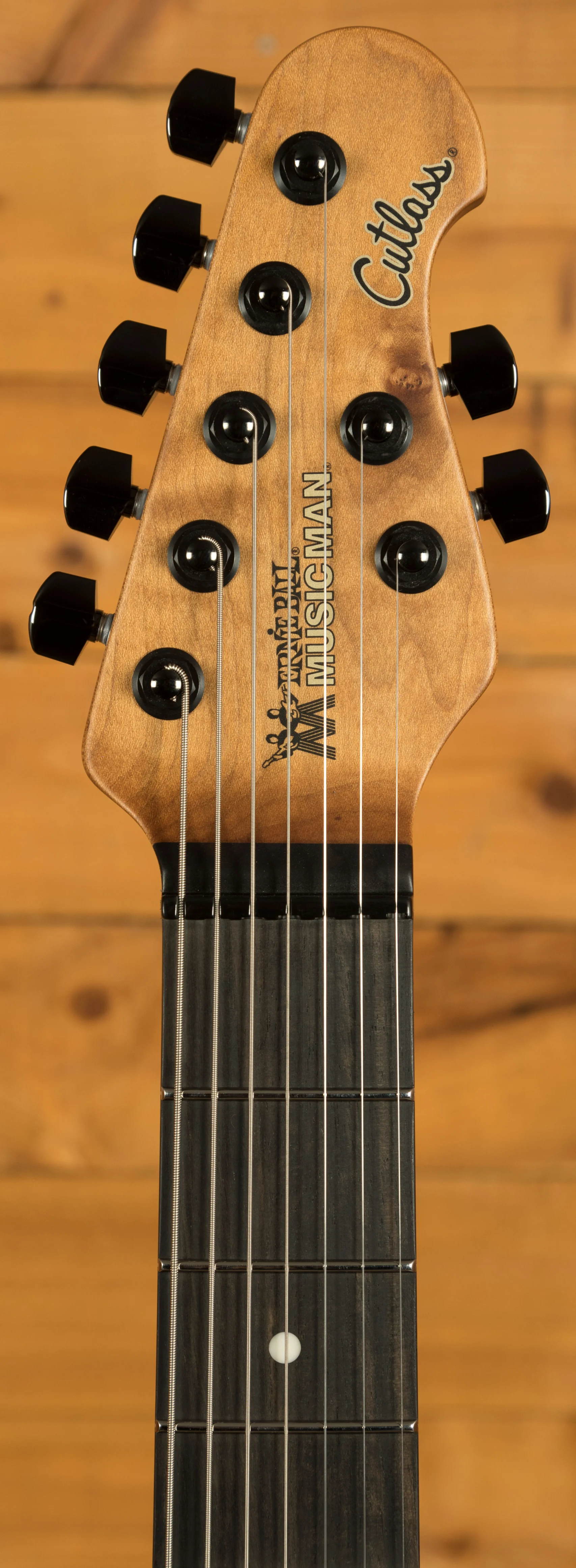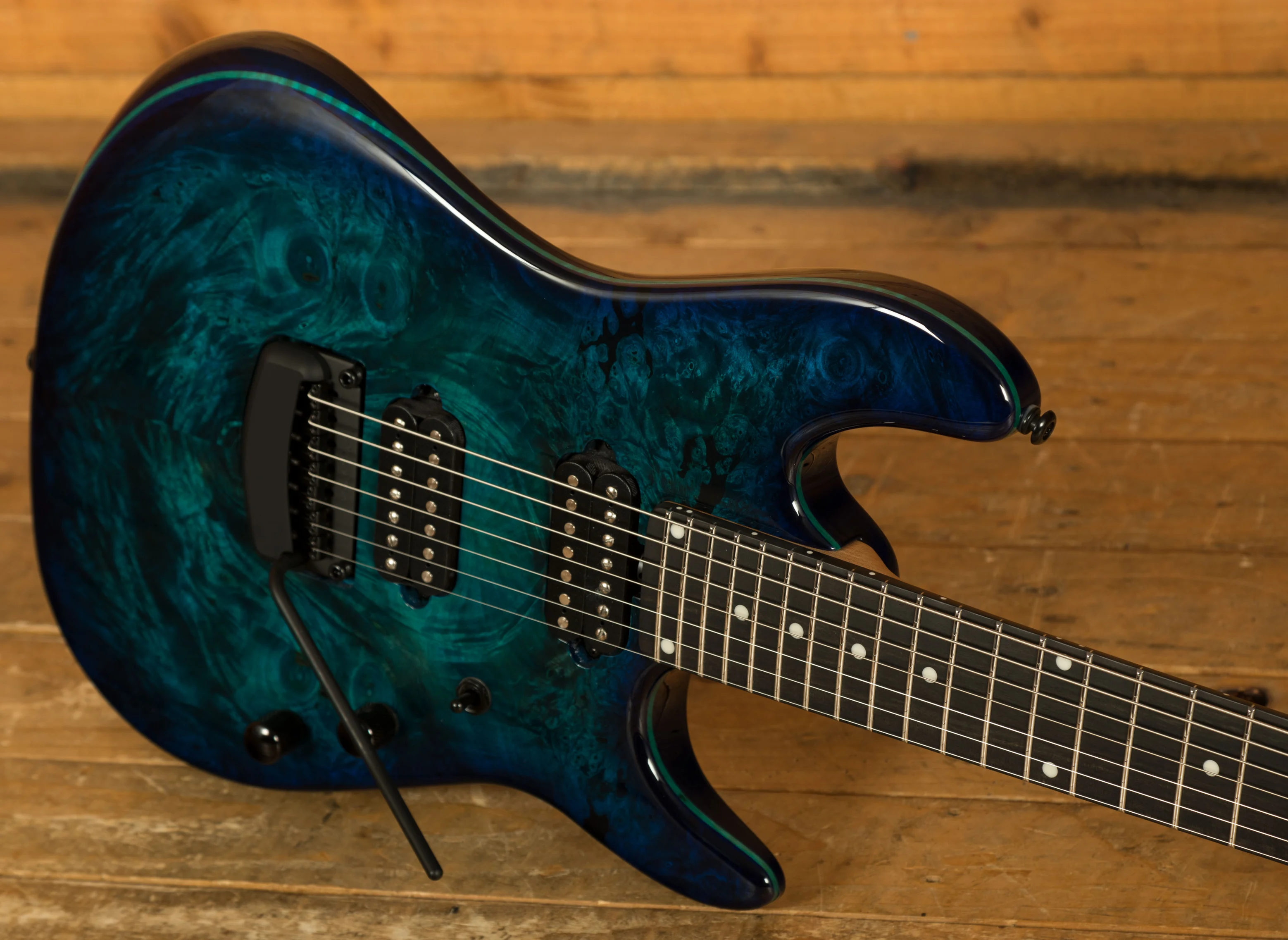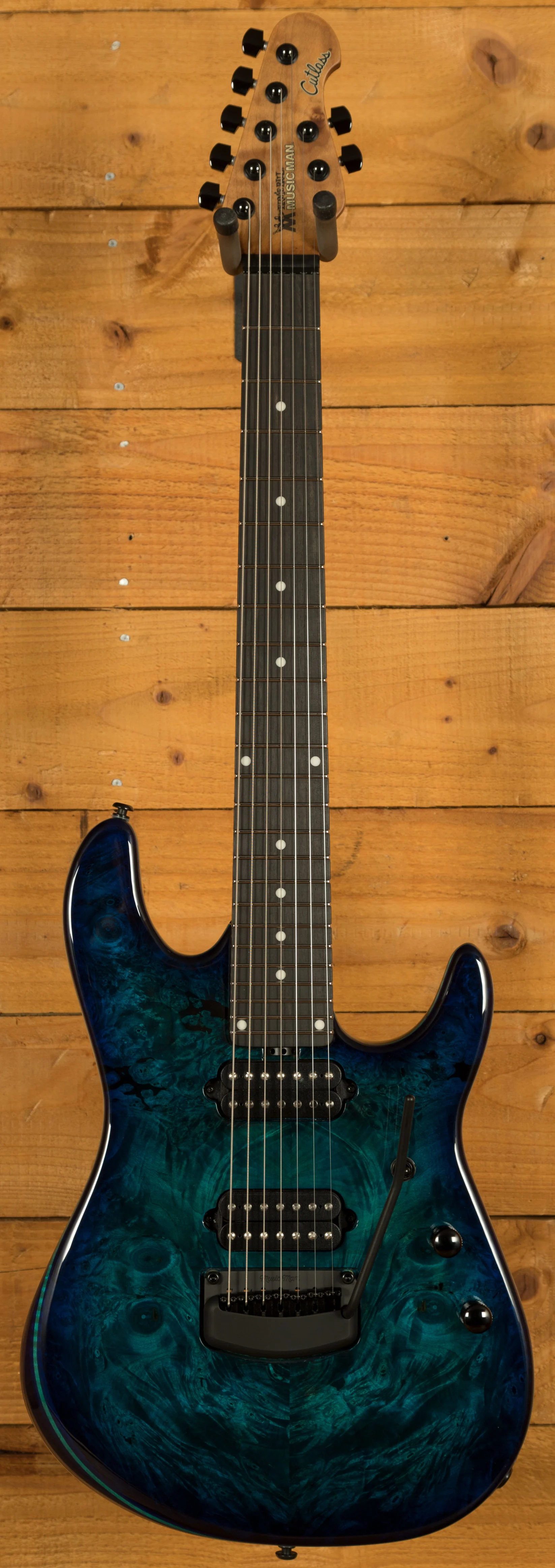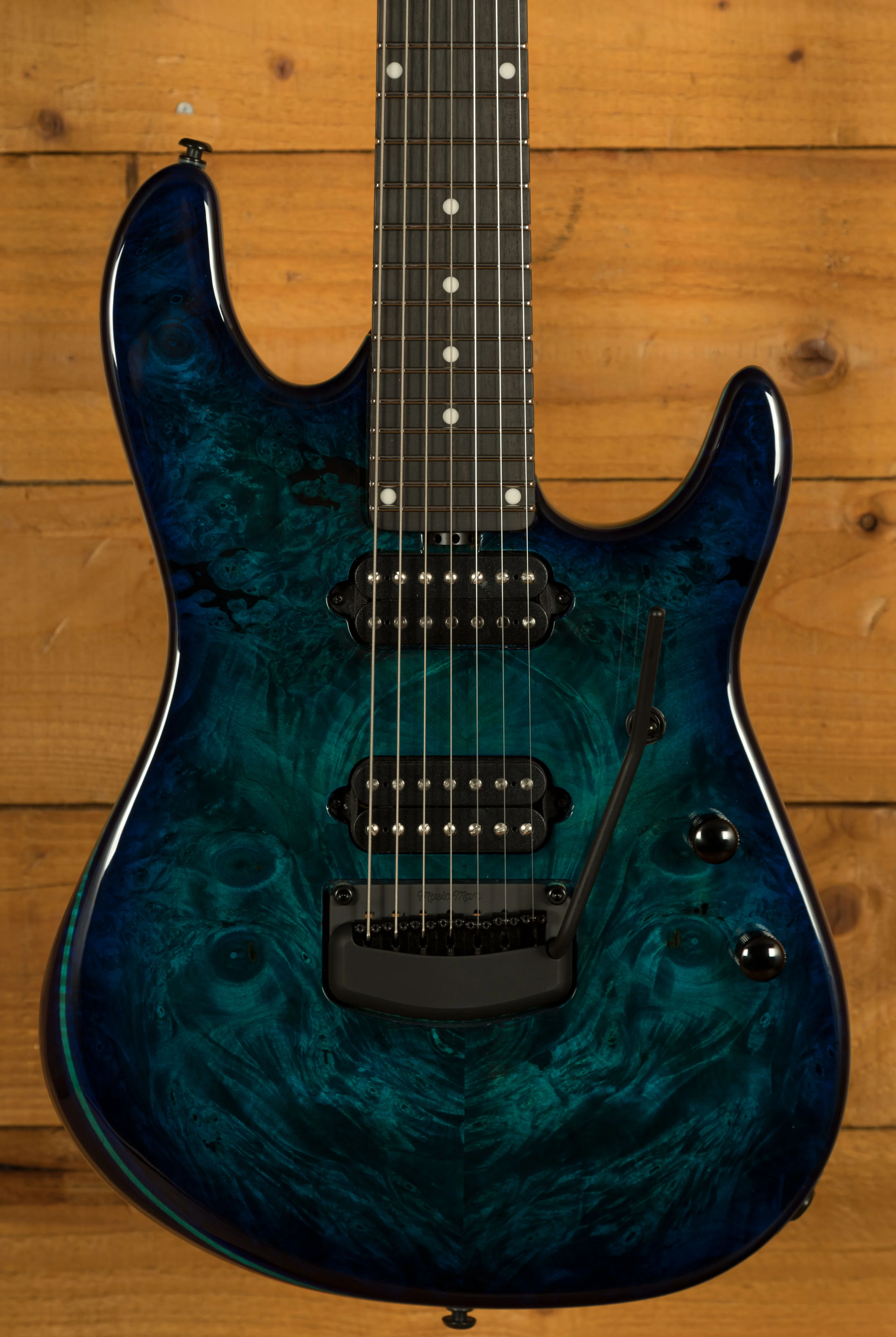 The body itself is a crafted from Alder, and features a truly stunning Buckeye Burl top. Each top is personally checked and approved by the Music Man team when they receive a delivery from their supplier, ensuring only the finest pieces are used to make a Music Man instrument. The top itself is stained with a deep “Water Temple” blue colour, which really highlights the awesome figuring within the Buckeye Burl. The finish itself is high gloss poly, which does a great job at protecting the body. As the Cutlass is a double cutaway design, this guitar gives you great access to all 24 frets, this was a really important part of the design process.