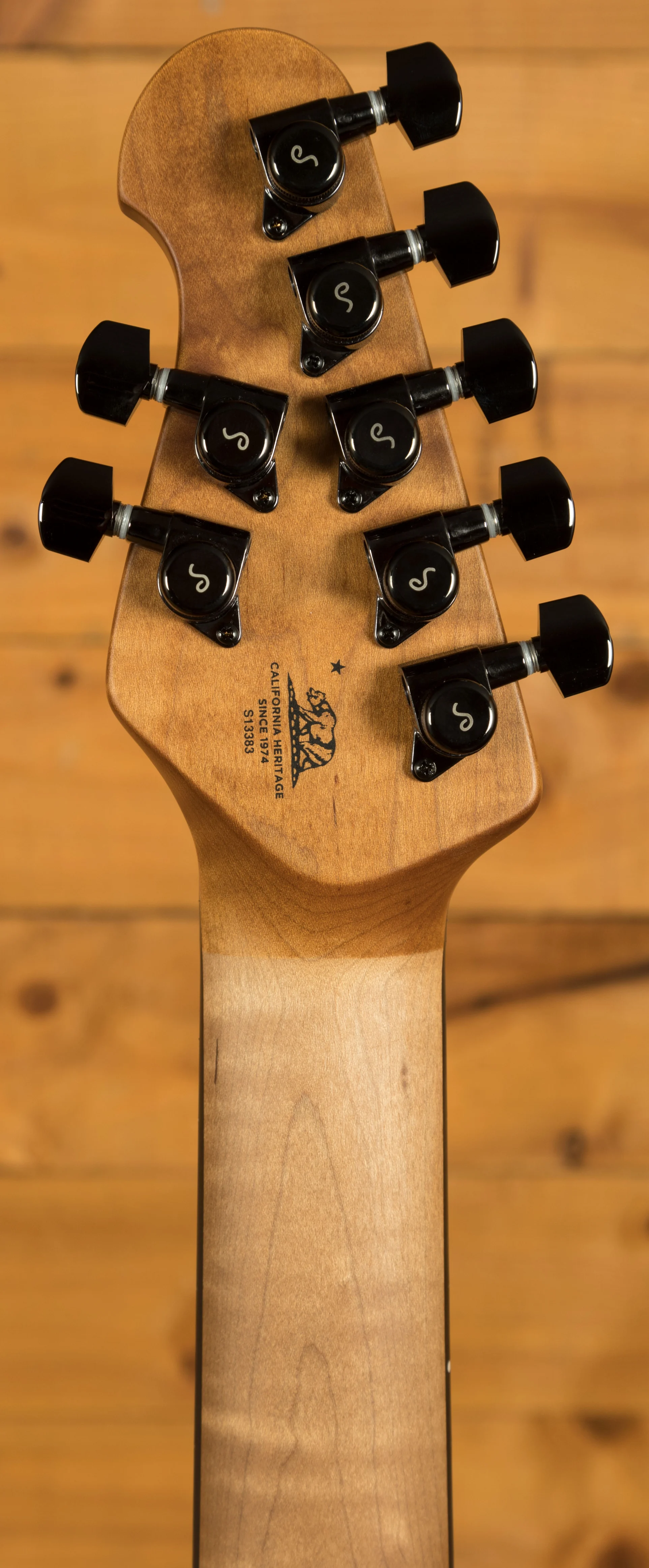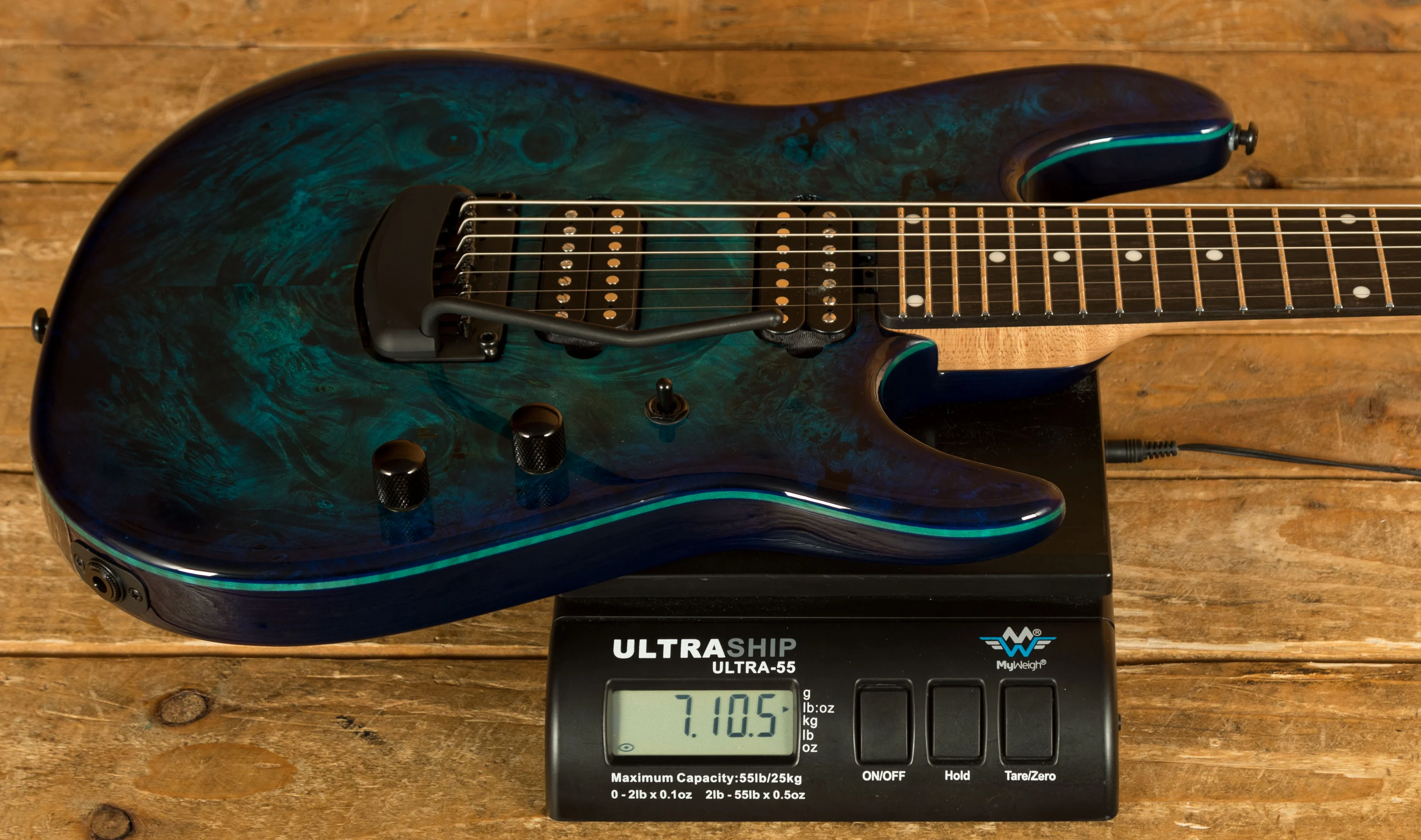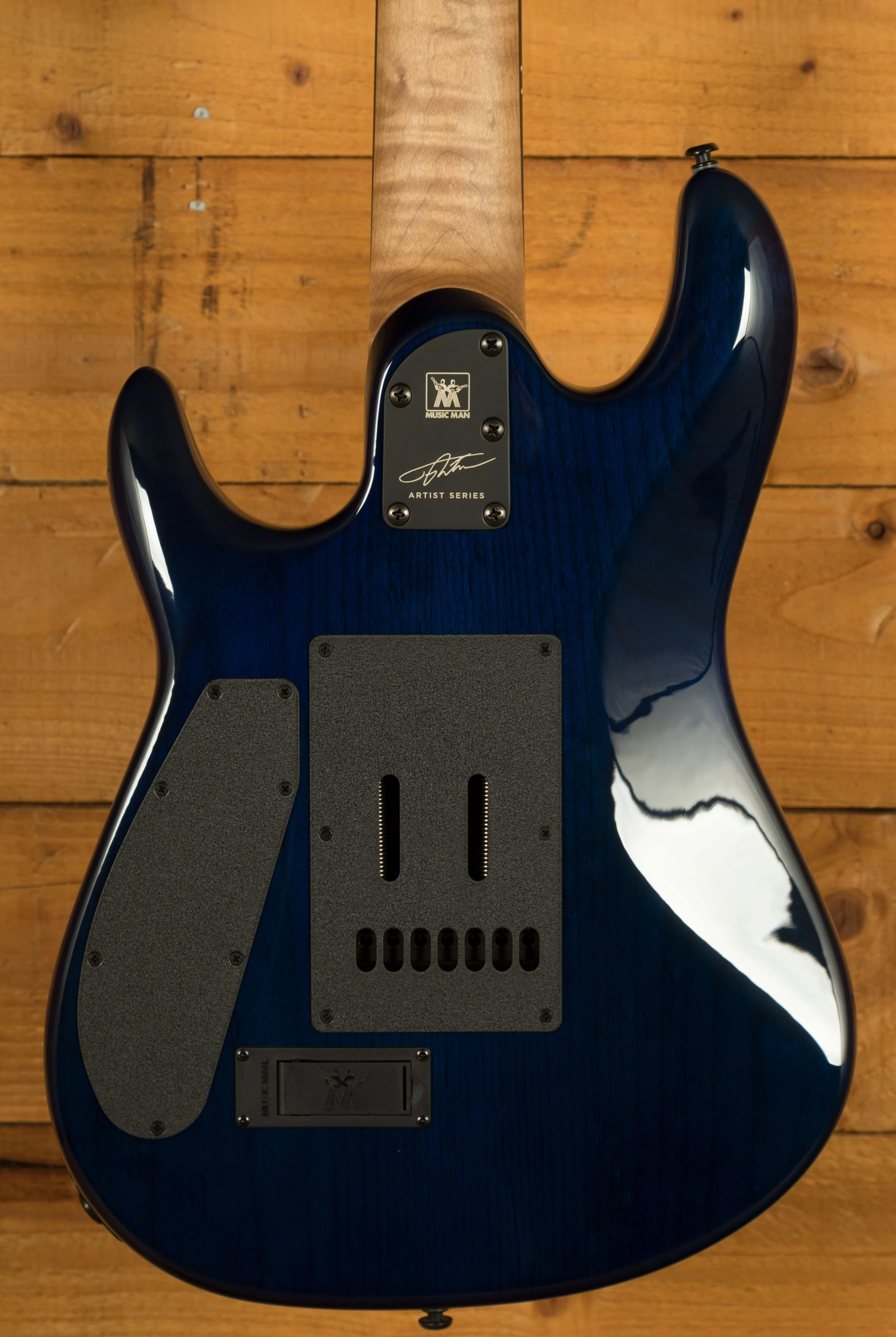 This guitars neck is crafted from Figured Maple which has been roasted for extra stability. The roasting process also helps to give the neck a unique darker colour, which really compliments the blue body. It features a Flat/Thin C neck shape, which feels great in your hands, it offers fast, modern playability with exceptional comfort. The back of the neck also features Music Man’s gunstock oil and hand-rubbed wax finish, which feels smooth and broken in straight out of the case. The Ebony fingerboard is dark in colour and features a 25.5” scale length, 24 stainless steel frets, 15” radius, 1.875” nut width, and white dot inlays.